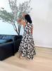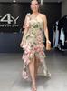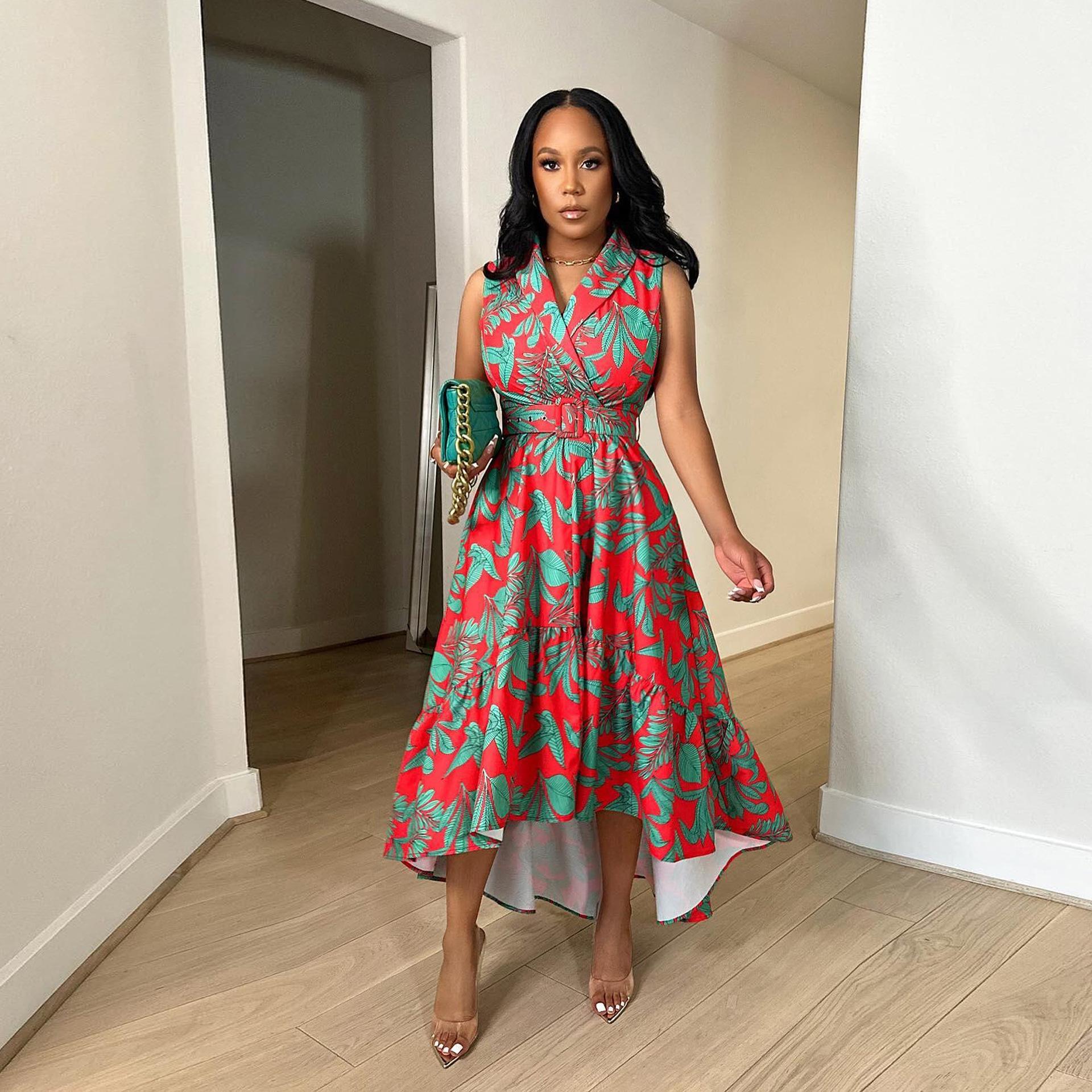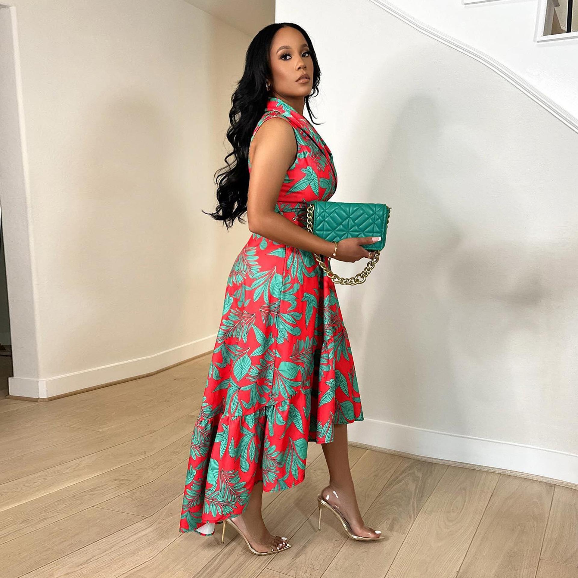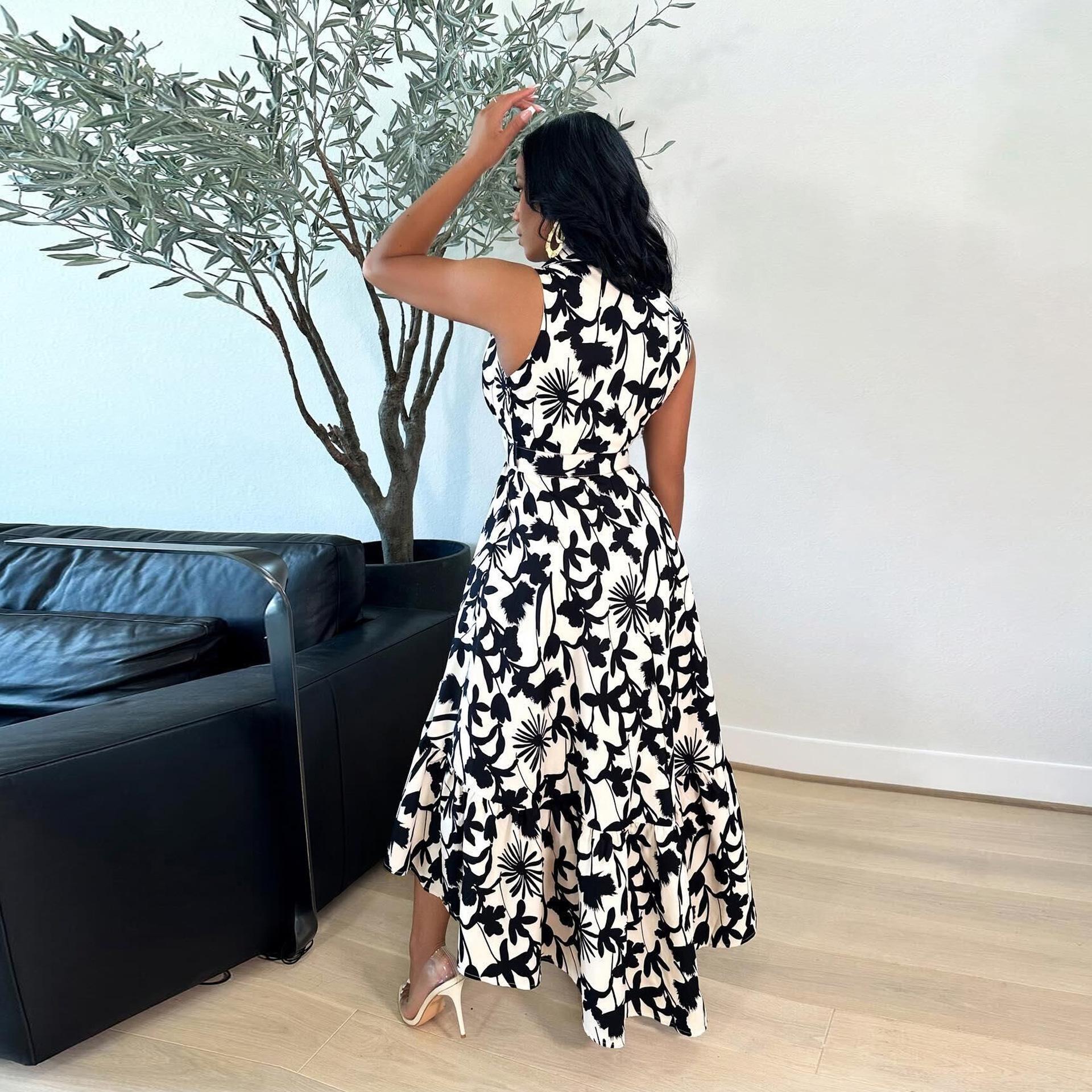 2024 Nuevo Vestido de Moda Europea y Americana de Gran Tamaño sin Mangas con Volantes en la Cintura y Falda Grande Estampado