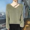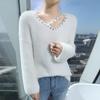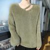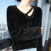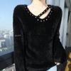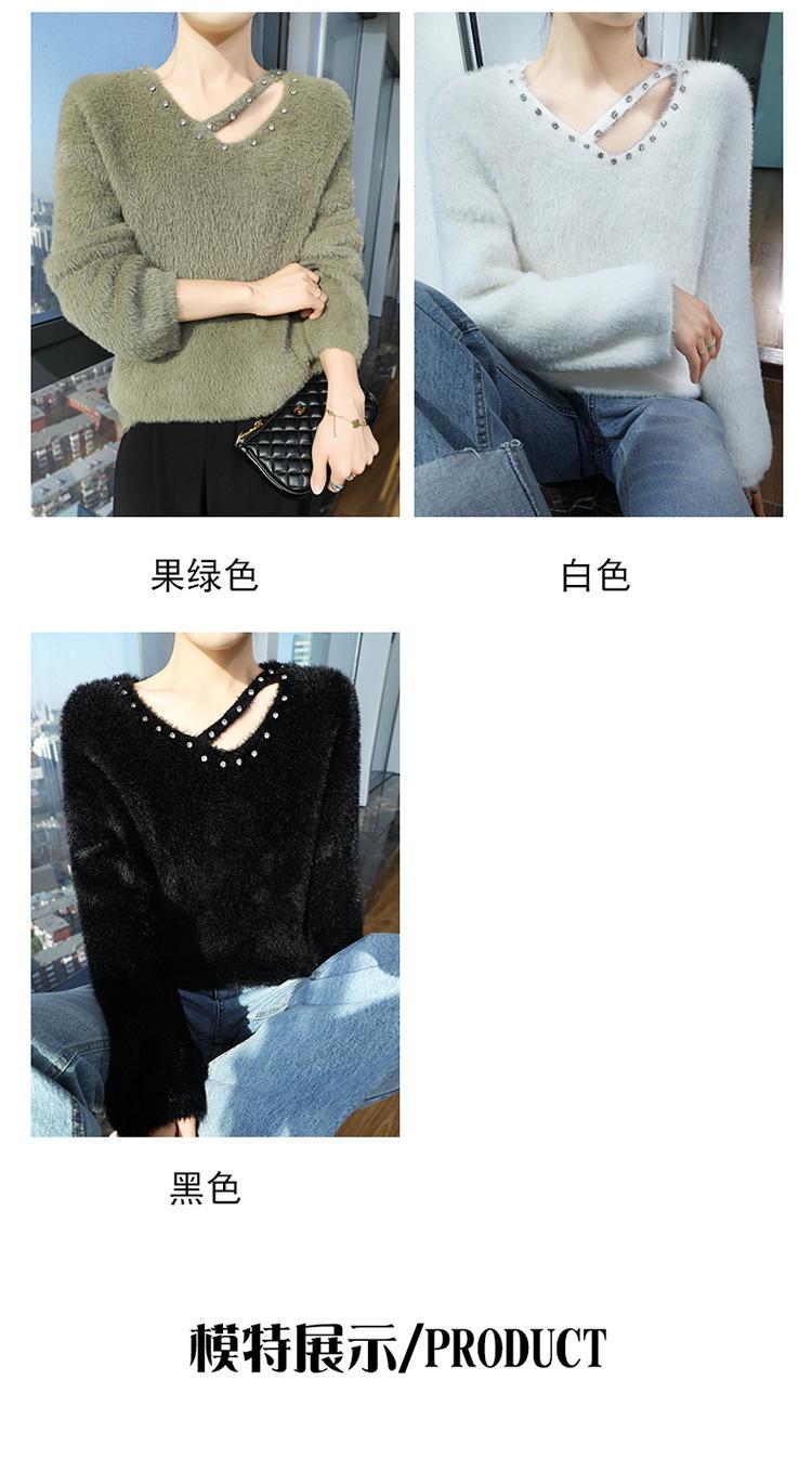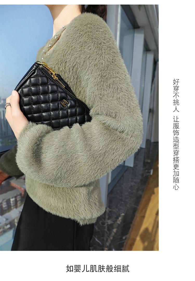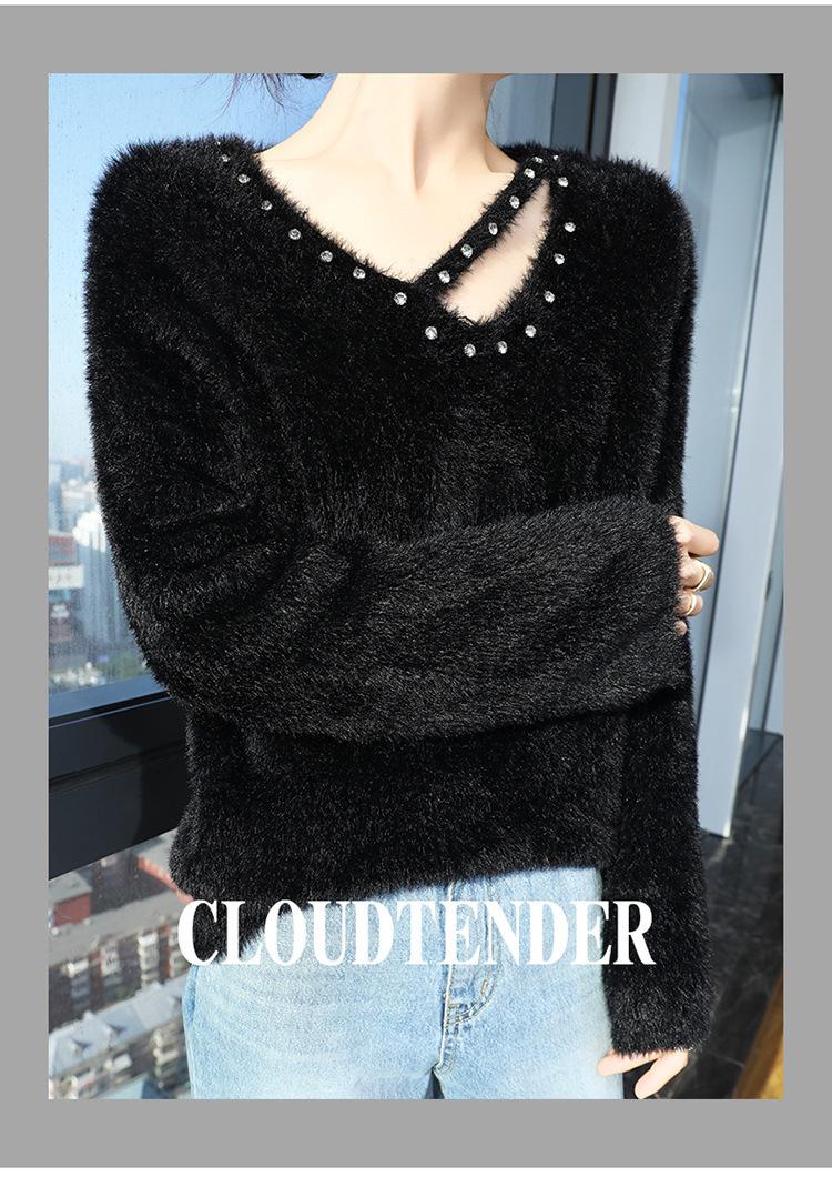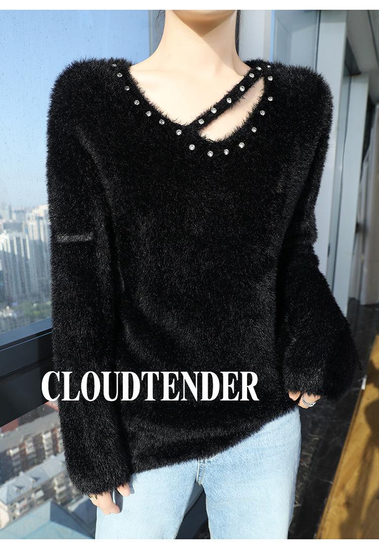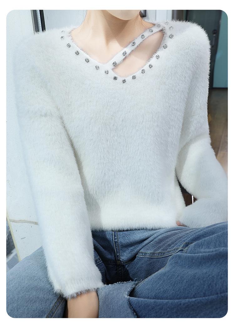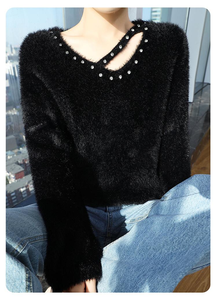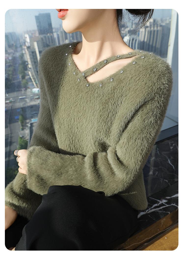 Suéter de punto suave y holgado de estilo perezoso, imitación de visón, cuello en V, uñas, suéter 2024, suelto y encerado, nuevo otoño invierno diamante