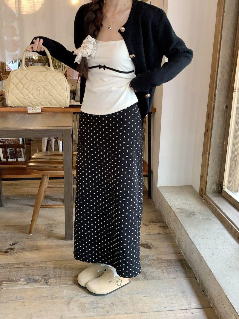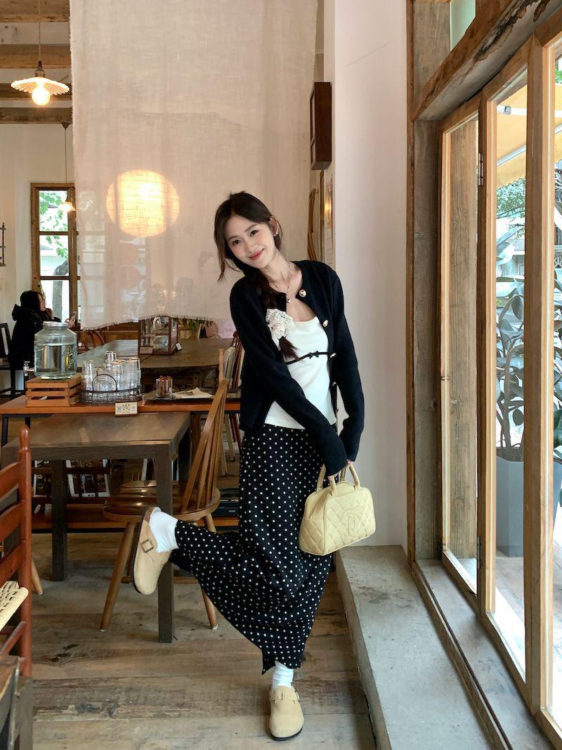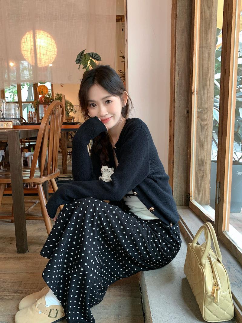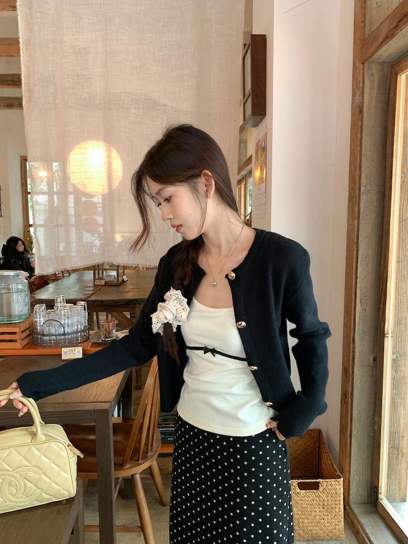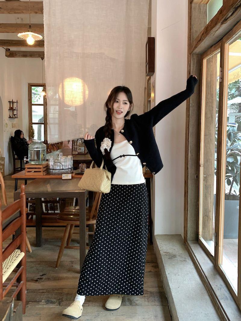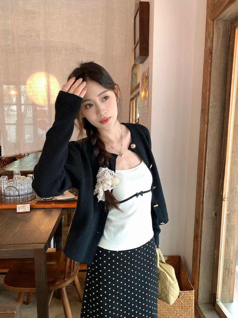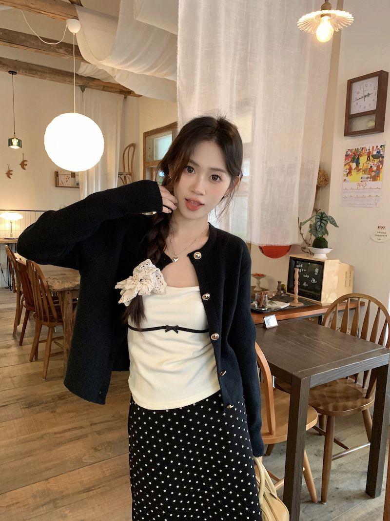 Polka dot skirt [flowers selected good quality], Black cardigan [flowers are selected with good quality], Cami...