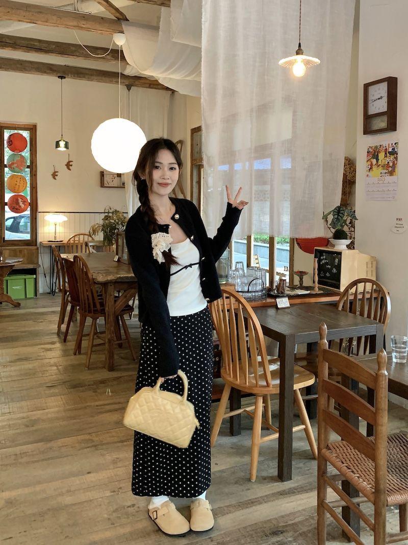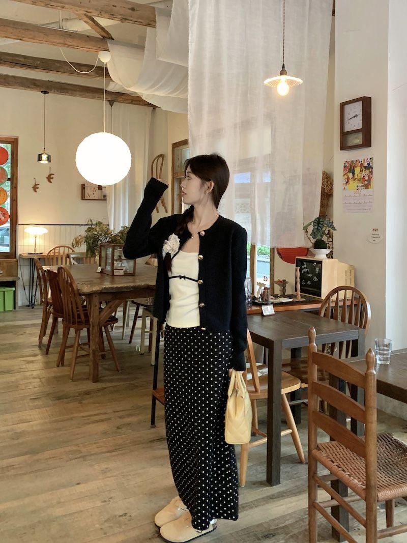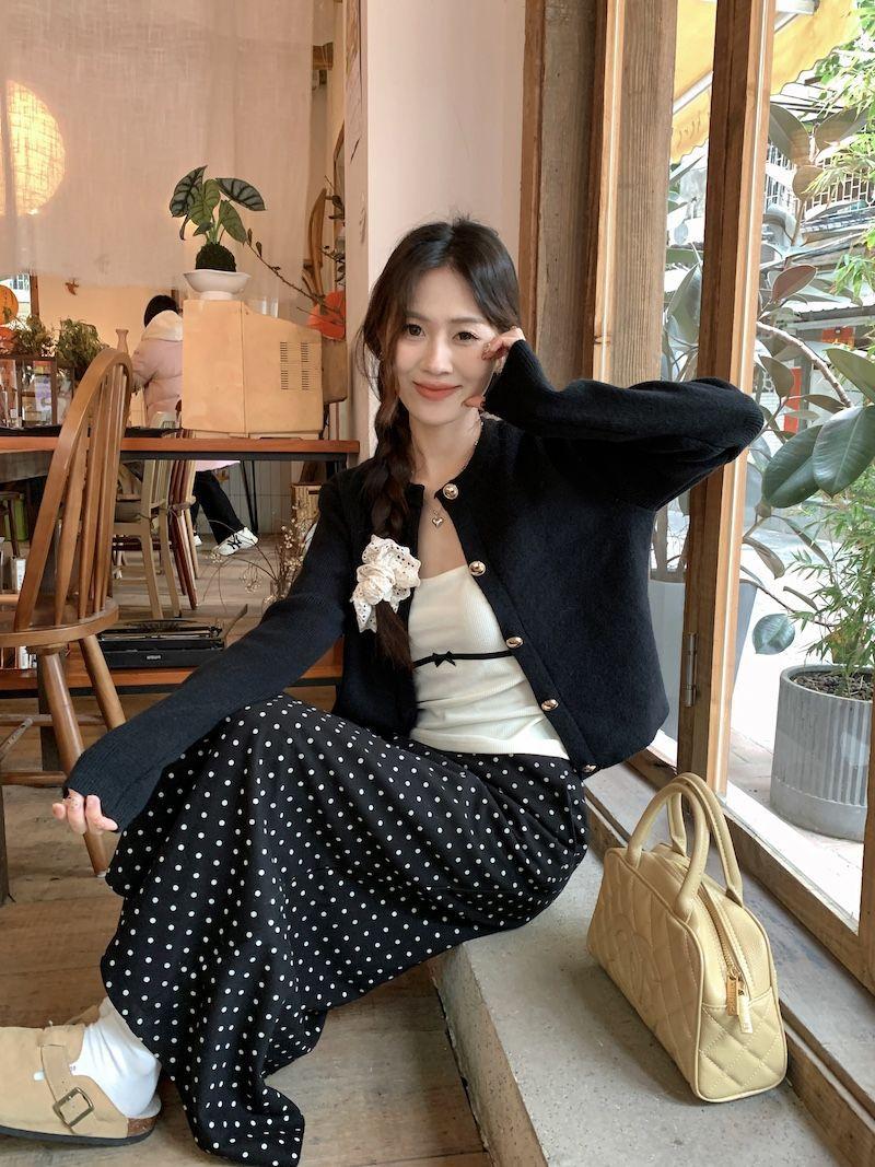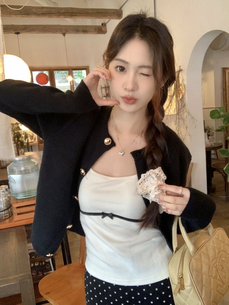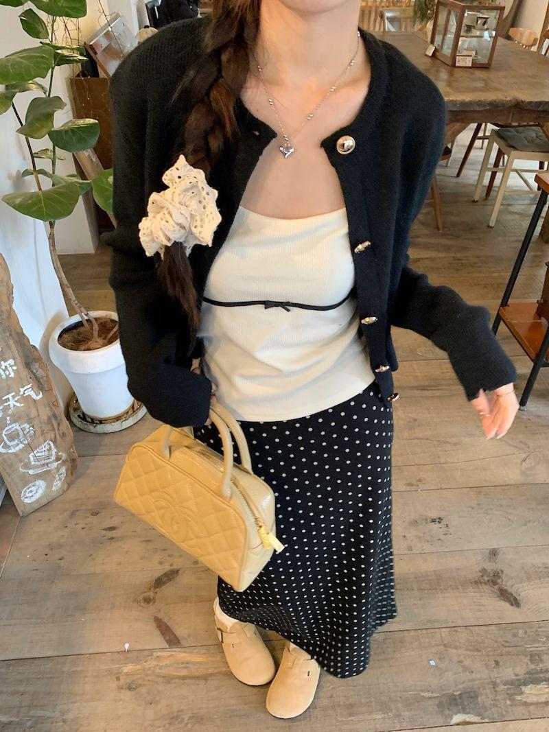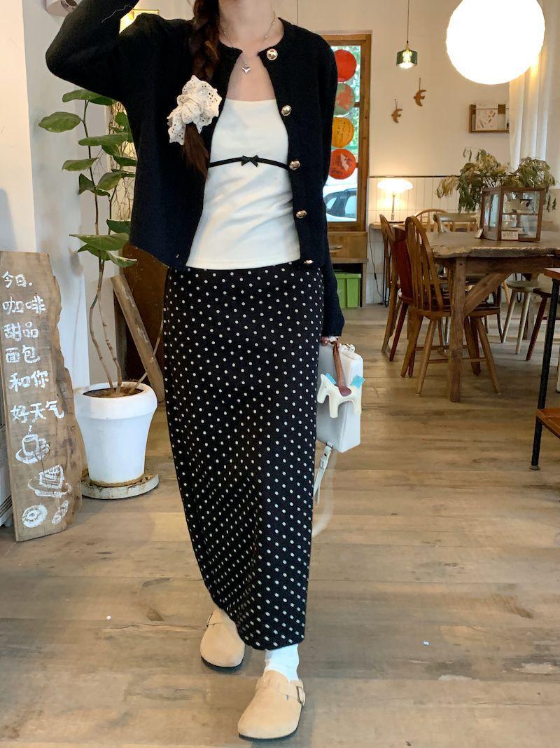 Polka dot skirt [flowers selected good quality], Black cardigan [flowers are selected with good quality], Cami...