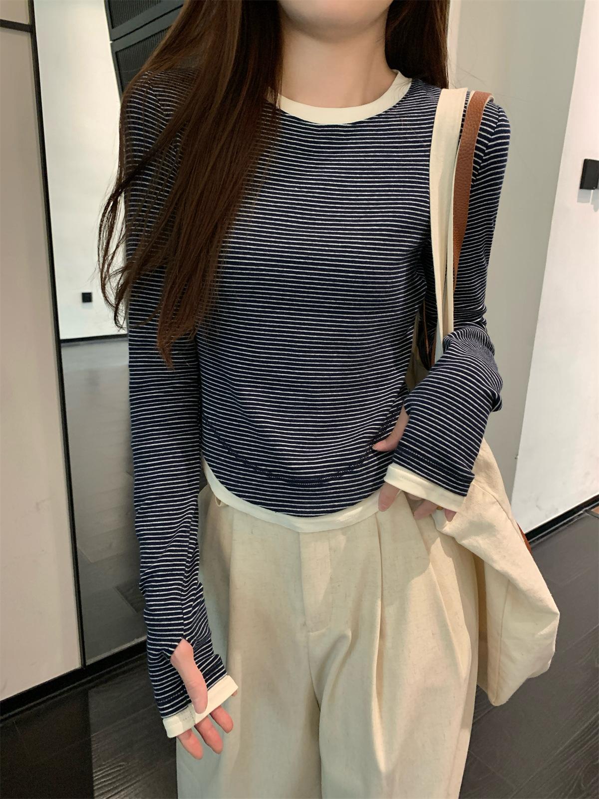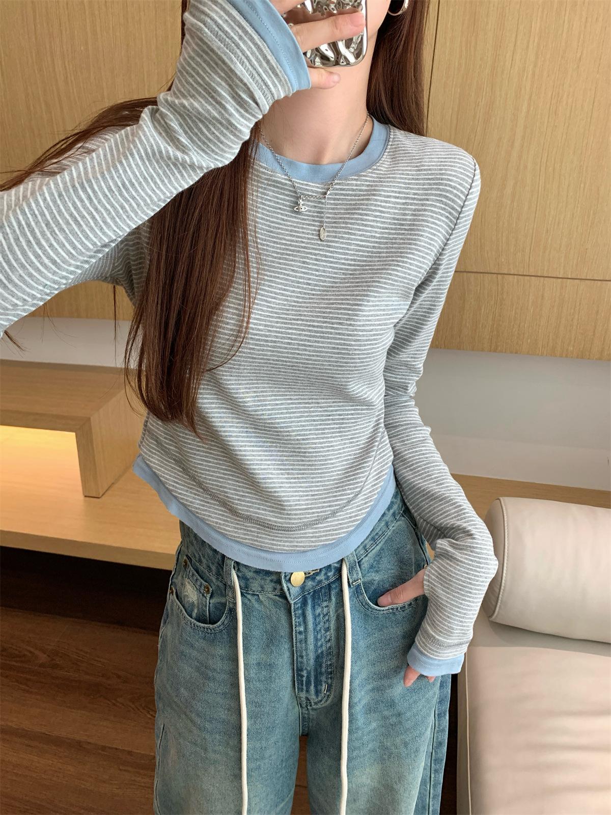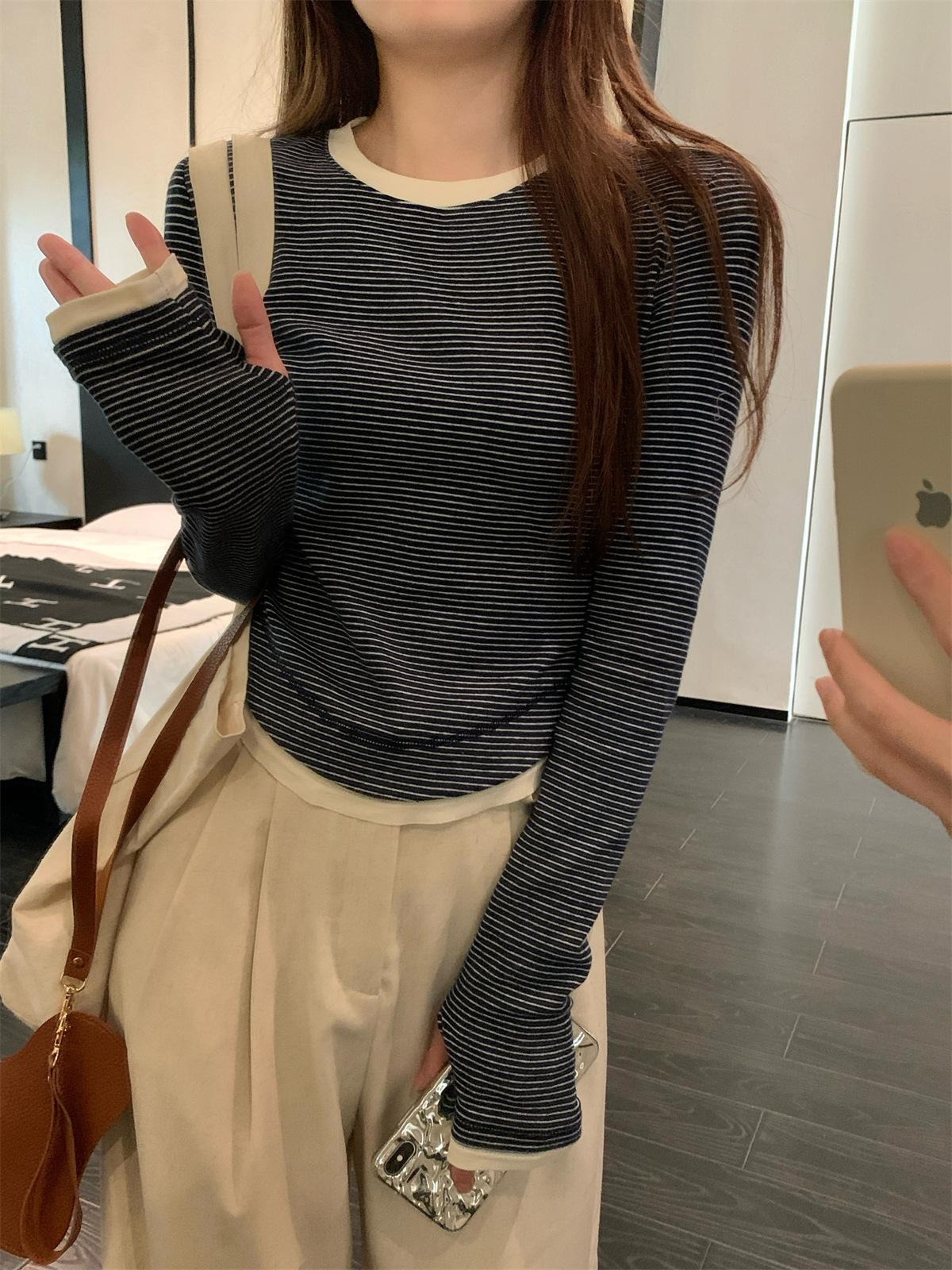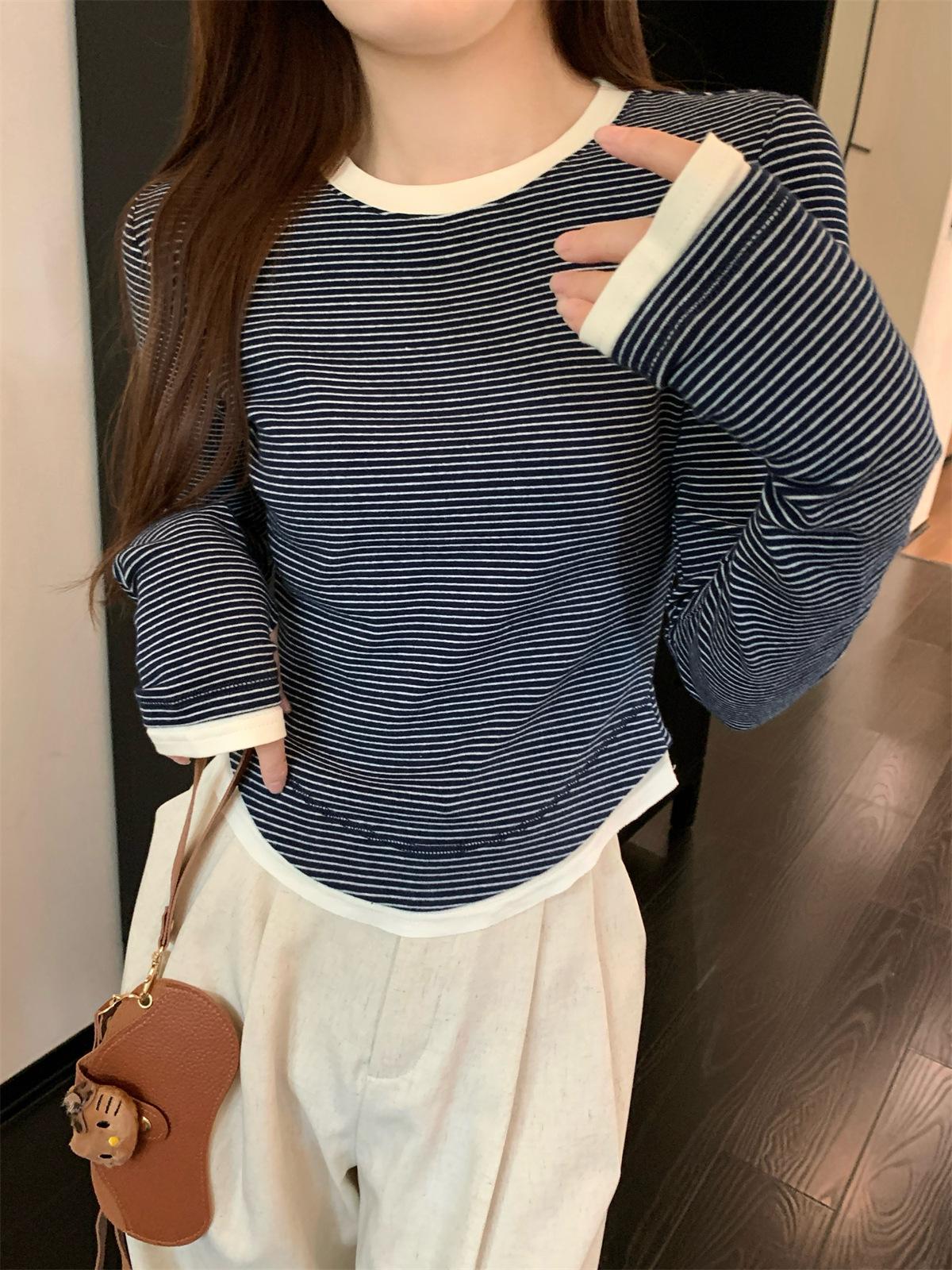 Foto Real Otoño Estilo Coreano Ajustado Combinable Contraste de Color Rayado Diseño Falso de Dos Piezas Manga Larga Camiseta Corta Top Mujer 68925