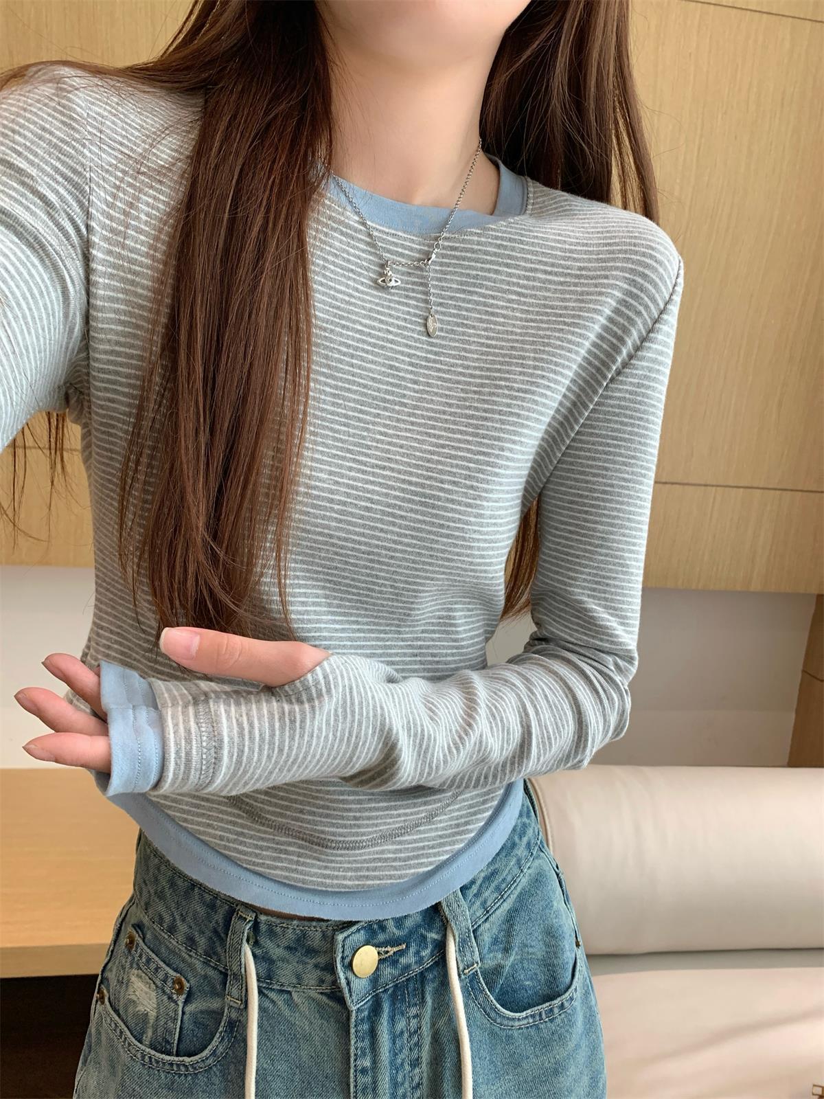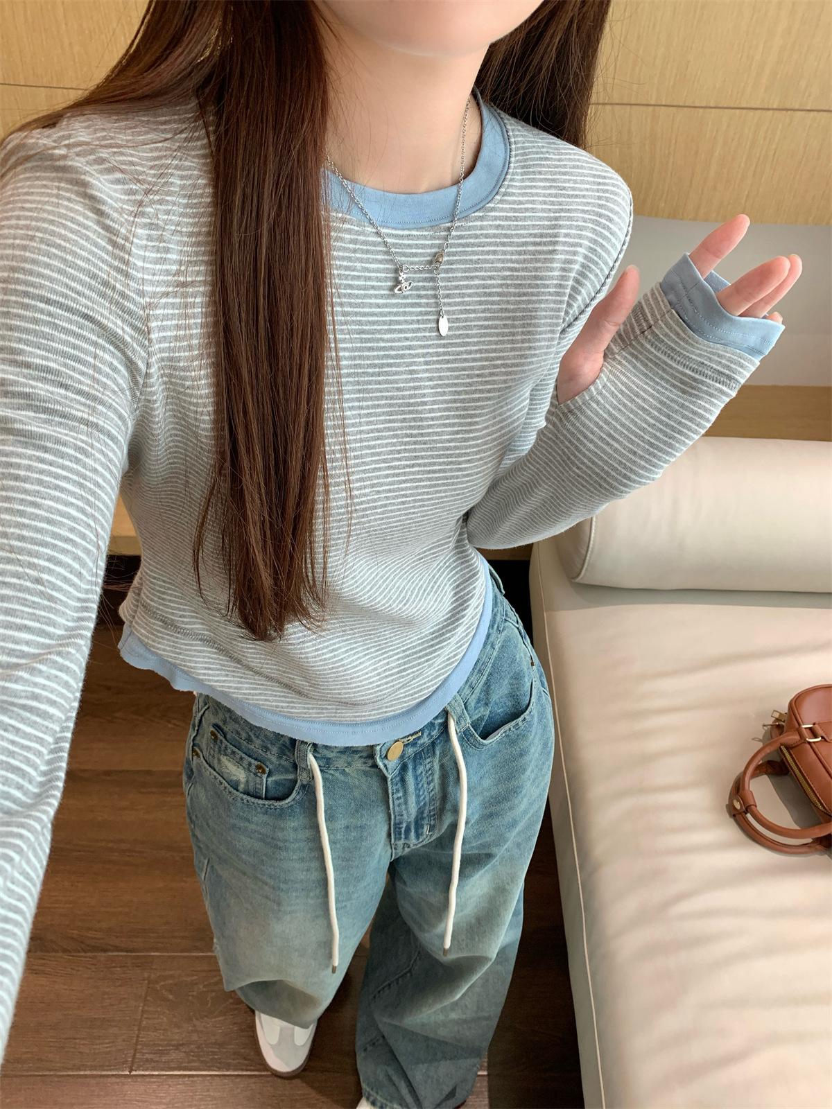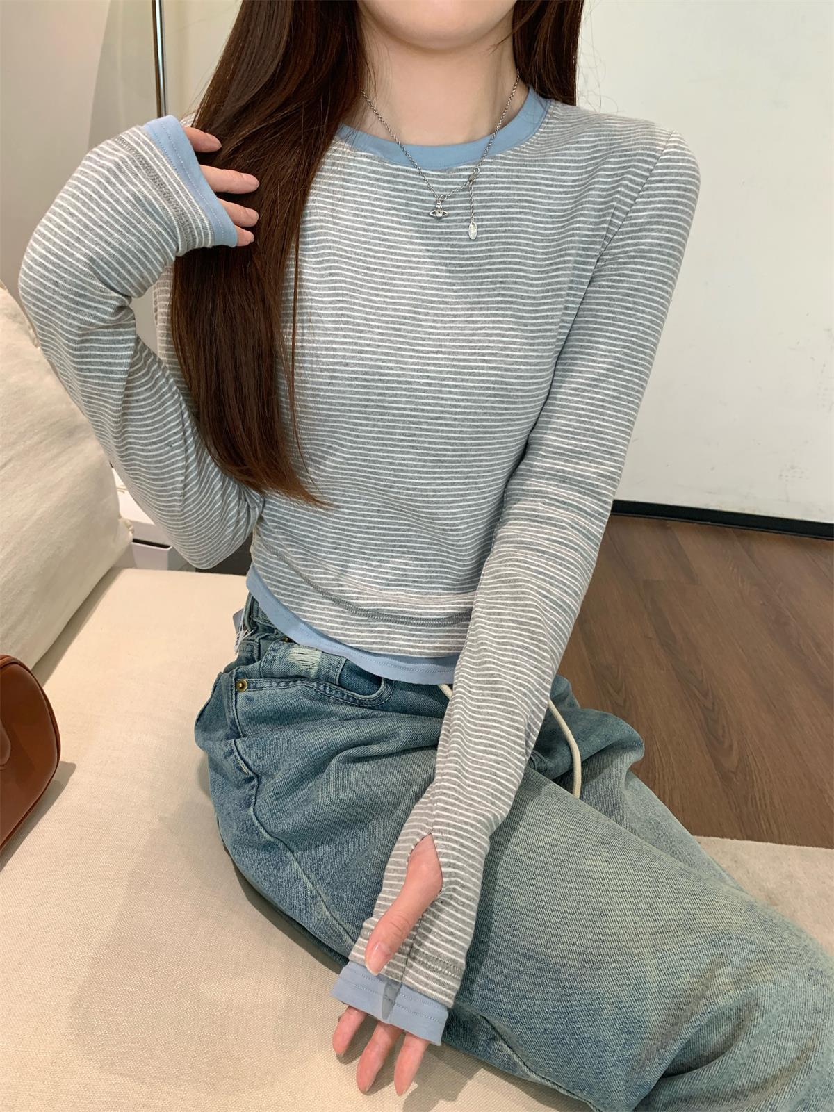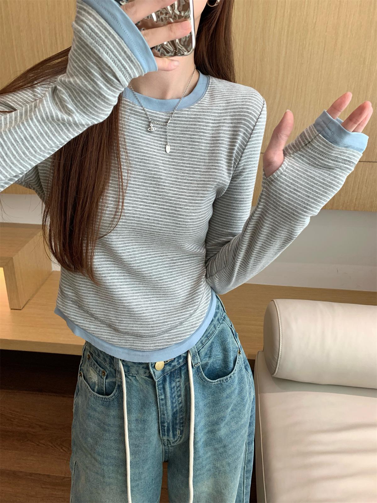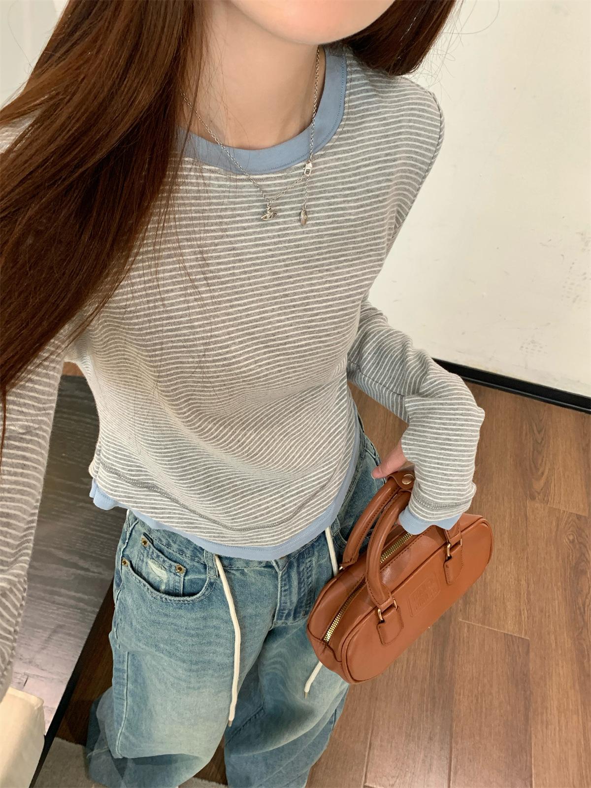 Foto Real Otoño Estilo Coreano Ajustado Combinable Contraste de Color Rayado Diseño Falso de Dos Piezas Manga Larga Camiseta Corta Top Mujer 68925