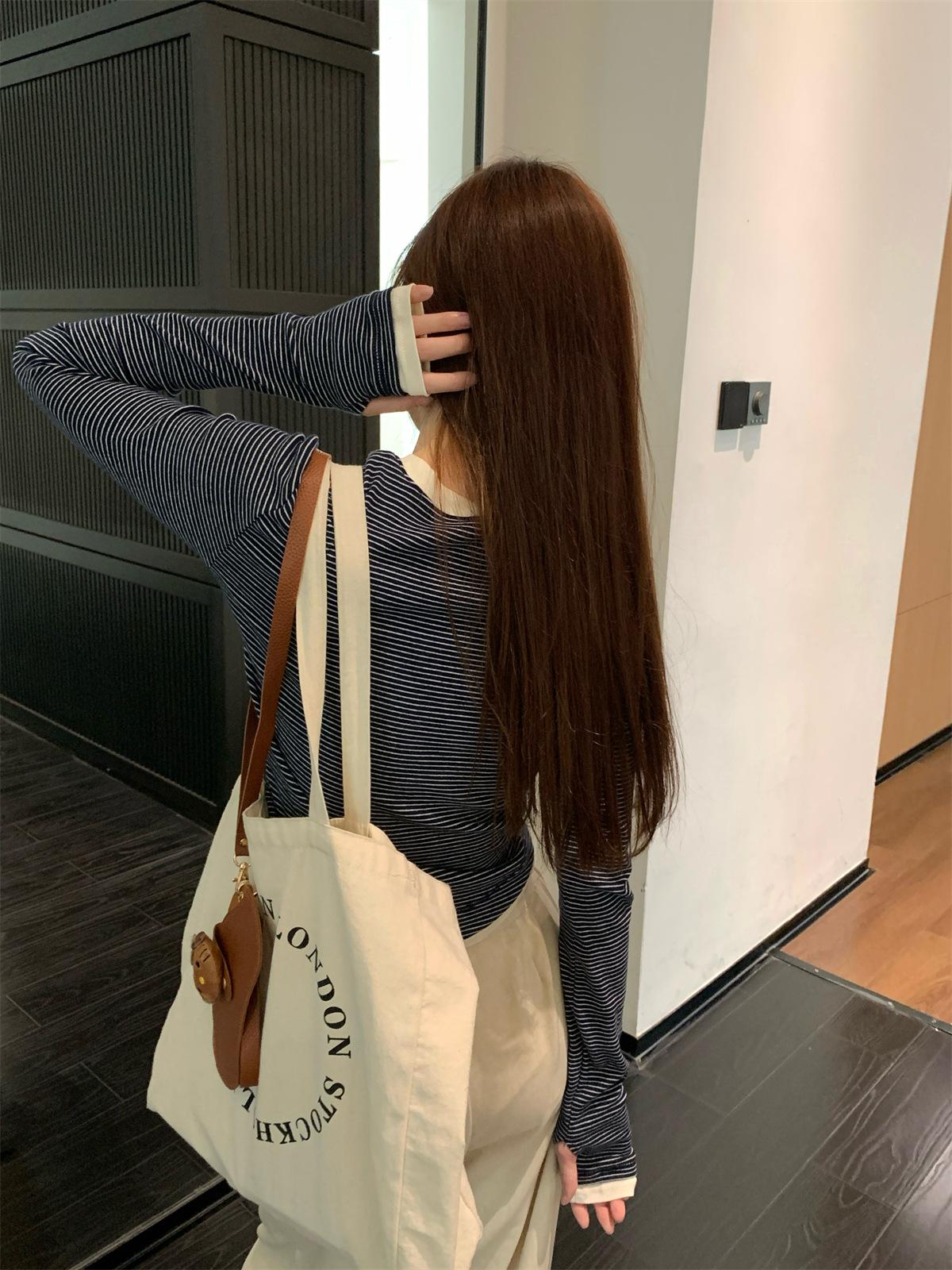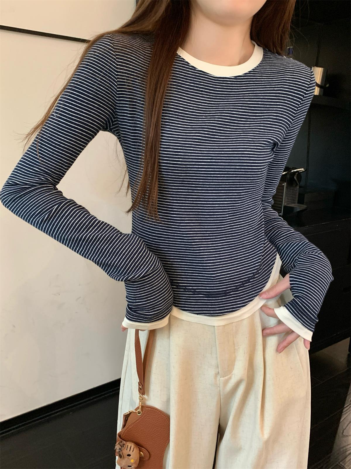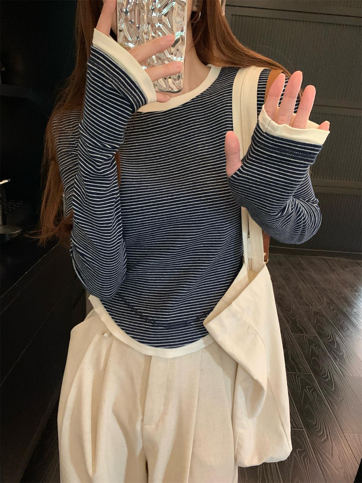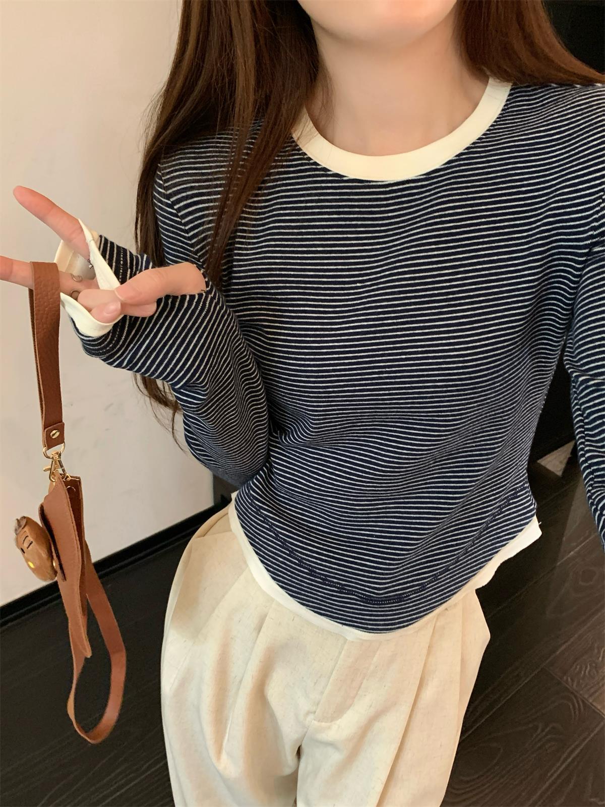 Foto Real Otoño Estilo Coreano Ajustado Combinable Contraste de Color Rayado Diseño Falso de Dos Piezas Manga Larga Camiseta Corta Top Mujer 68925