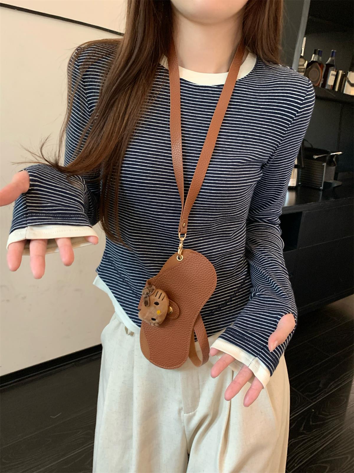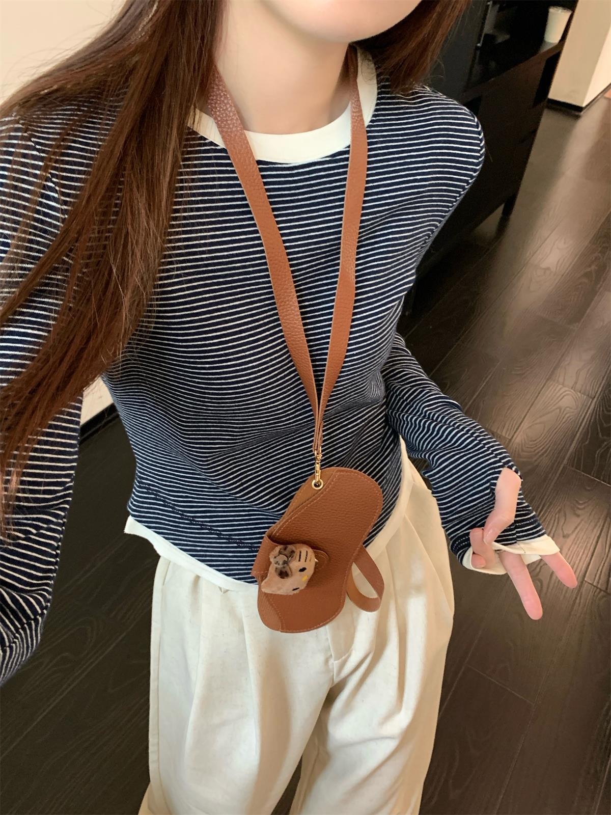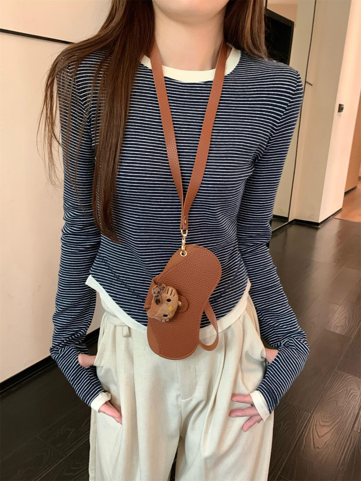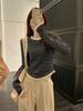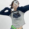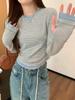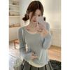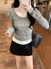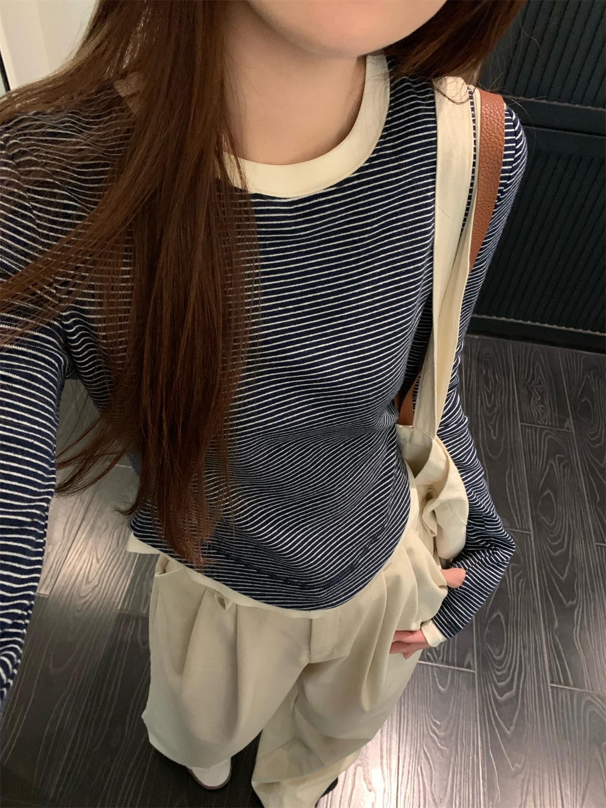 Foto Real Otoño Estilo Coreano Ajustado Combinable Contraste de Color Rayado Diseño Falso de Dos Piezas Manga Larga Camiseta Corta Top Mujer 68925
