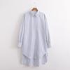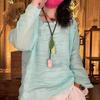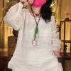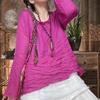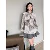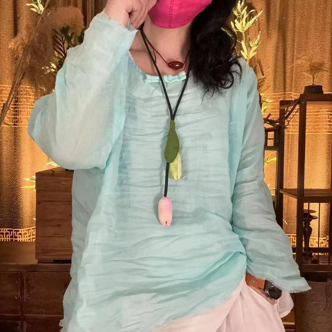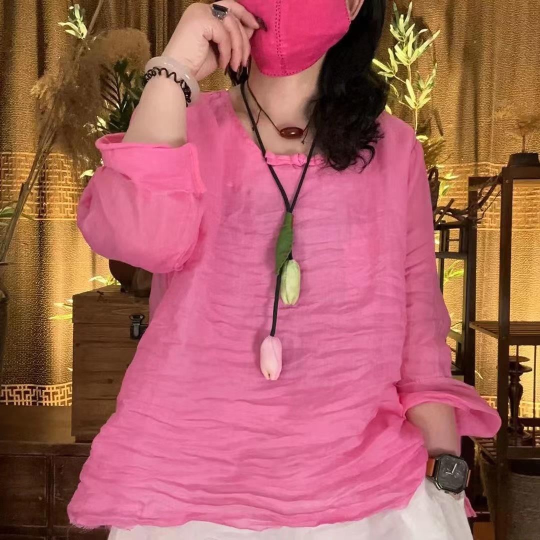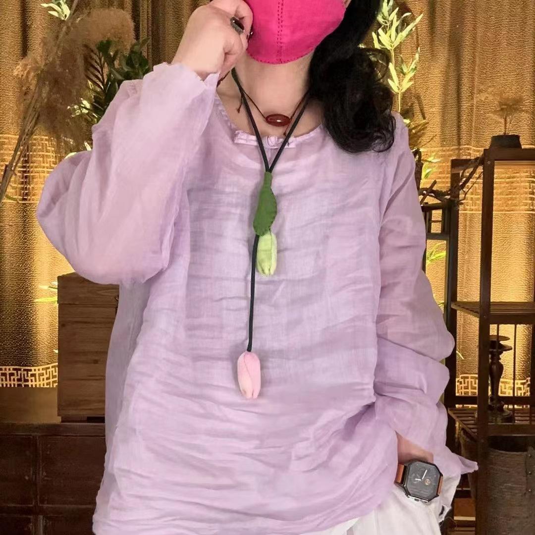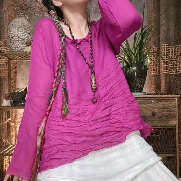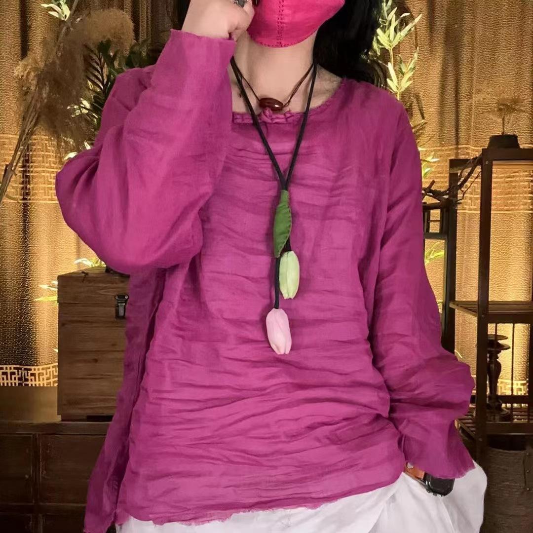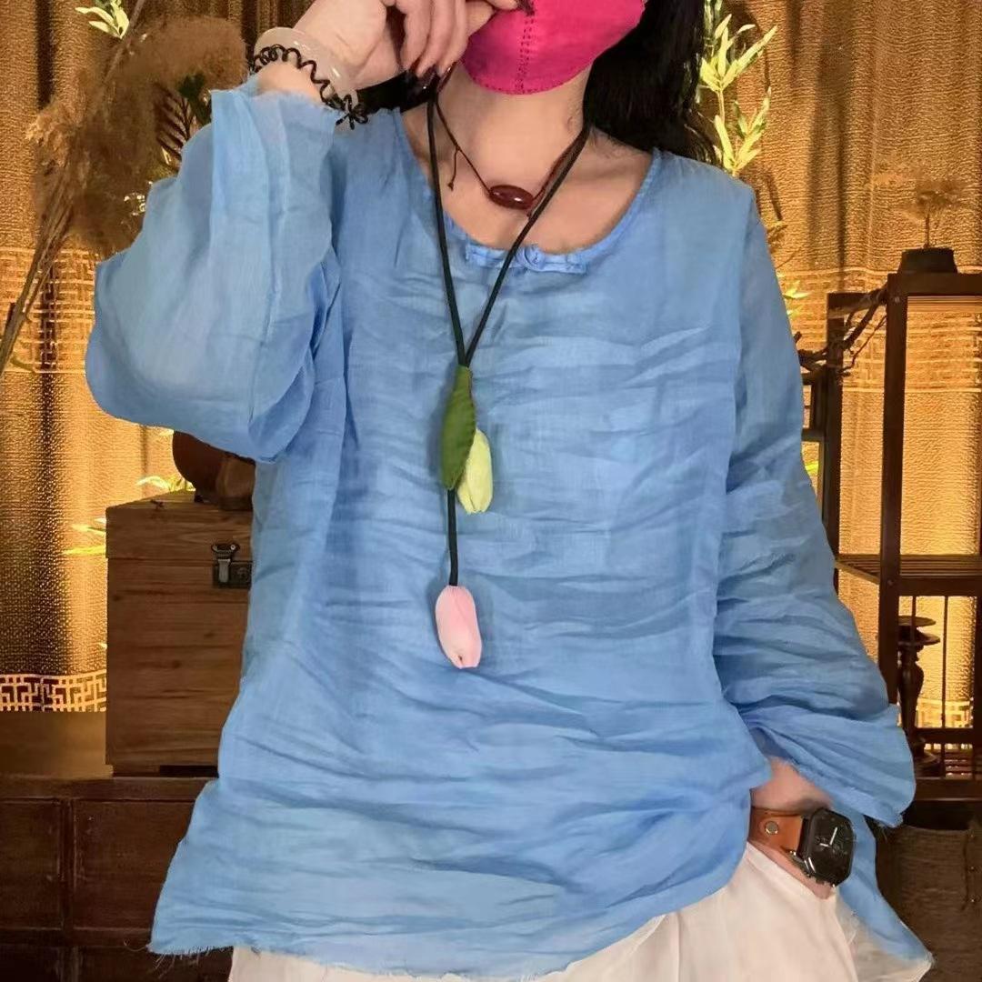 Camisa de manga larga con cuello redondo y estampado artístico de ramio, color liso, diseño holgado con hebilla, novedad de verano de 2024