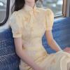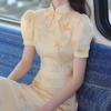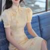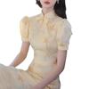 Nuevo vestido cheongsam chino elegante de alta gama mejorado, amarillo claro, con mangas abullonadas, estilo dulce y suave, vestido ajustado.