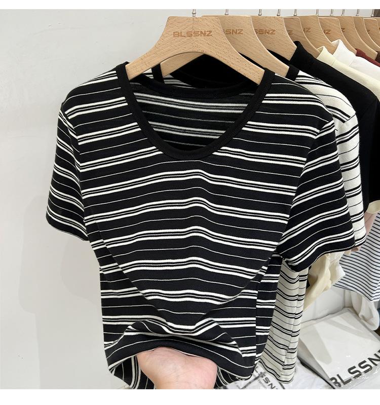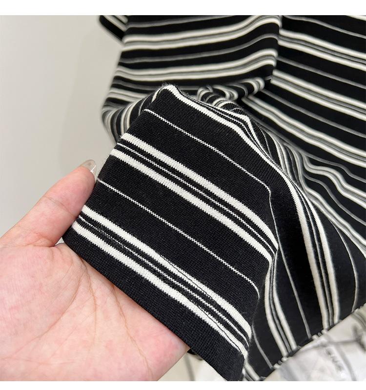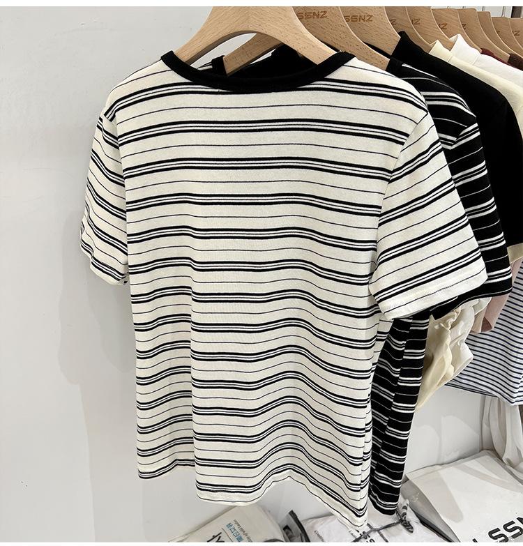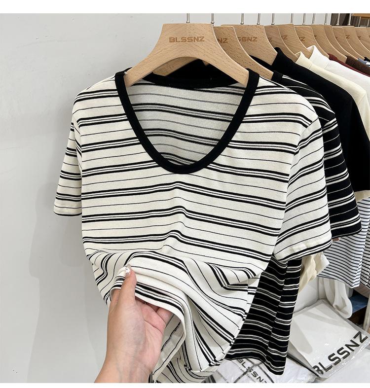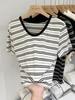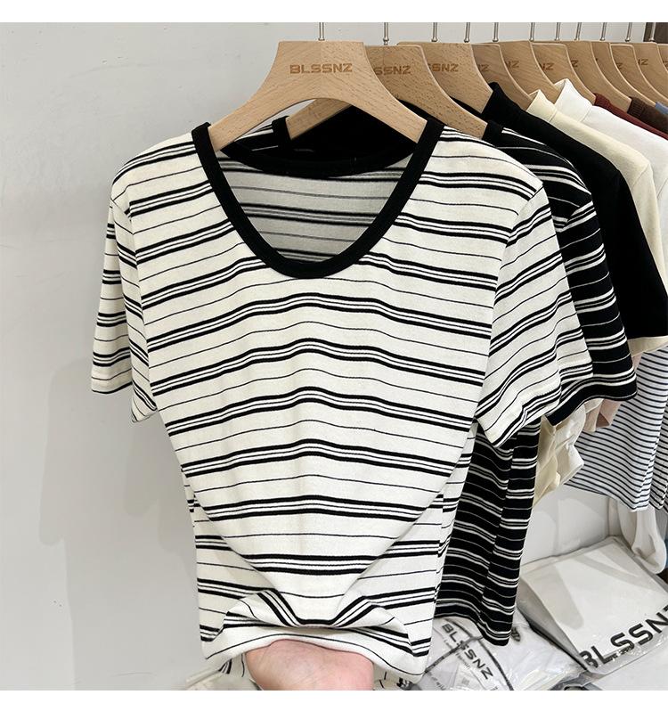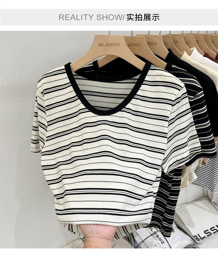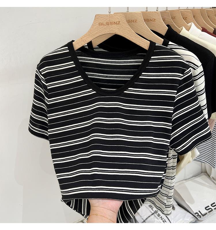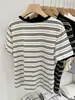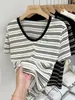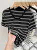 Camiseta de manga corta a rayas con escote en V y hombros descubiertos para mujer, verano 2024, nuevo diseño, camiseta holgada Sense Niche para personas pequeñas.