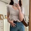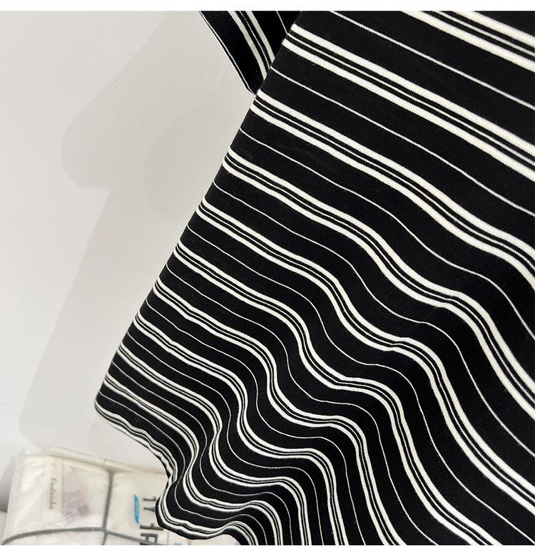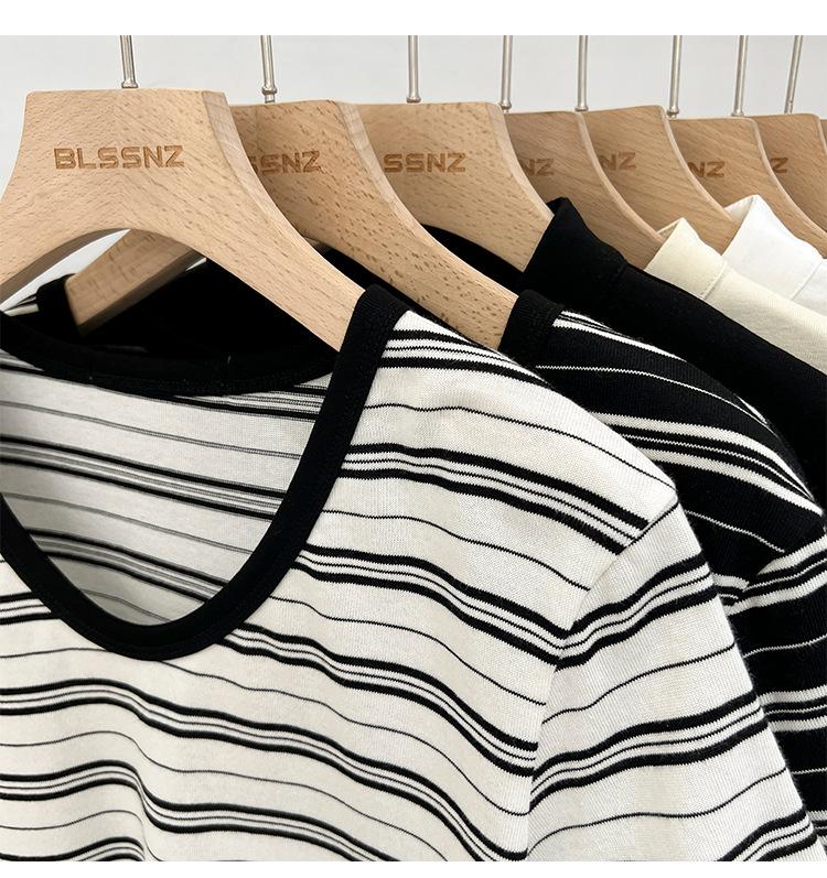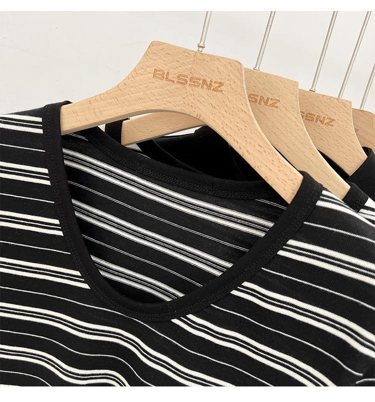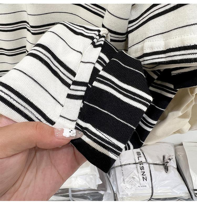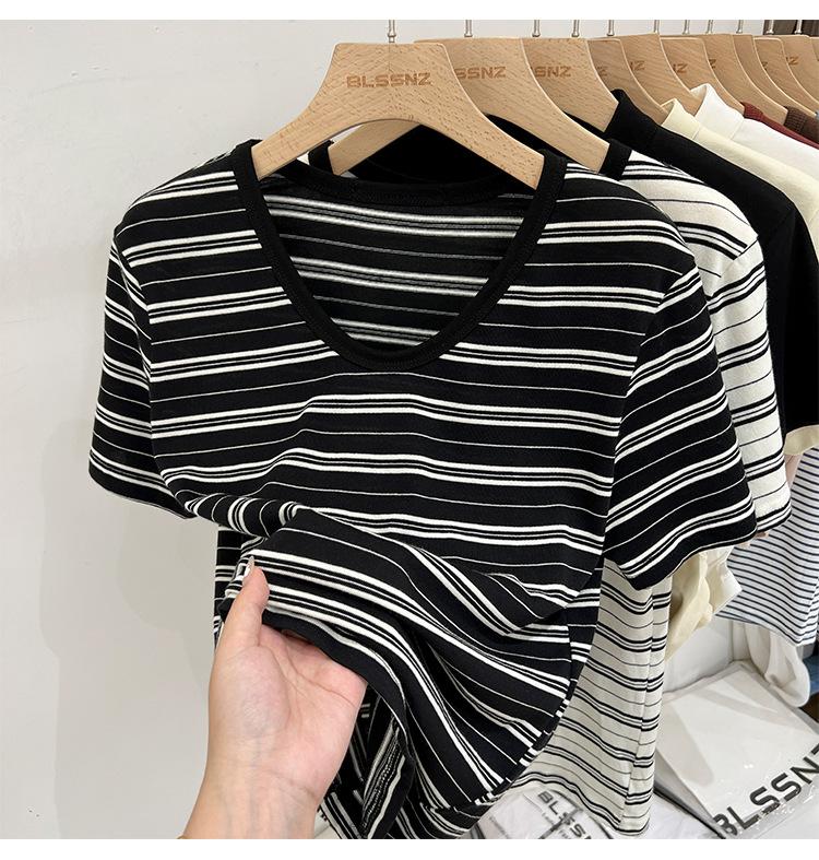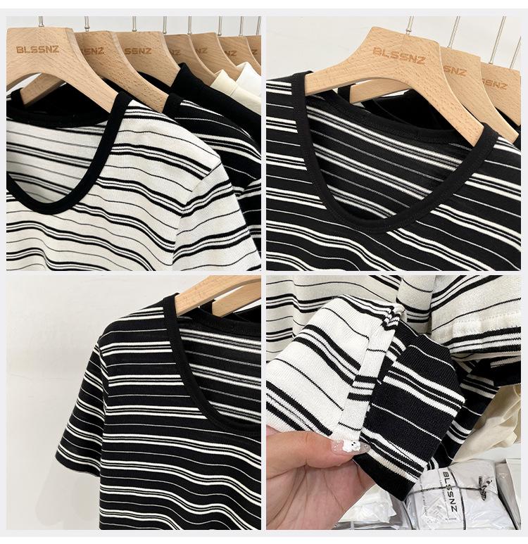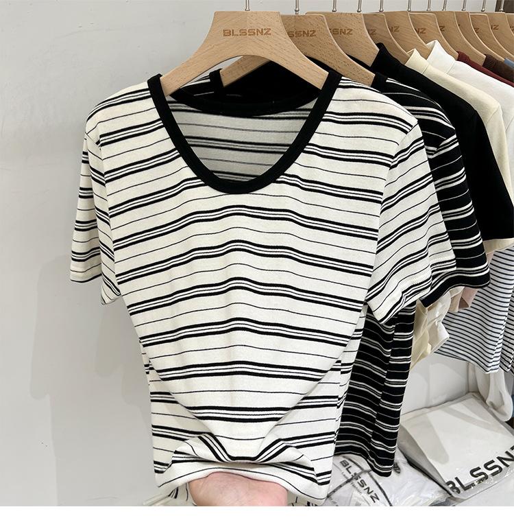 Camiseta de manga corta a rayas con escote en V y hombros descubiertos para mujer, verano 2024, nuevo diseño, camiseta holgada Sense Niche para personas pequeñas.