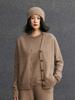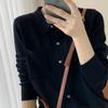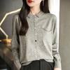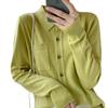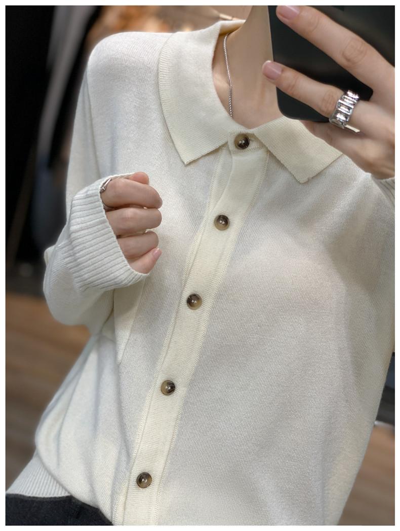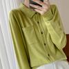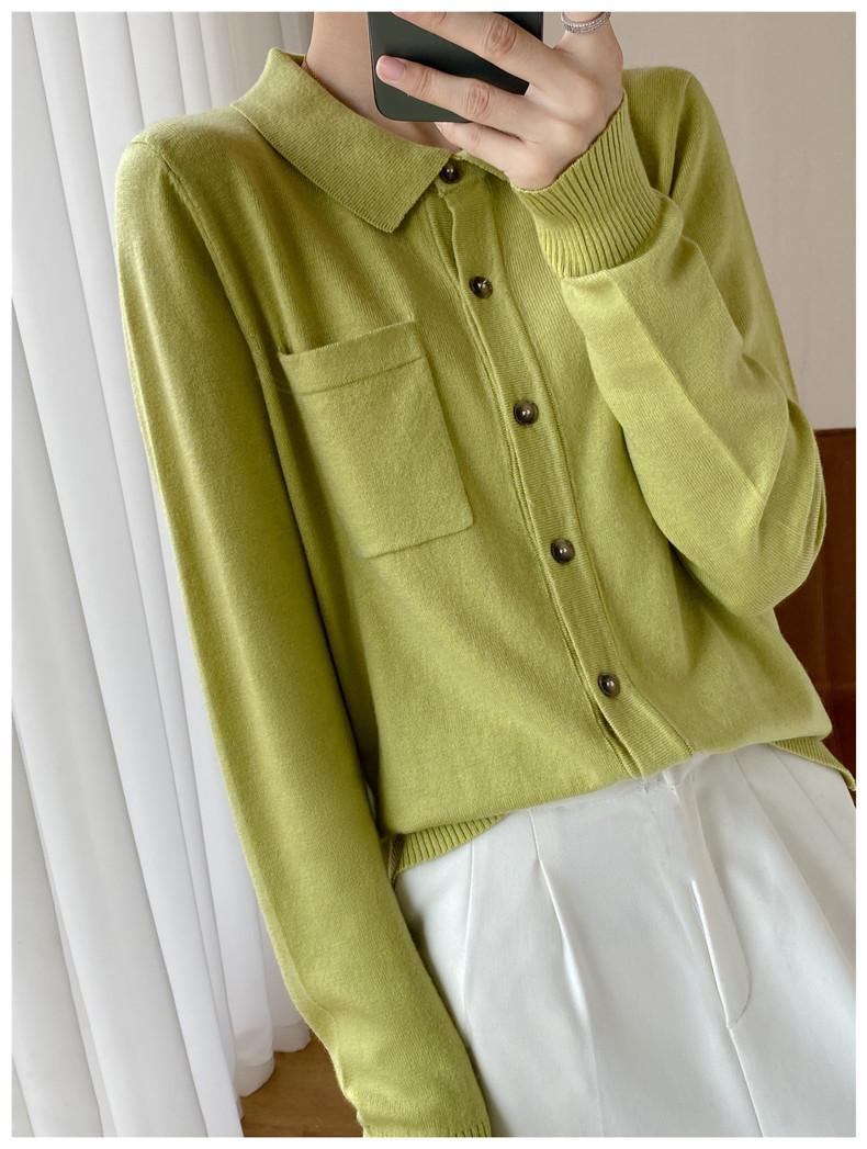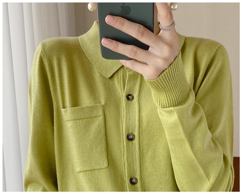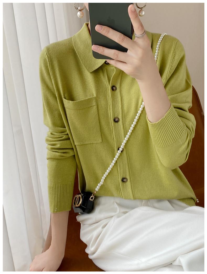 Chaqueta de punto de lana peinada de otoño para mujer, combinable con todo, cuello polo, manga larga, color liso, con cinturón y hebilla