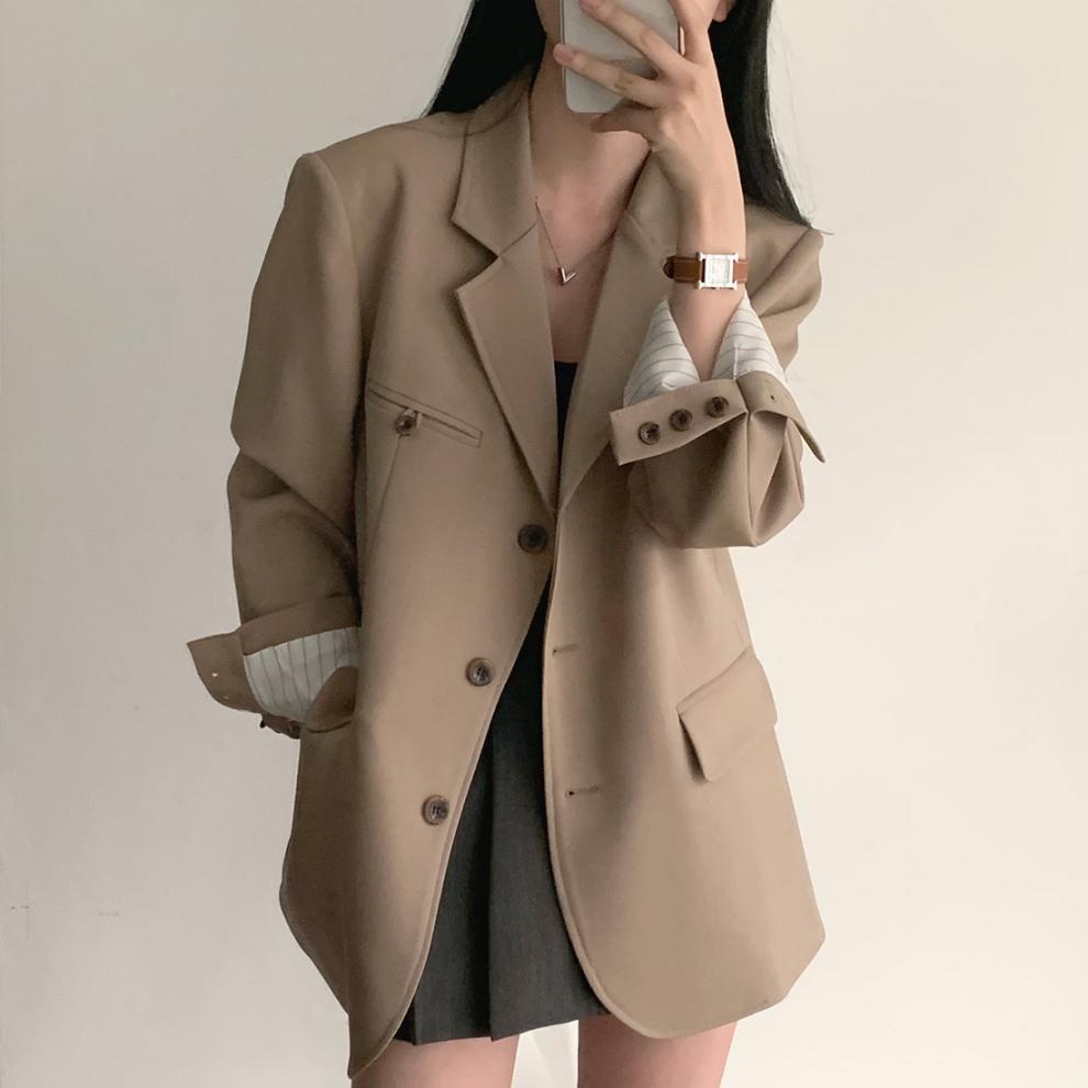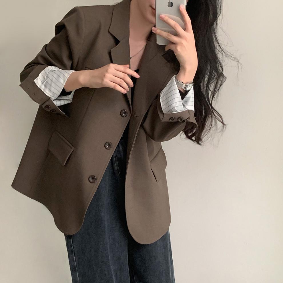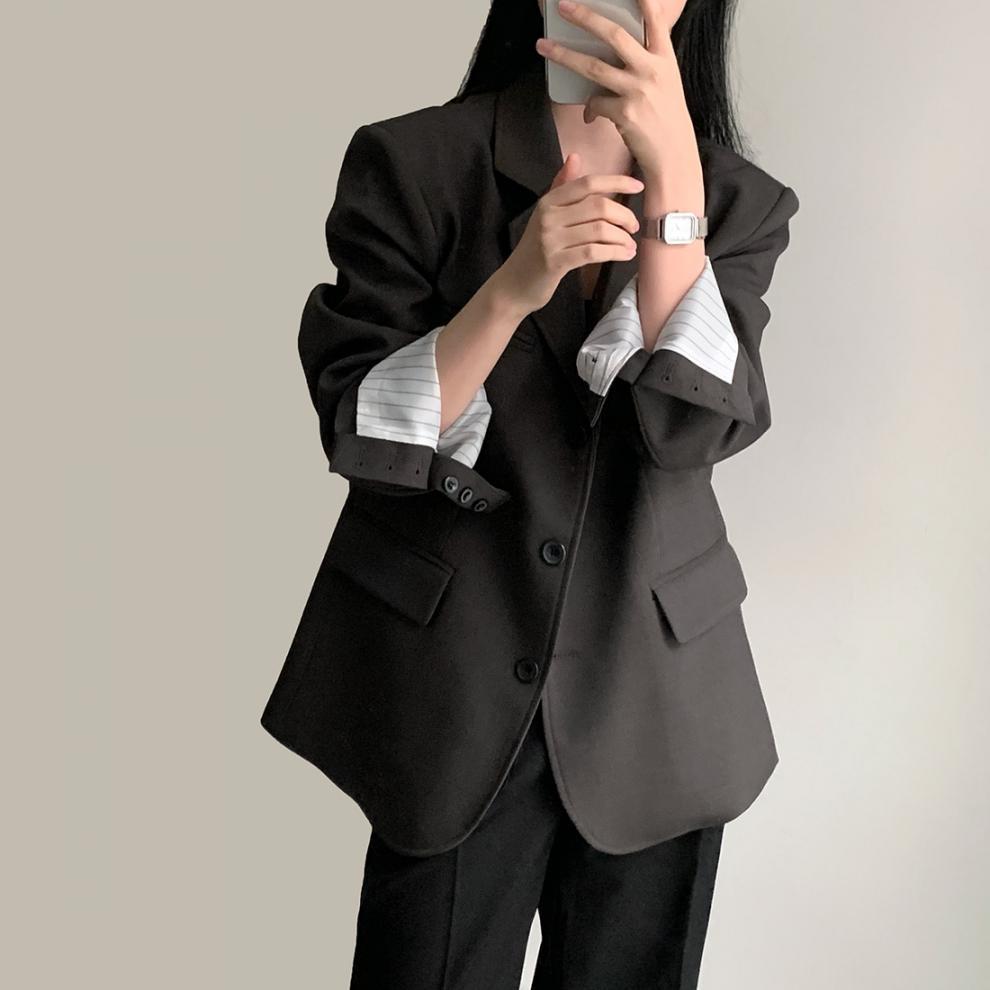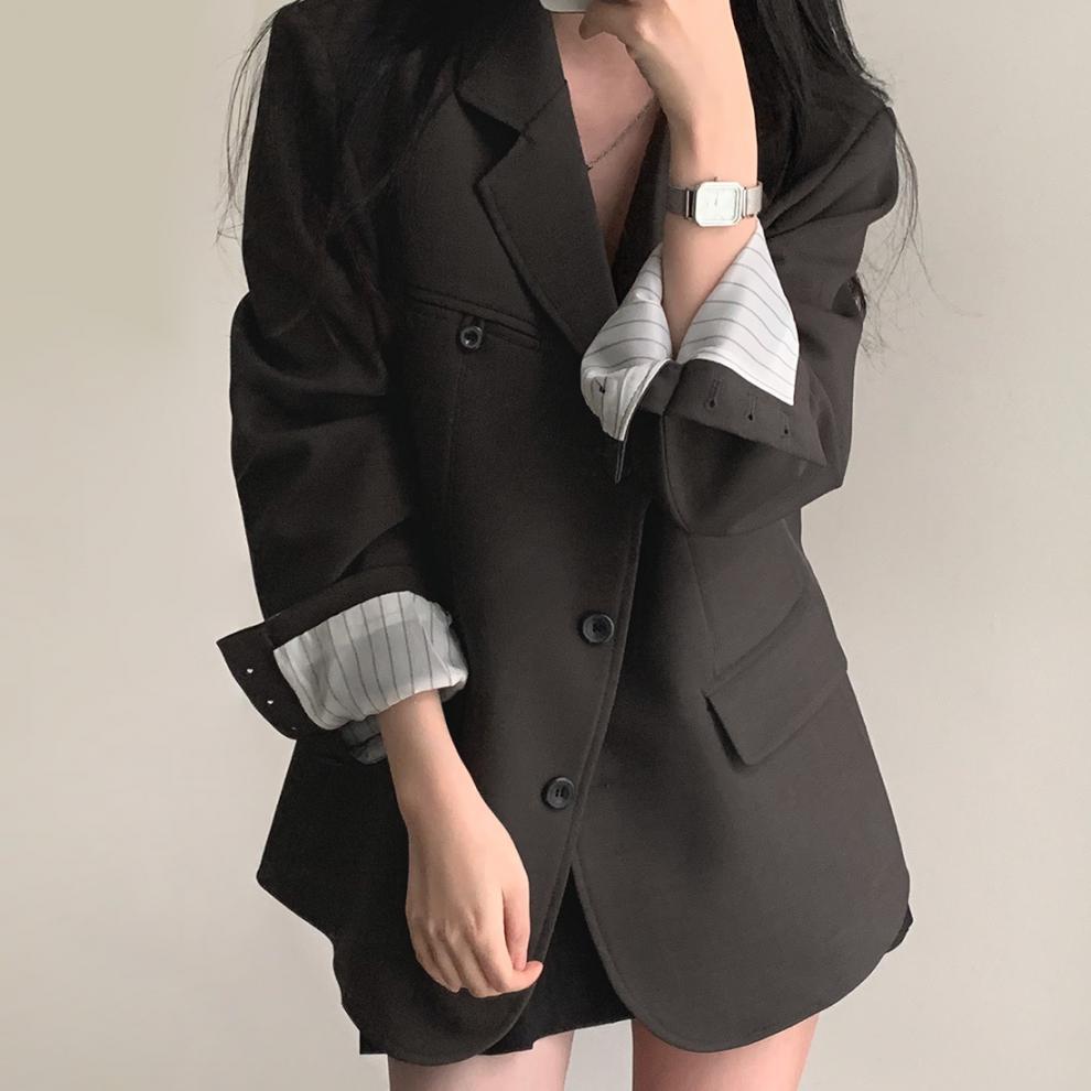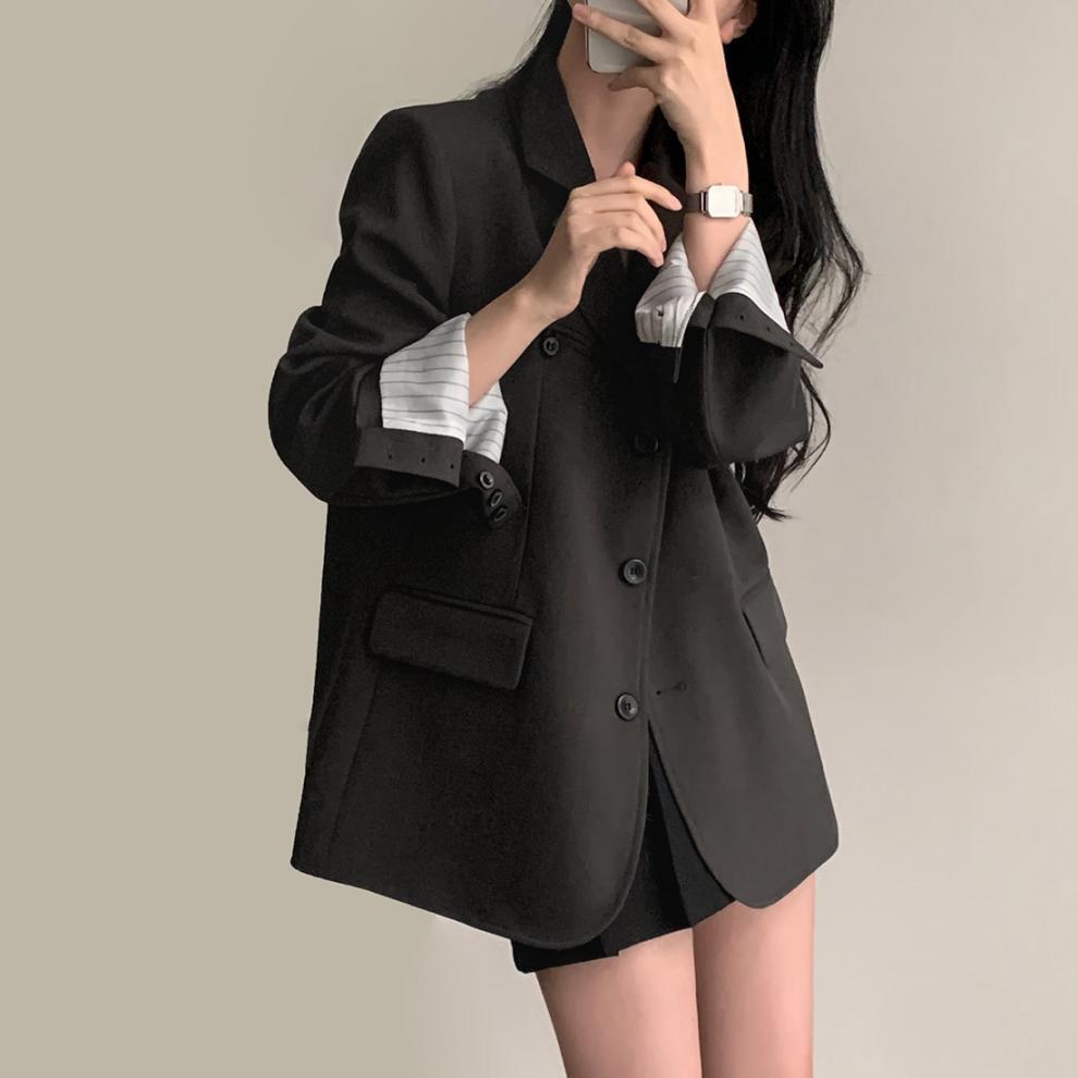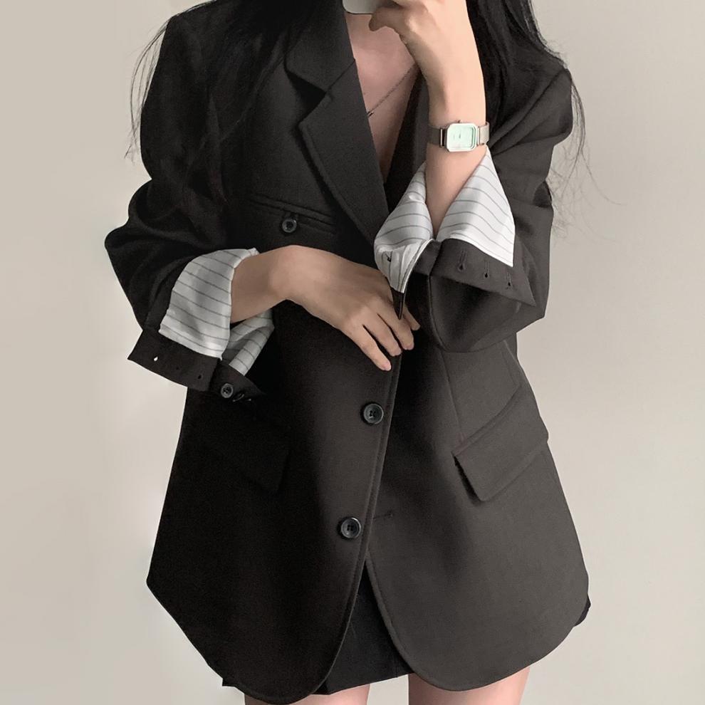 Chaqueta de Traje Coreana para Mujer Dongdaemun de Alta Calidad Chic Elegante Contrastante Holgada de Un Solo Botón de Manga Larga