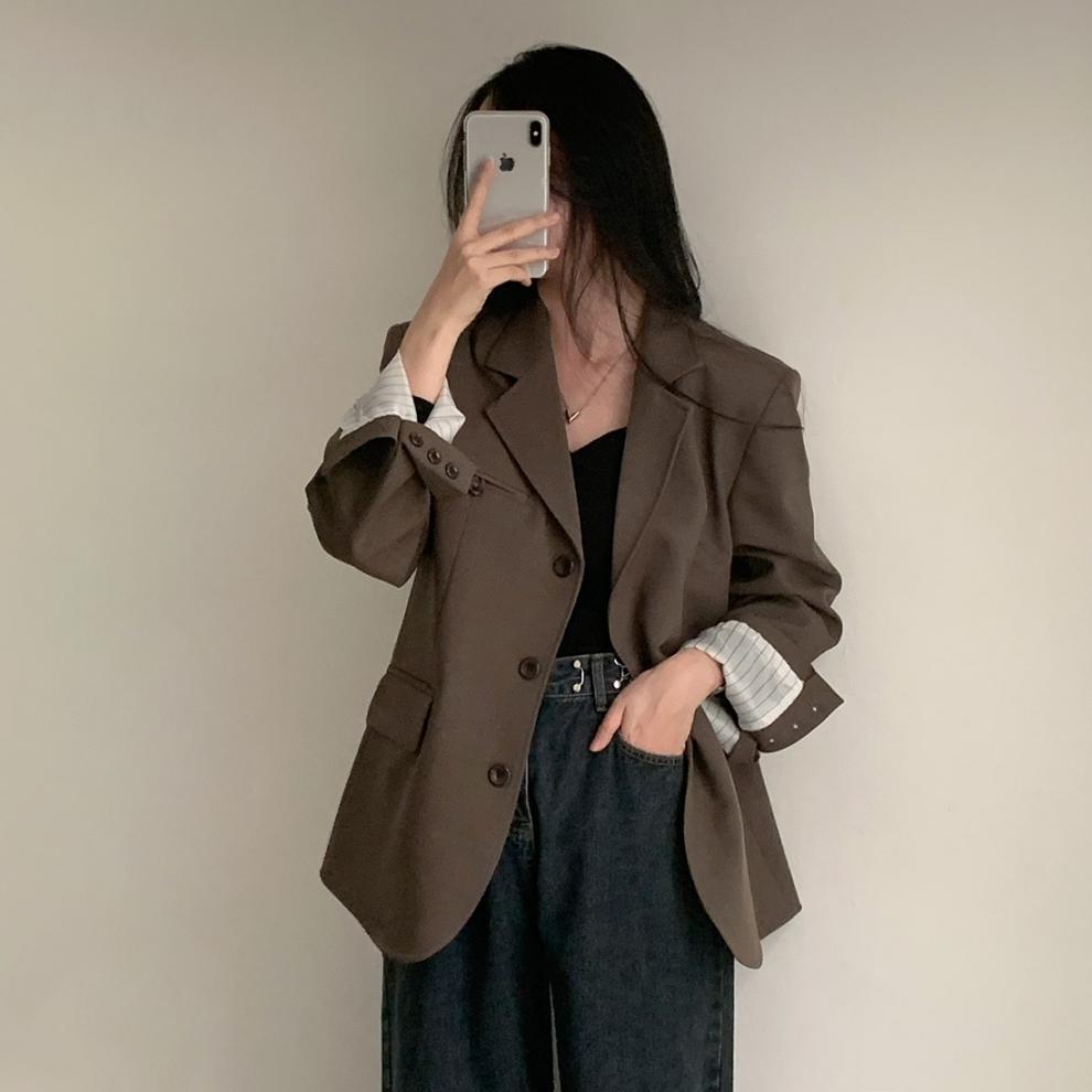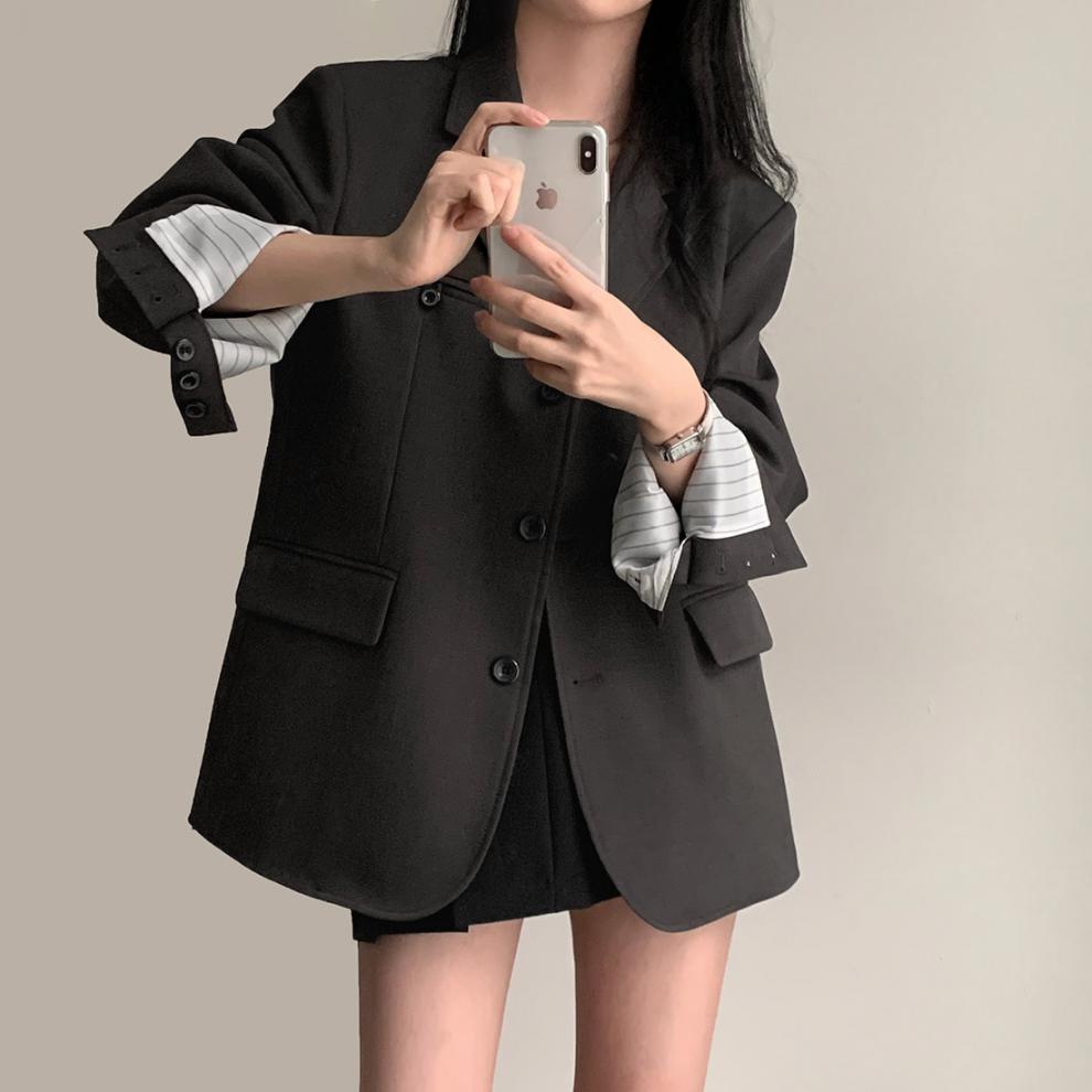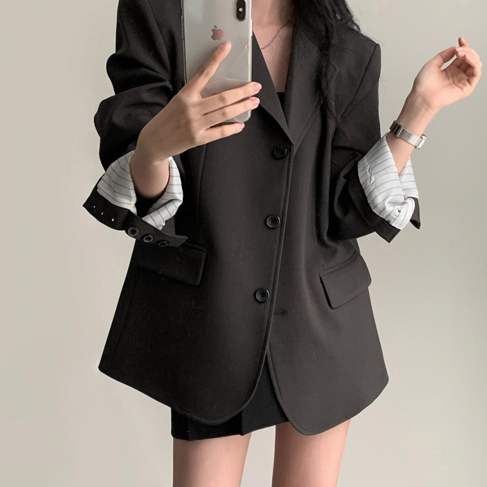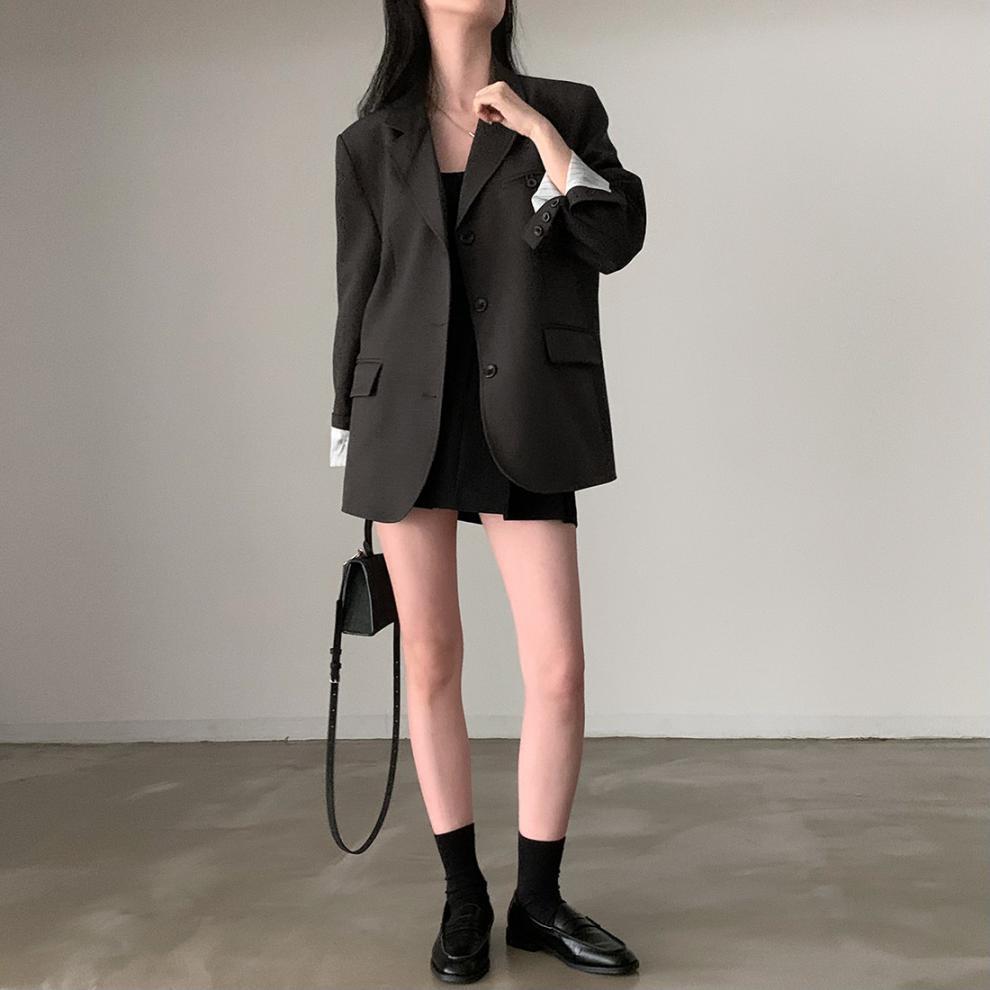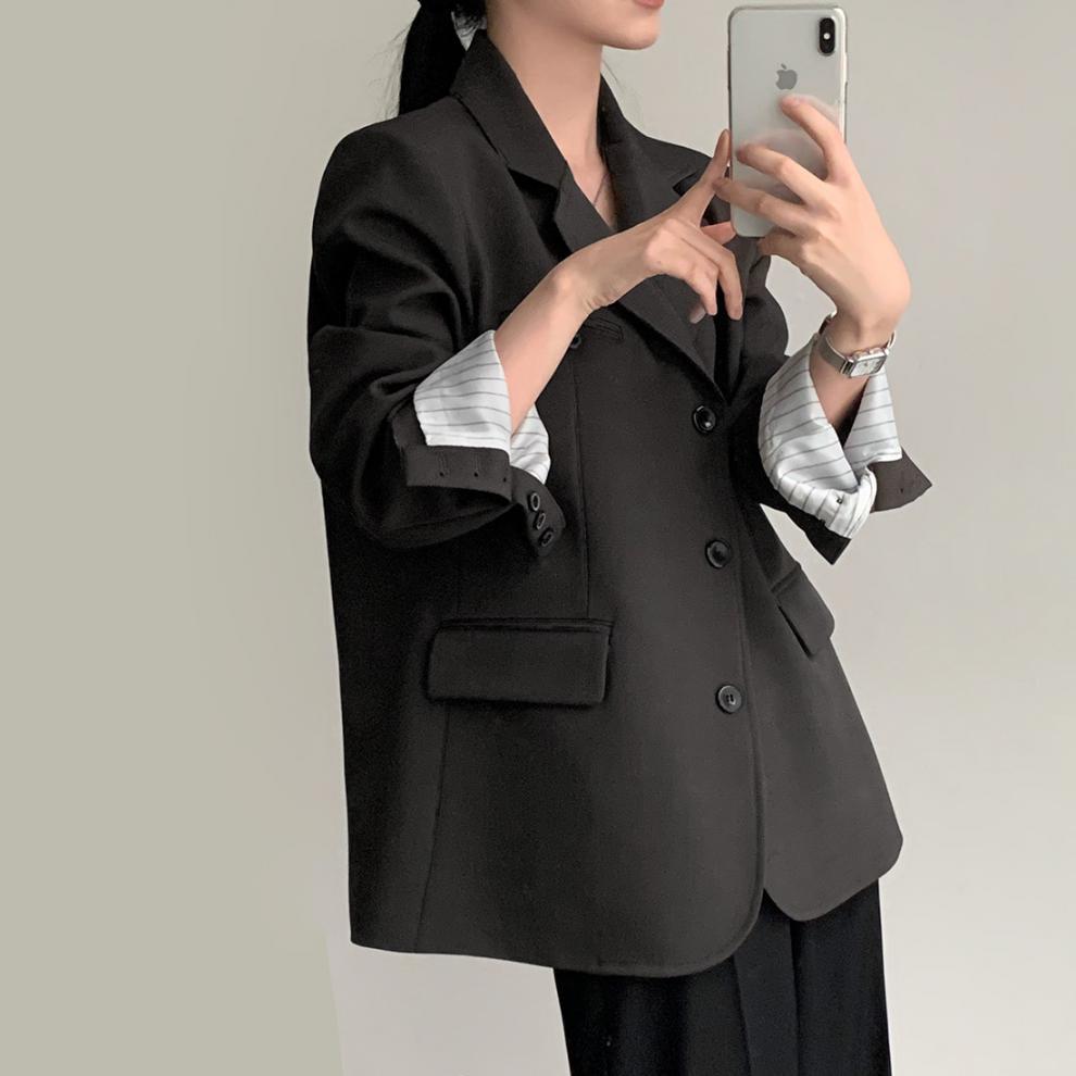 Chaqueta de Traje Coreana para Mujer Dongdaemun de Alta Calidad Chic Elegante Contrastante Holgada de Un Solo Botón de Manga Larga