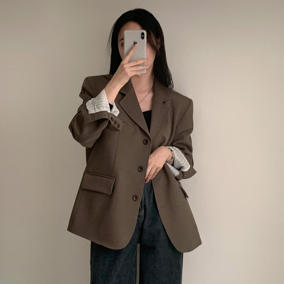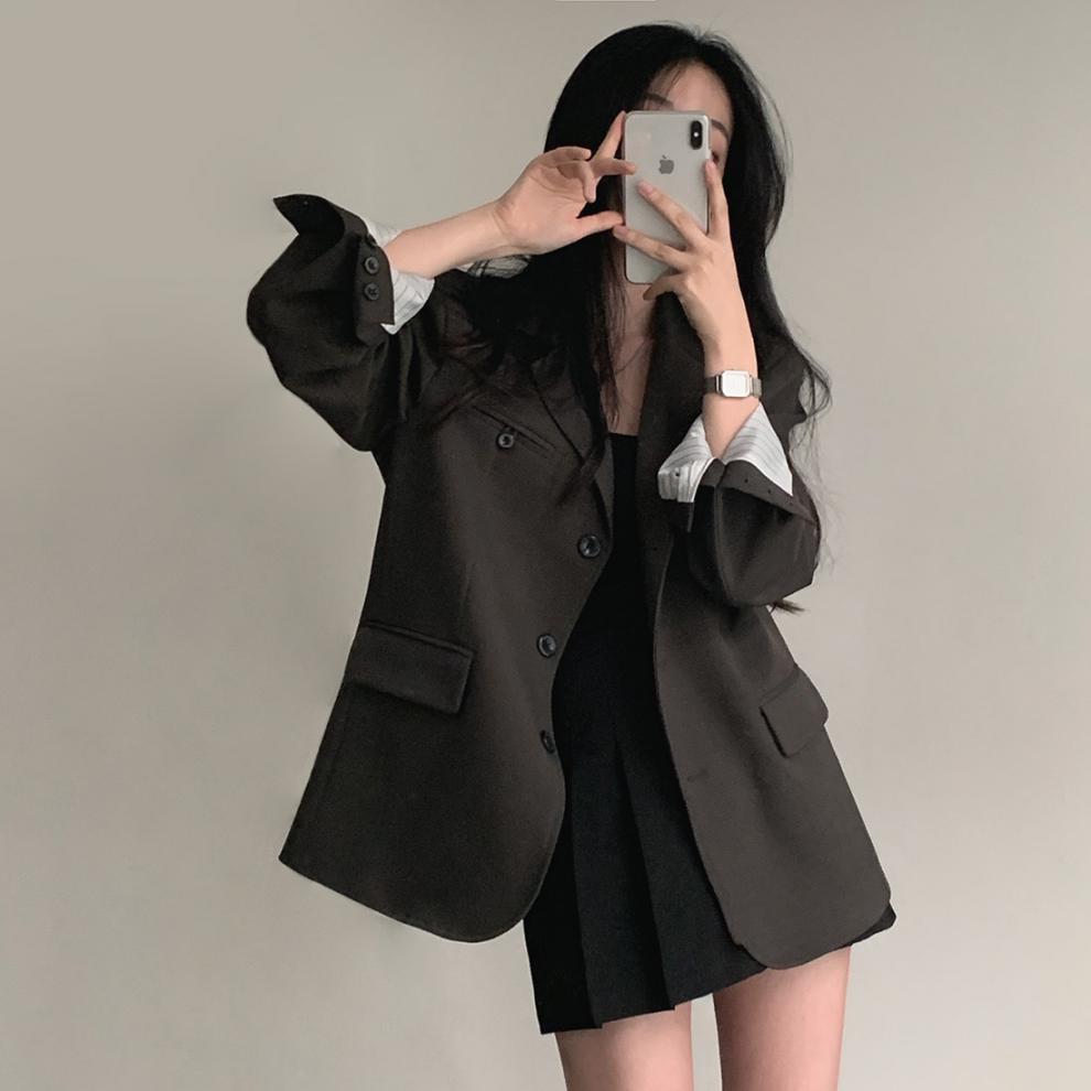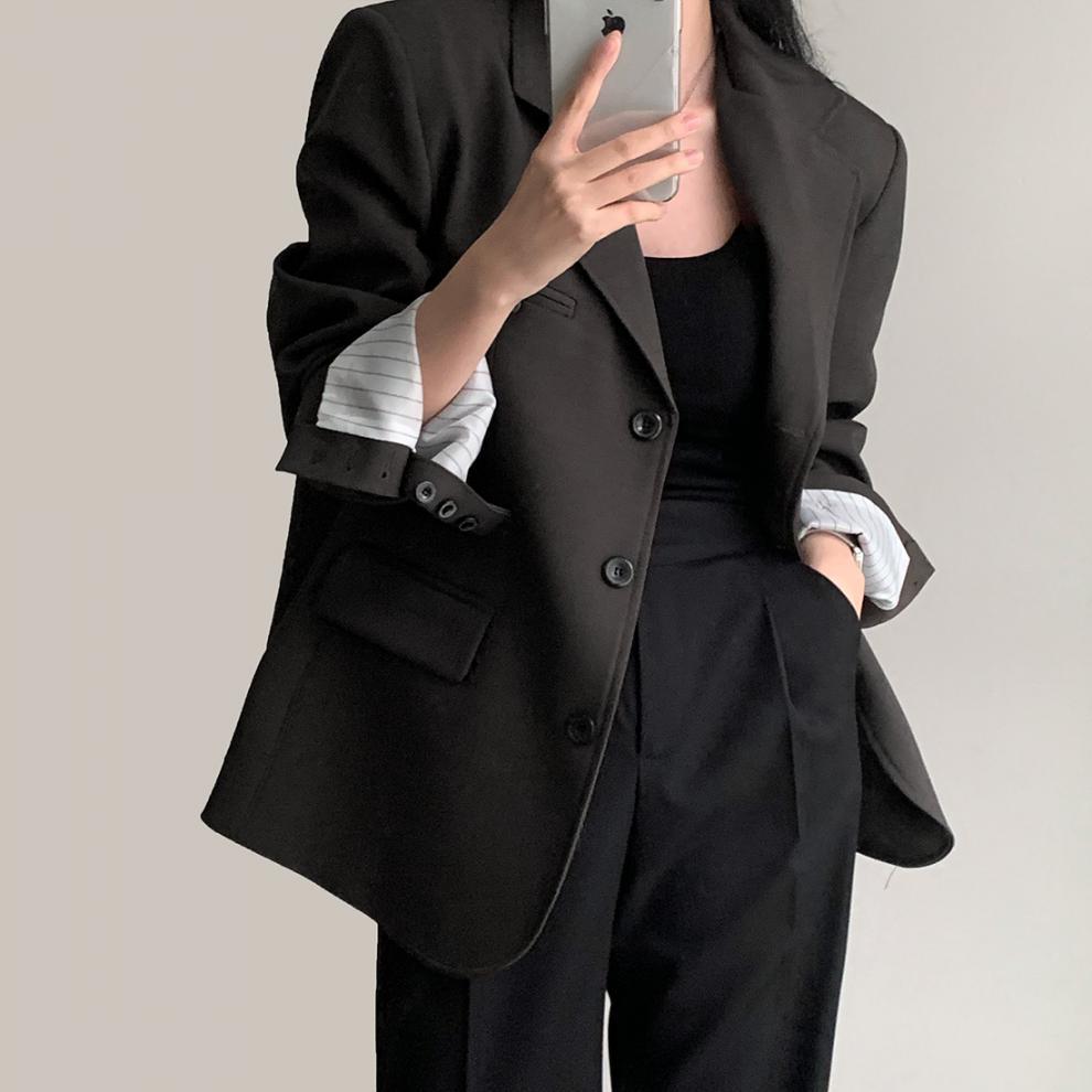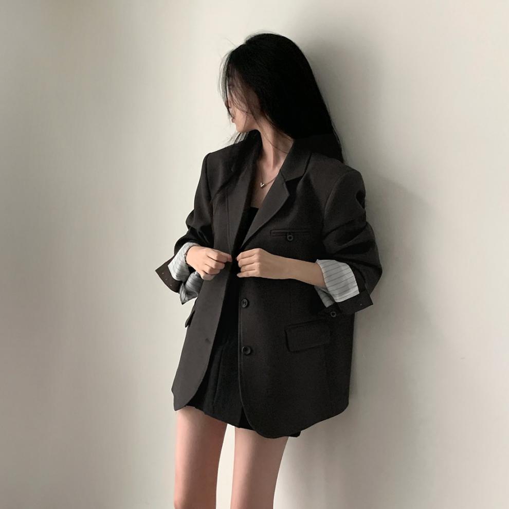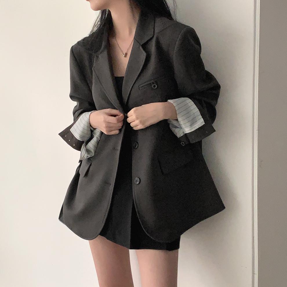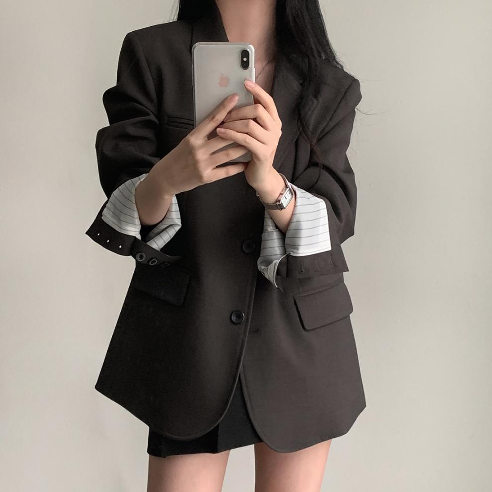 Chaqueta de Traje Coreana para Mujer Dongdaemun de Alta Calidad Chic Elegante Contrastante Holgada de Un Solo Botón de Manga Larga