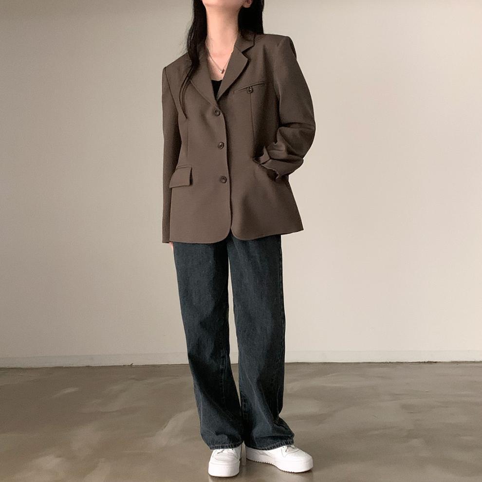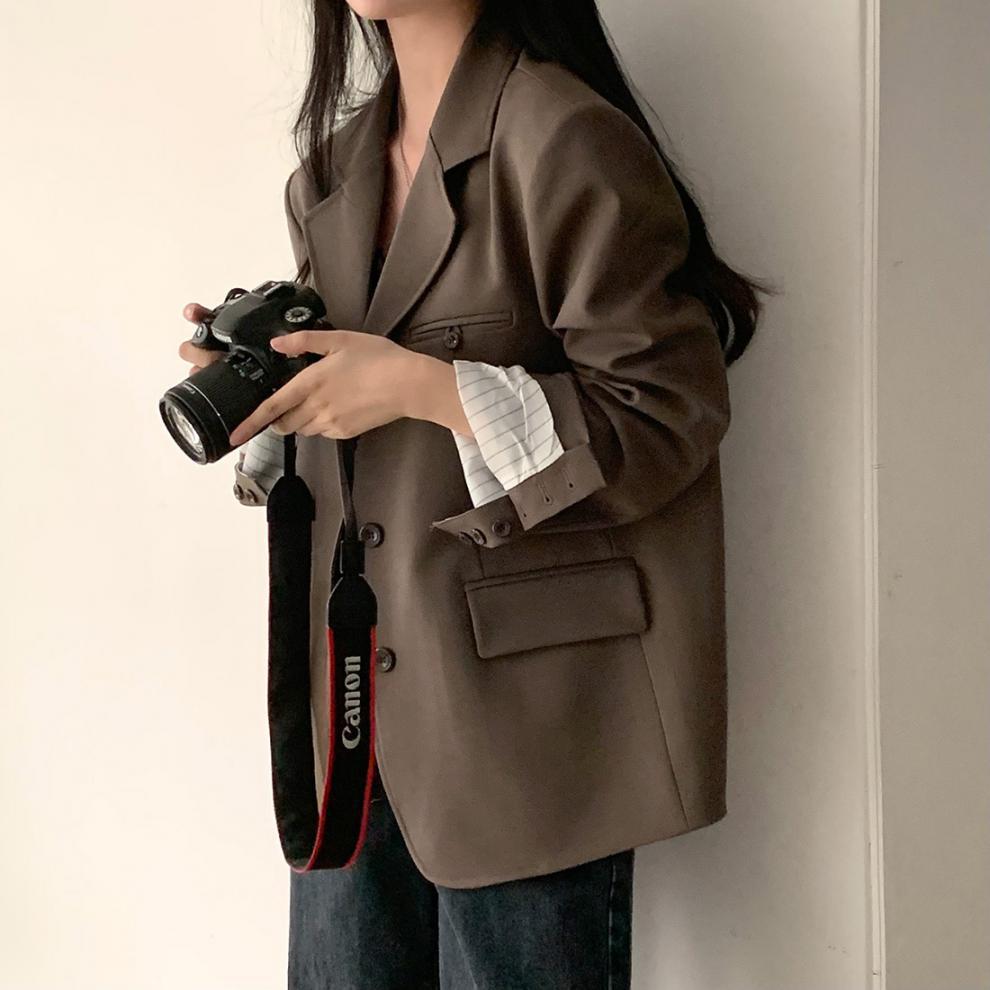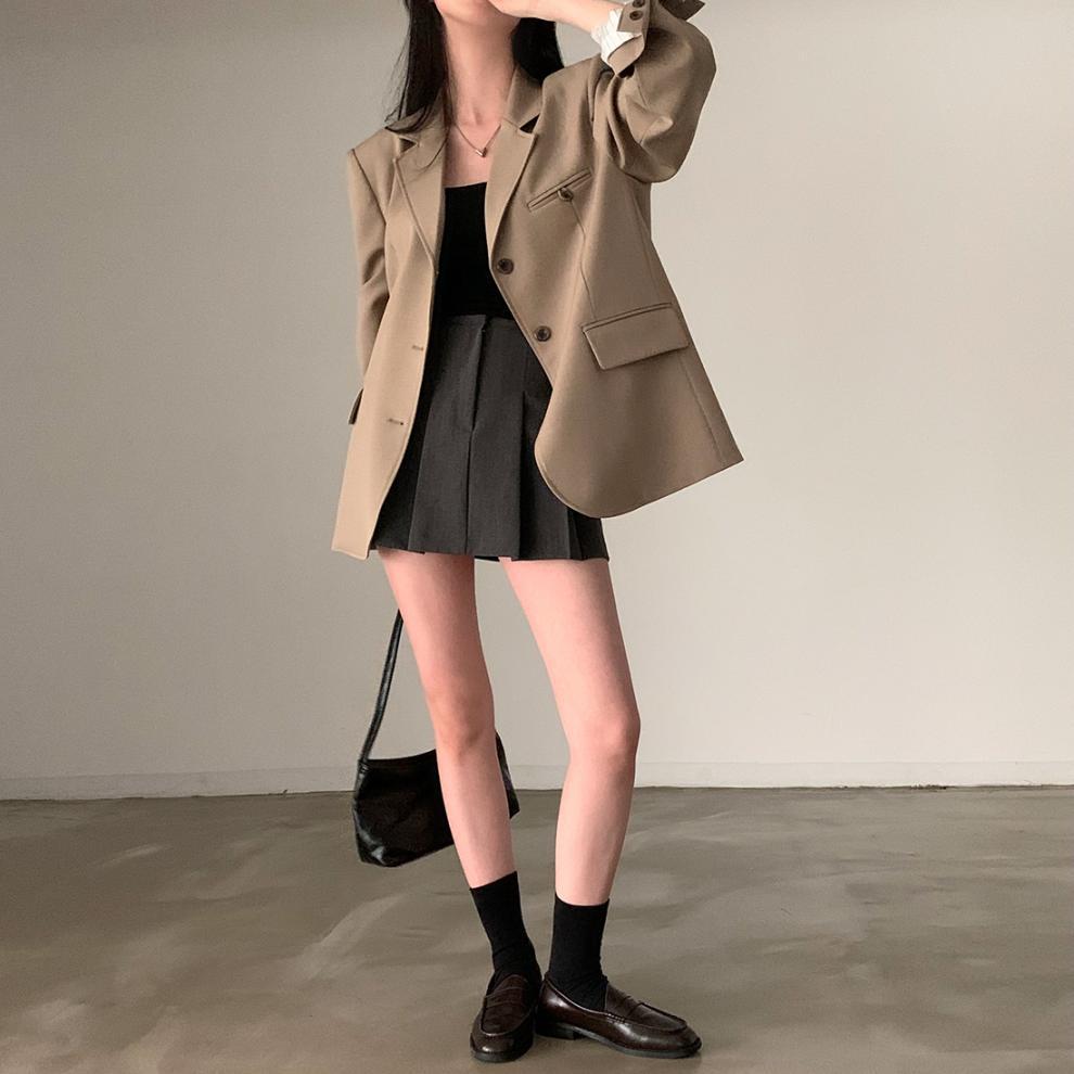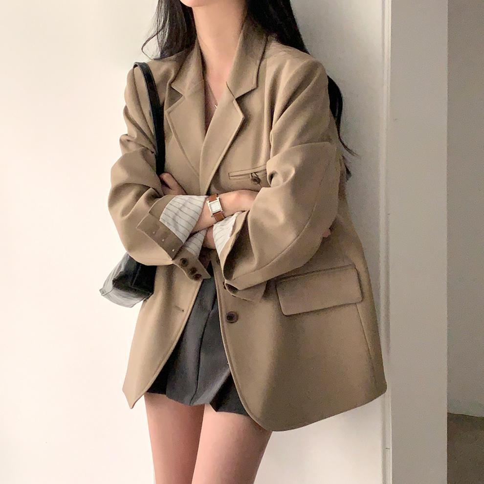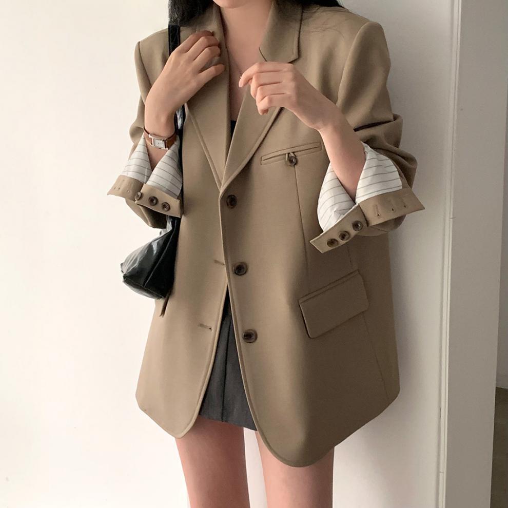 Chaqueta de Traje Coreana para Mujer Dongdaemun de Alta Calidad Chic Elegante Contrastante Holgada de Un Solo Botón de Manga Larga