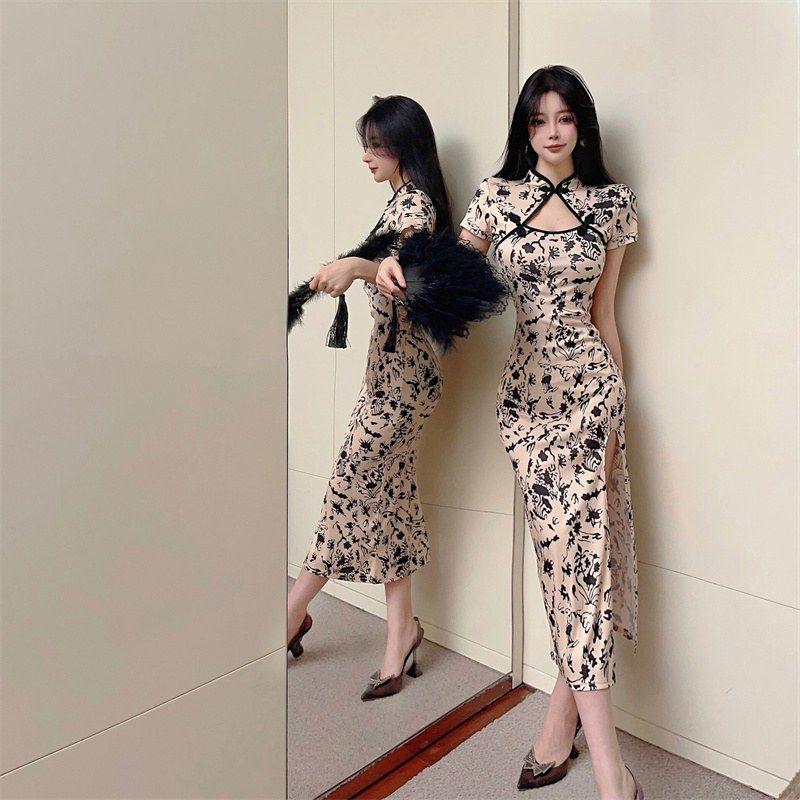 Cheongsam mejorado para mujer, Estilo joven de verano, Aspecto adelgazante y que cubre la carne, Falda única de nicho, Vestido retro estampado