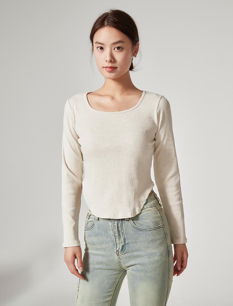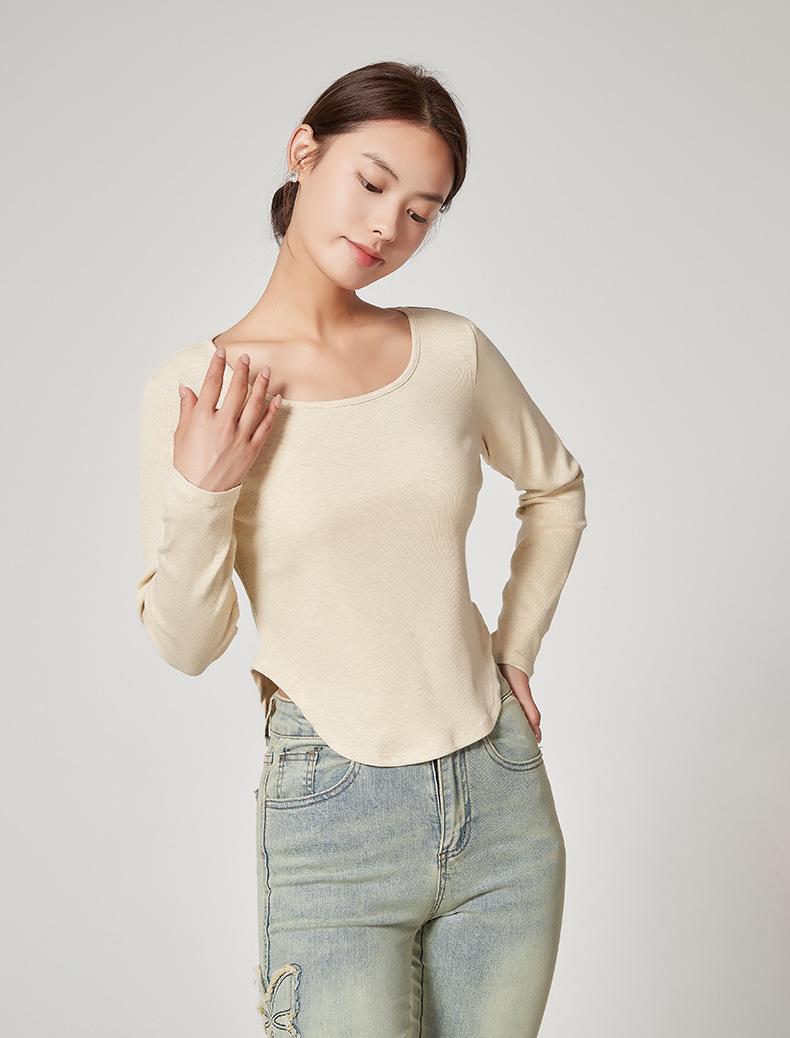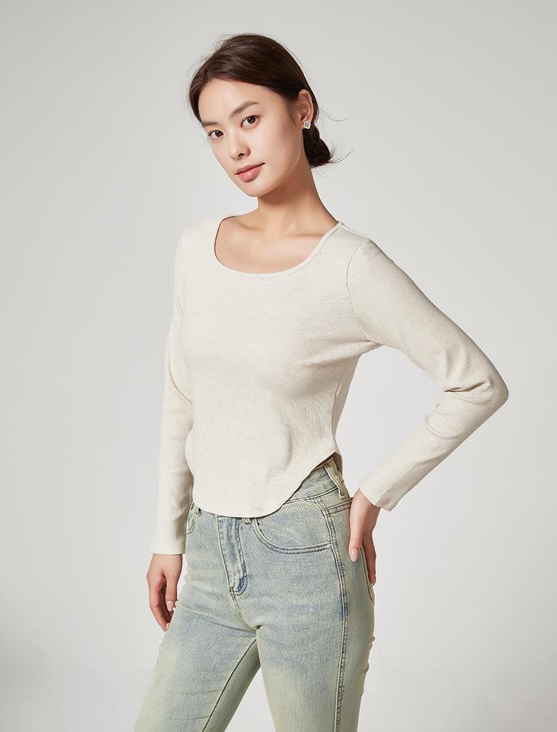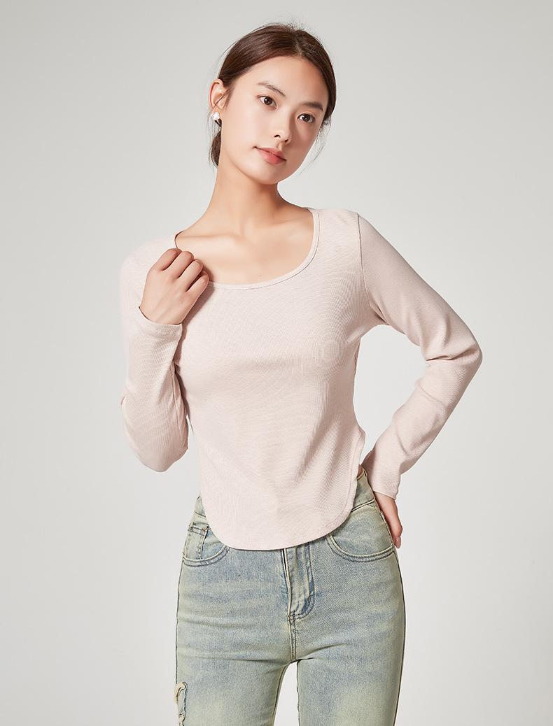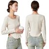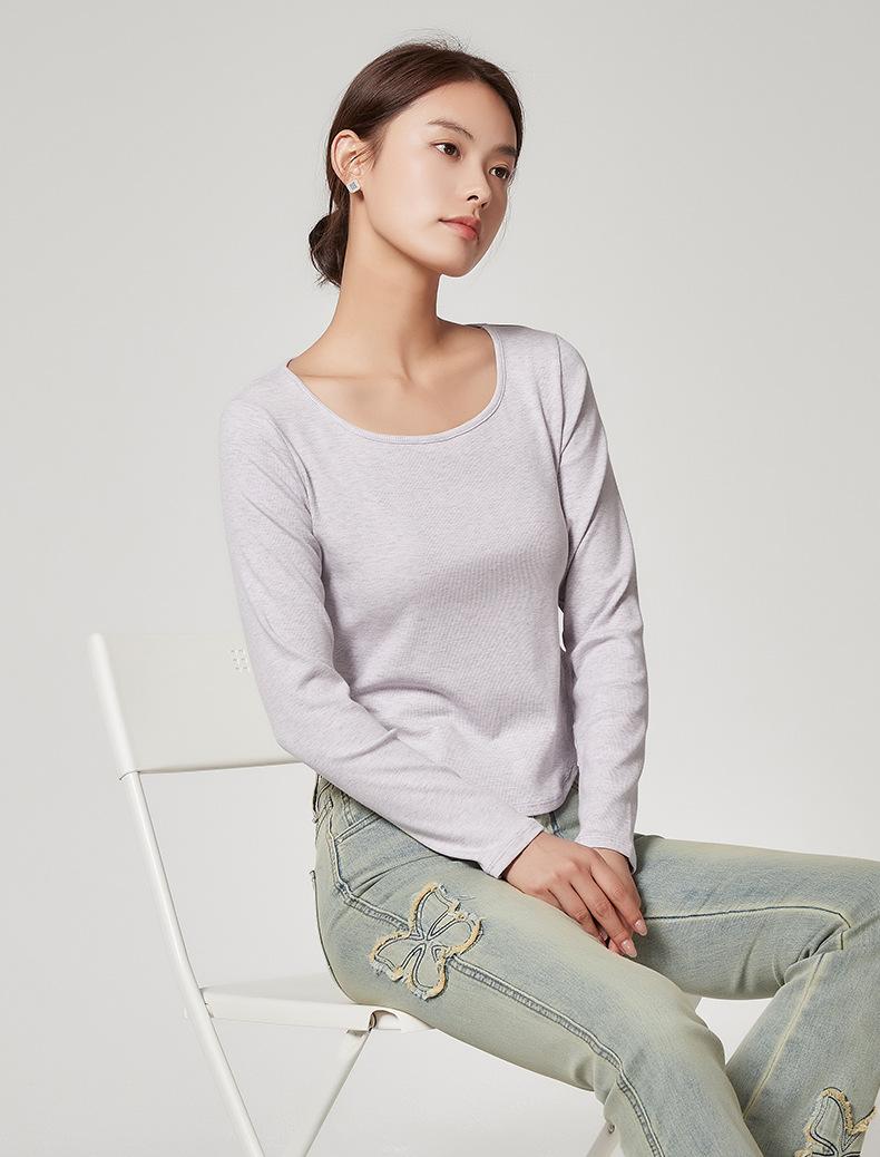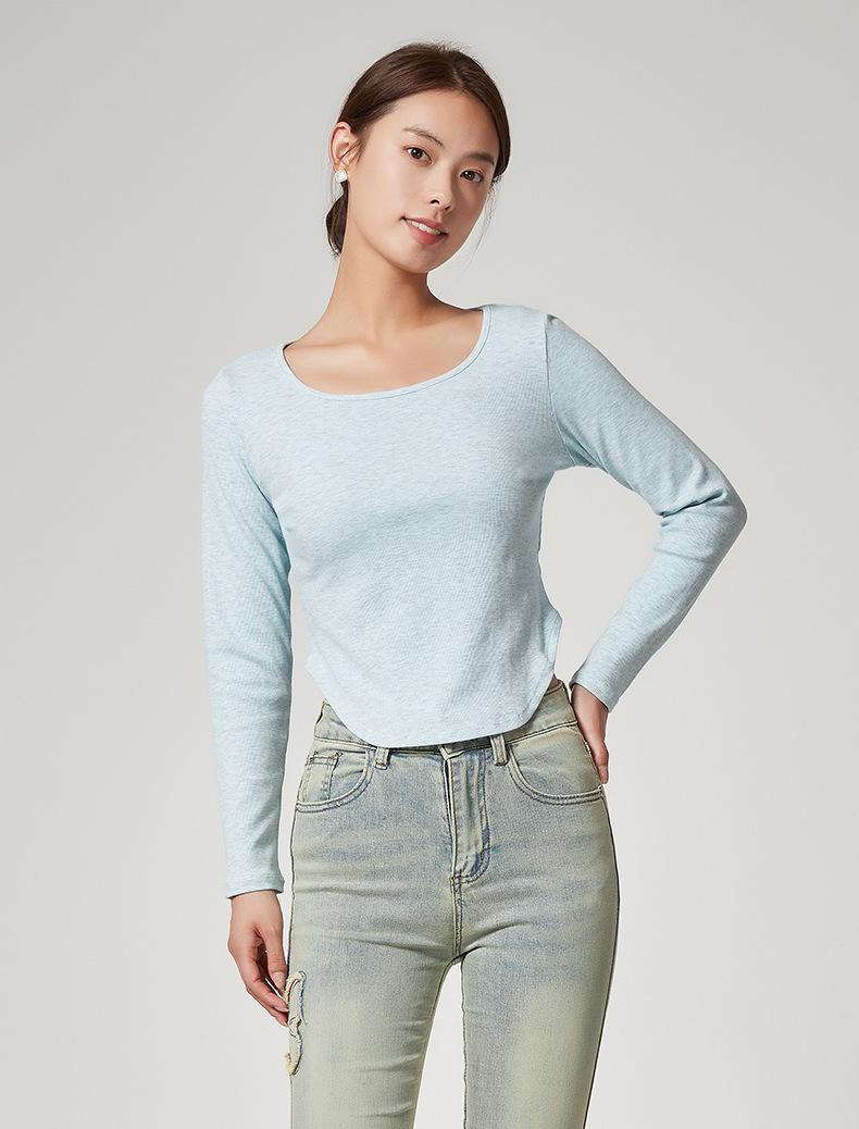Camiseta Básica de Manga Larga con Patrón de Seda para Mujer Primavera Casual Color Puro Slim Camiseta Estilo Preppy Top Transfronterizo Trbottomyy Se Puede Usar Afuera