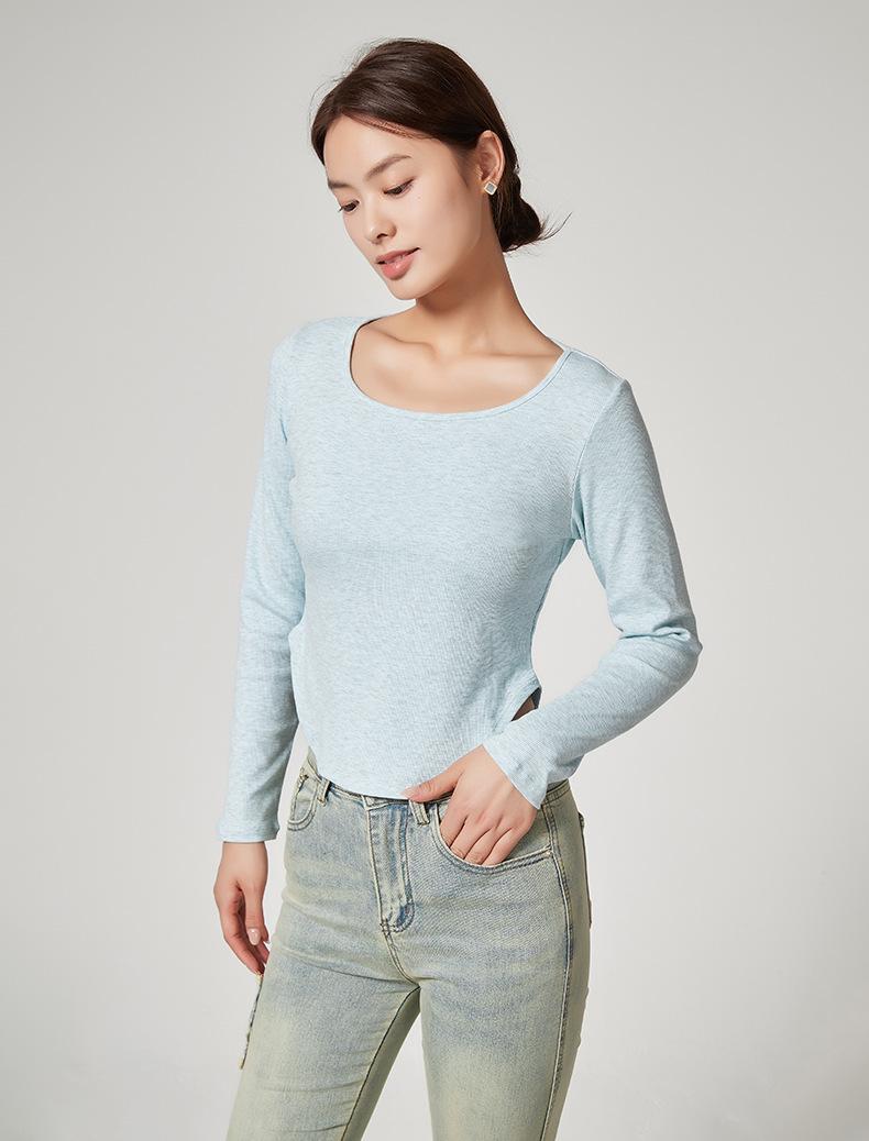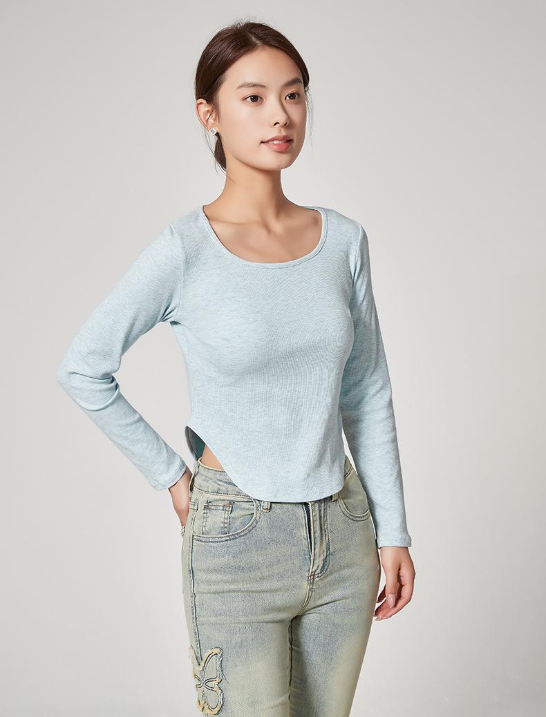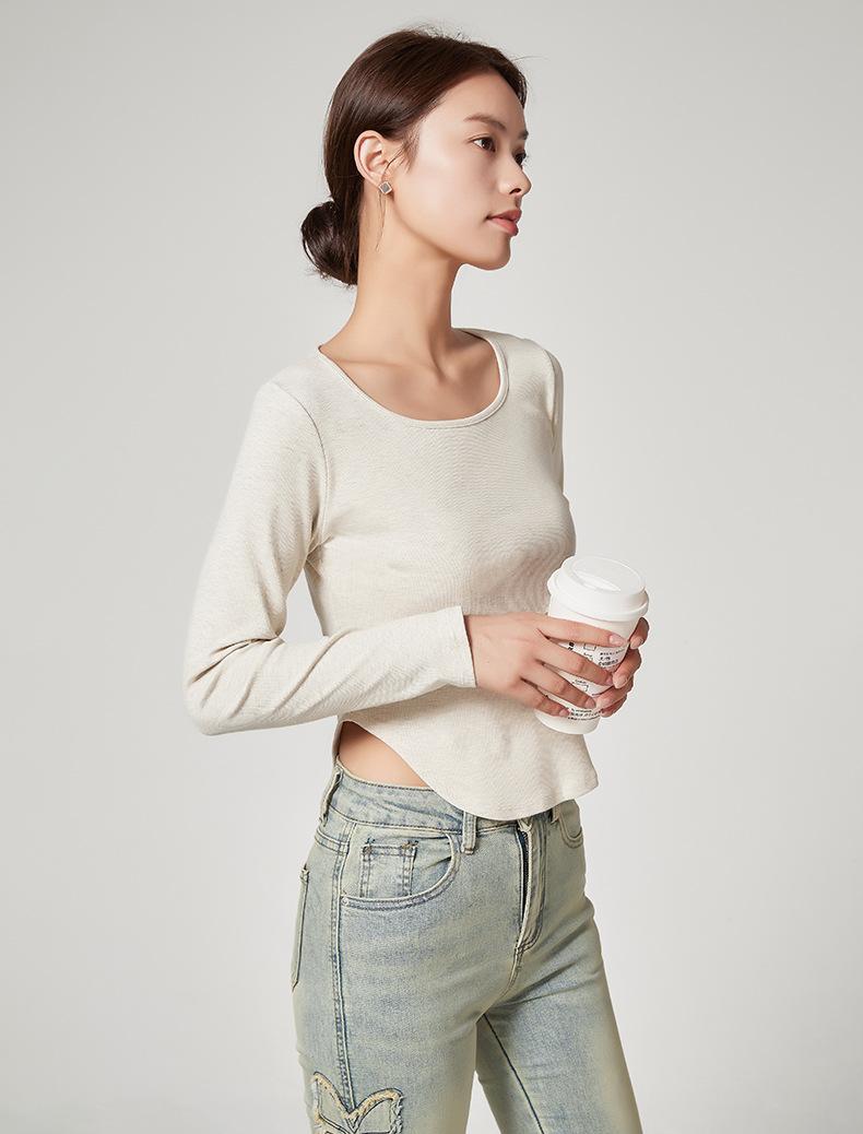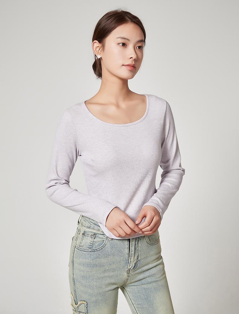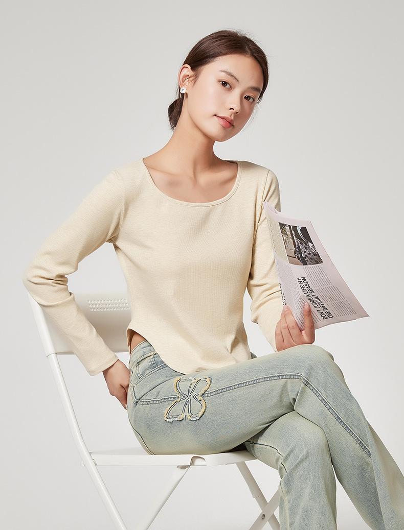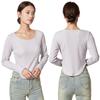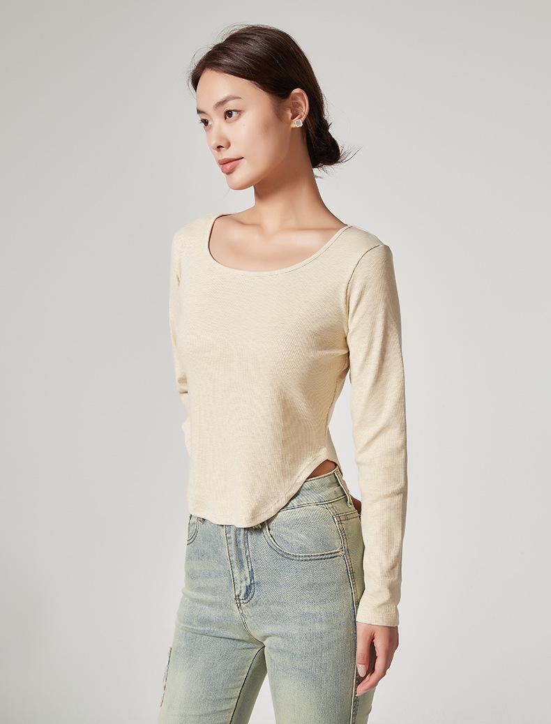 Camiseta Básica de Manga Larga con Patrón de Seda para Mujer Primavera Casual Color Puro Slim Camiseta Estilo Preppy Top Transfronterizo Trbottomyy Se Puede Usar Afuera