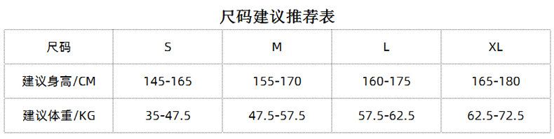 S (recommended 35-47.5kg ), M (recommended 47.5-57.5kg ), L (recommended 57.5-62.5kg ), Xl (recommended 62.5-72.5kg )