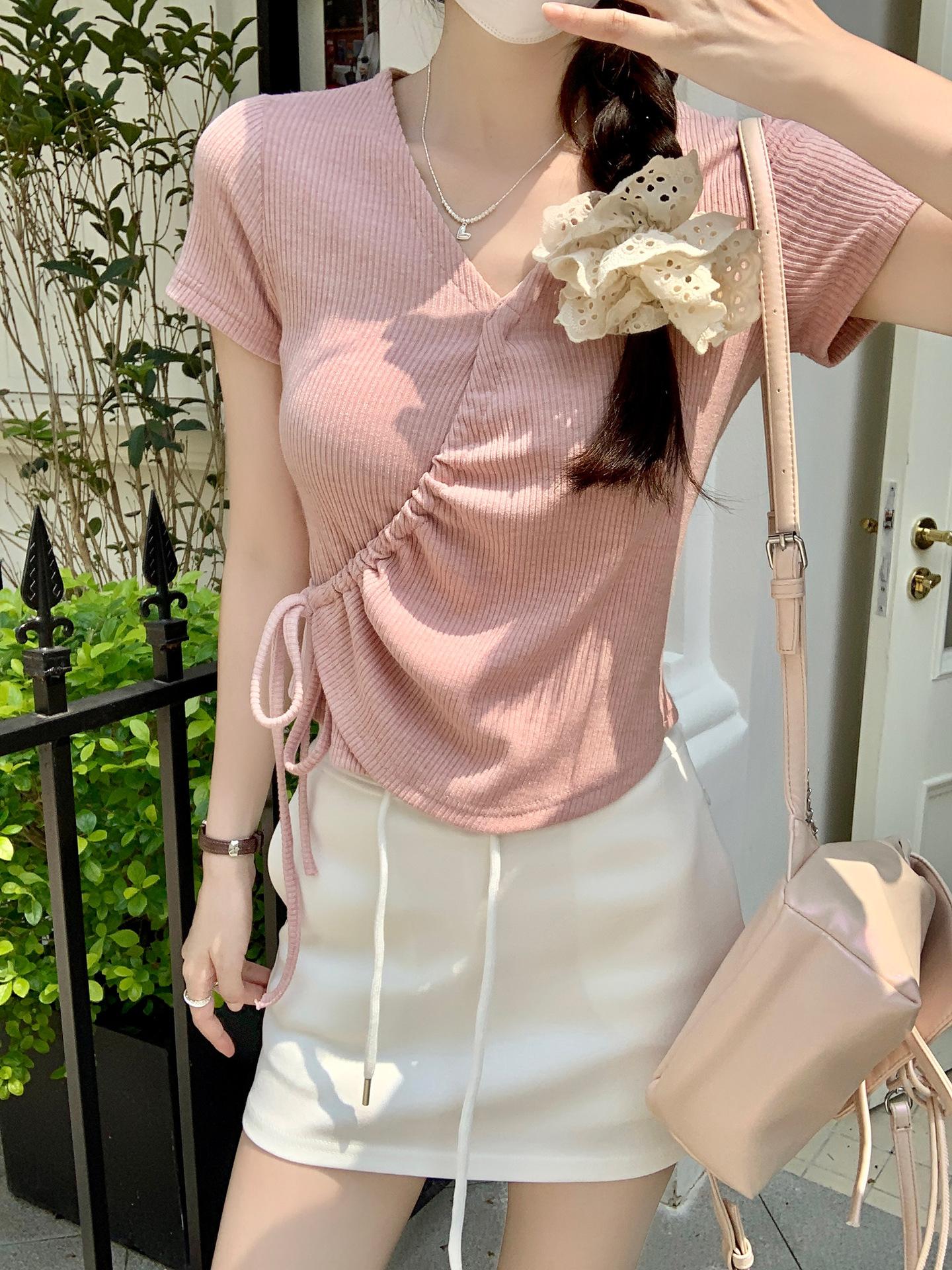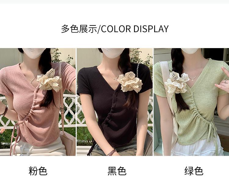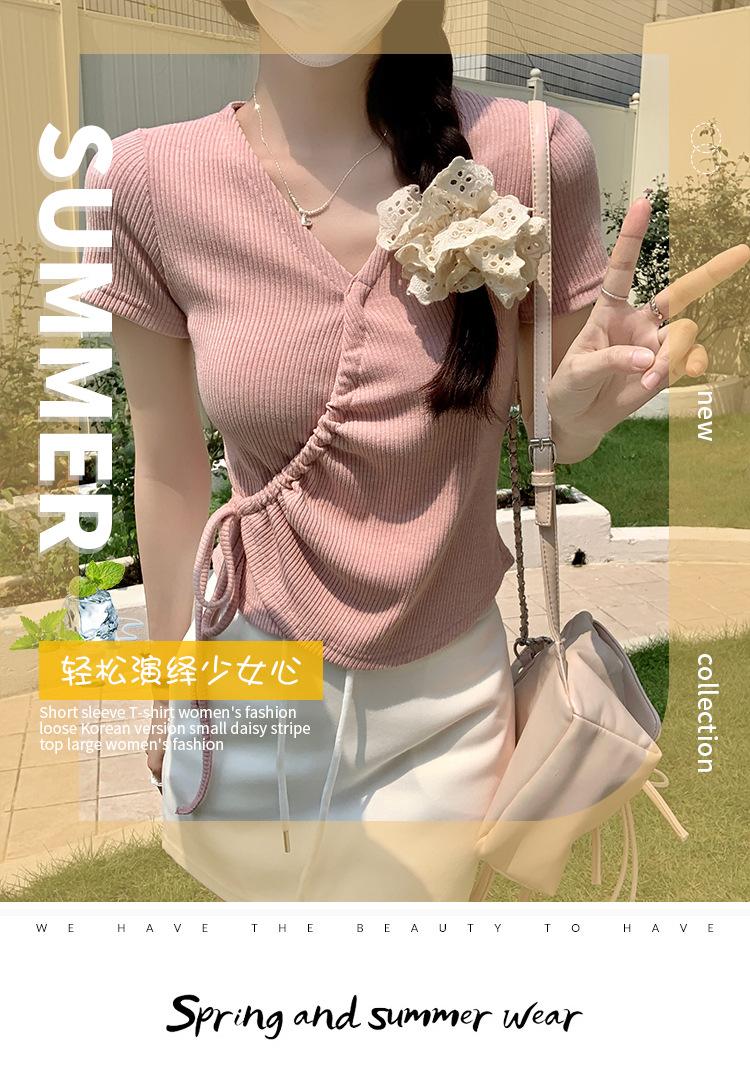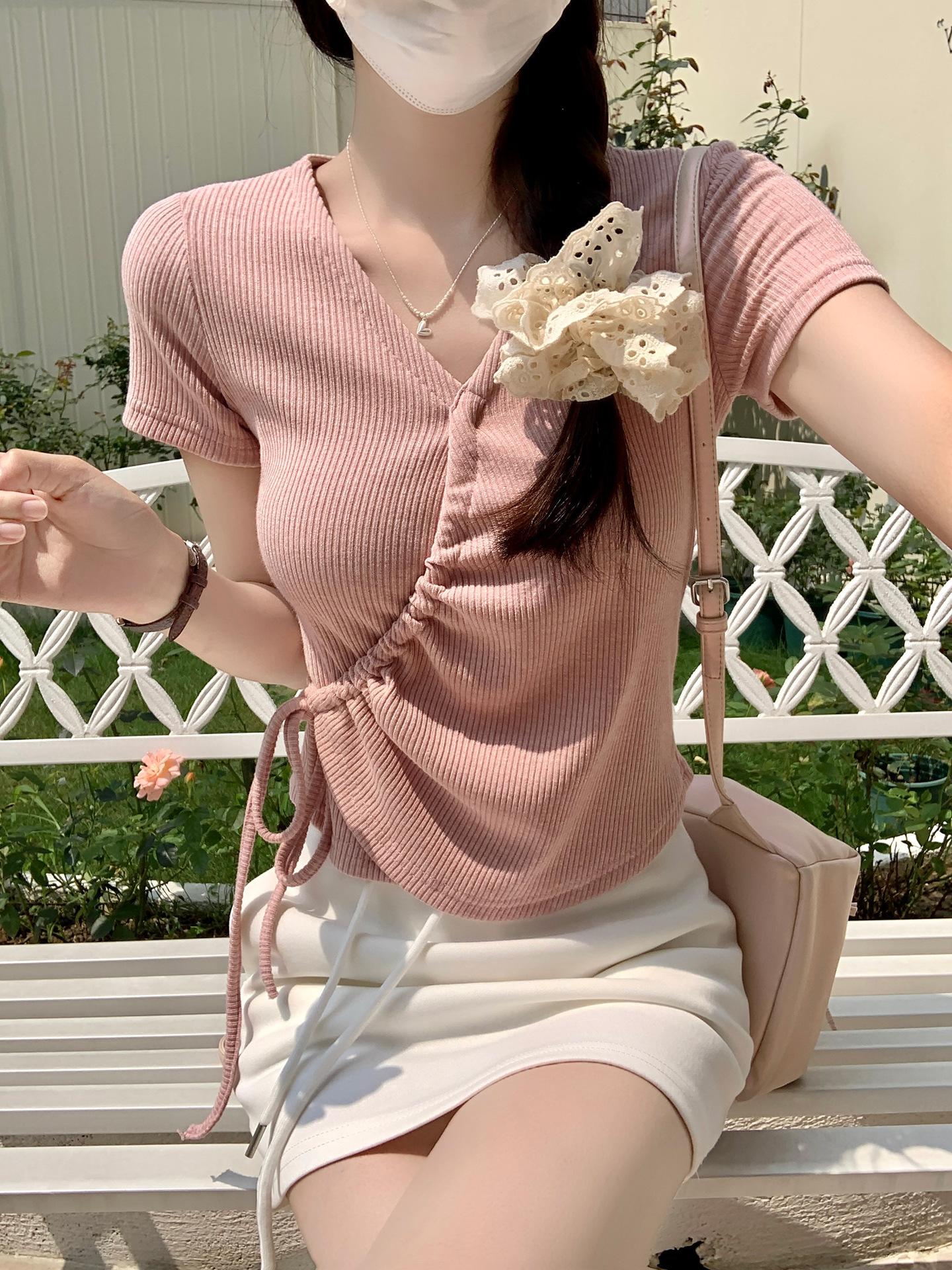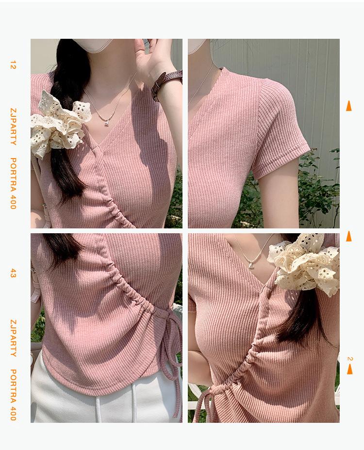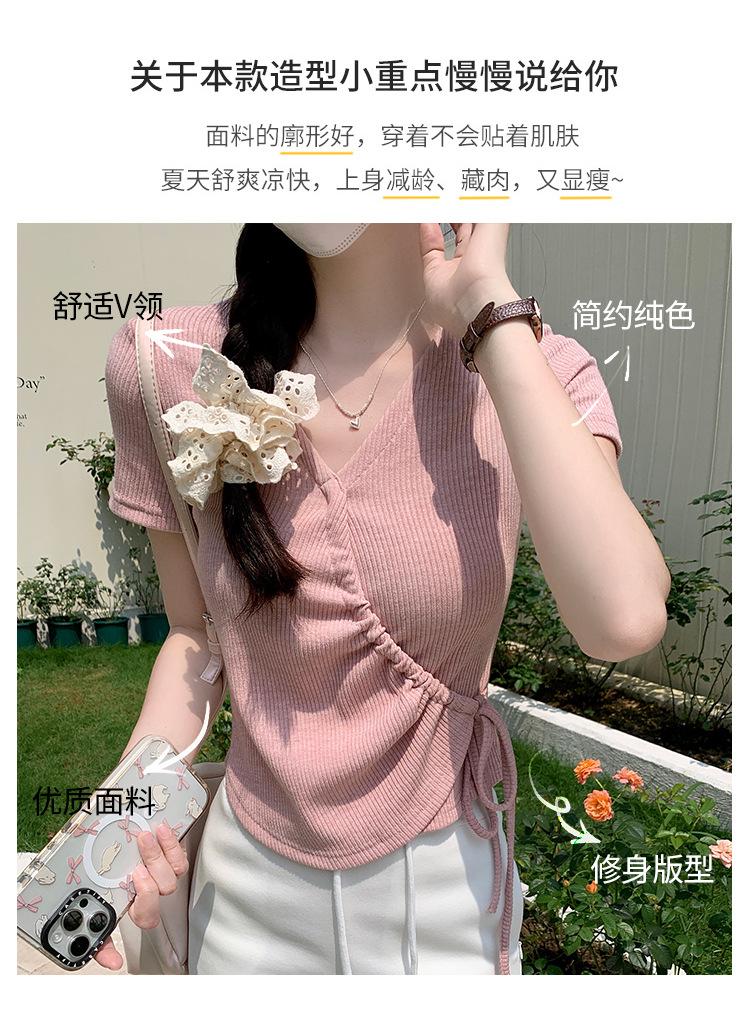 Camiseta de manga corta con cuello en V y cordón ajustable para mujer, diseño veraniego, corte entallado, irregular, de alta gama, con hombros descubiertos
