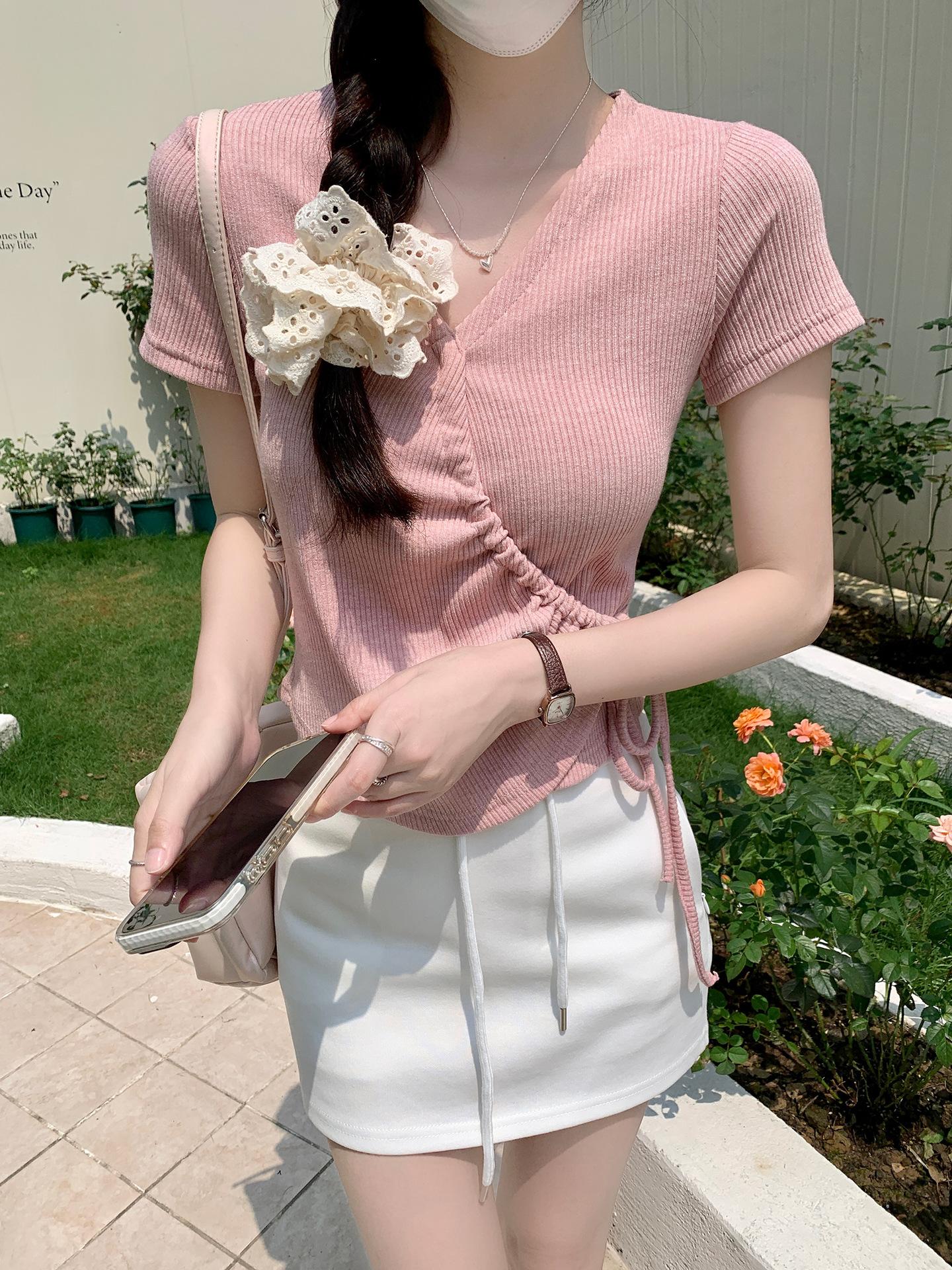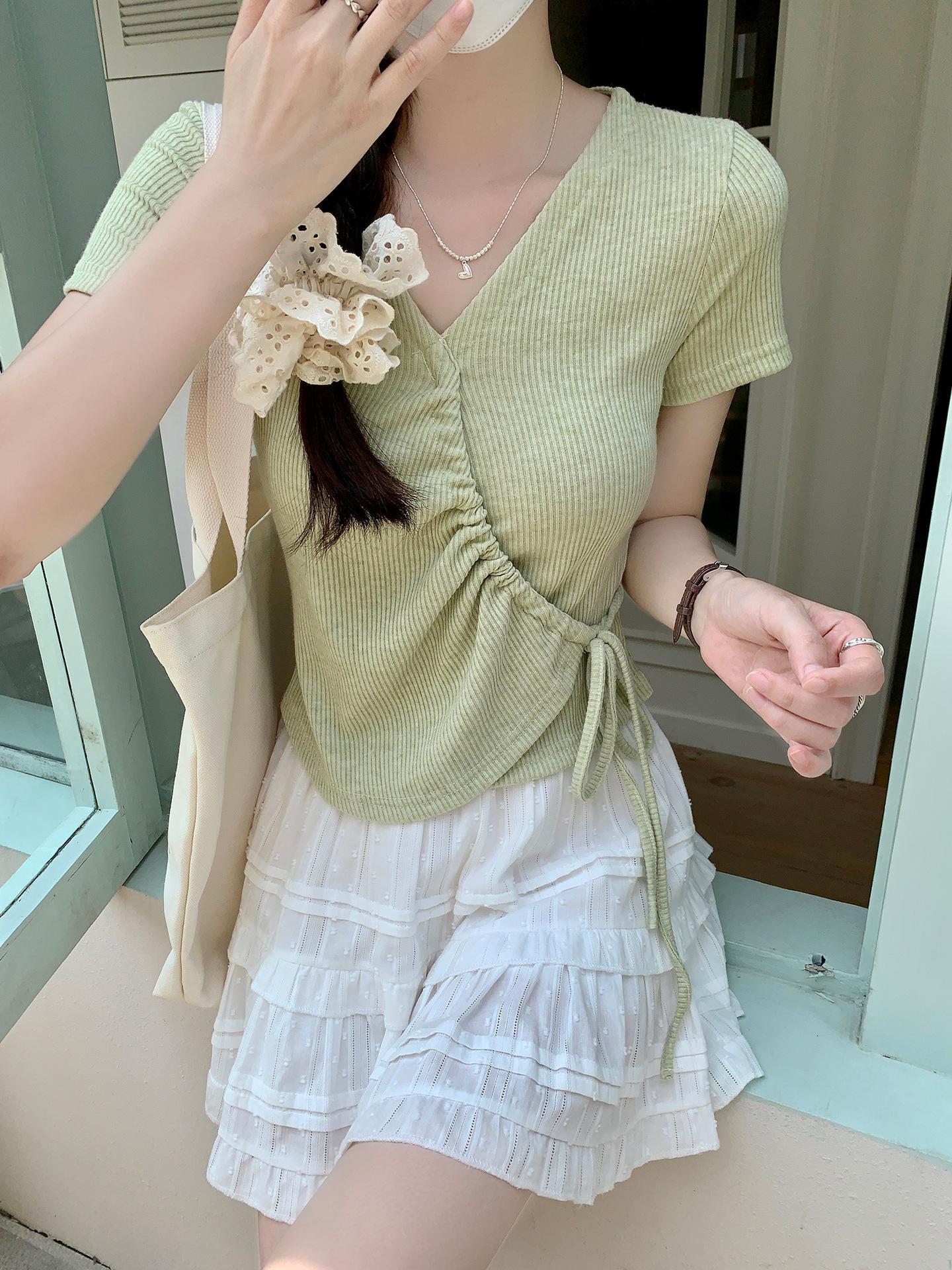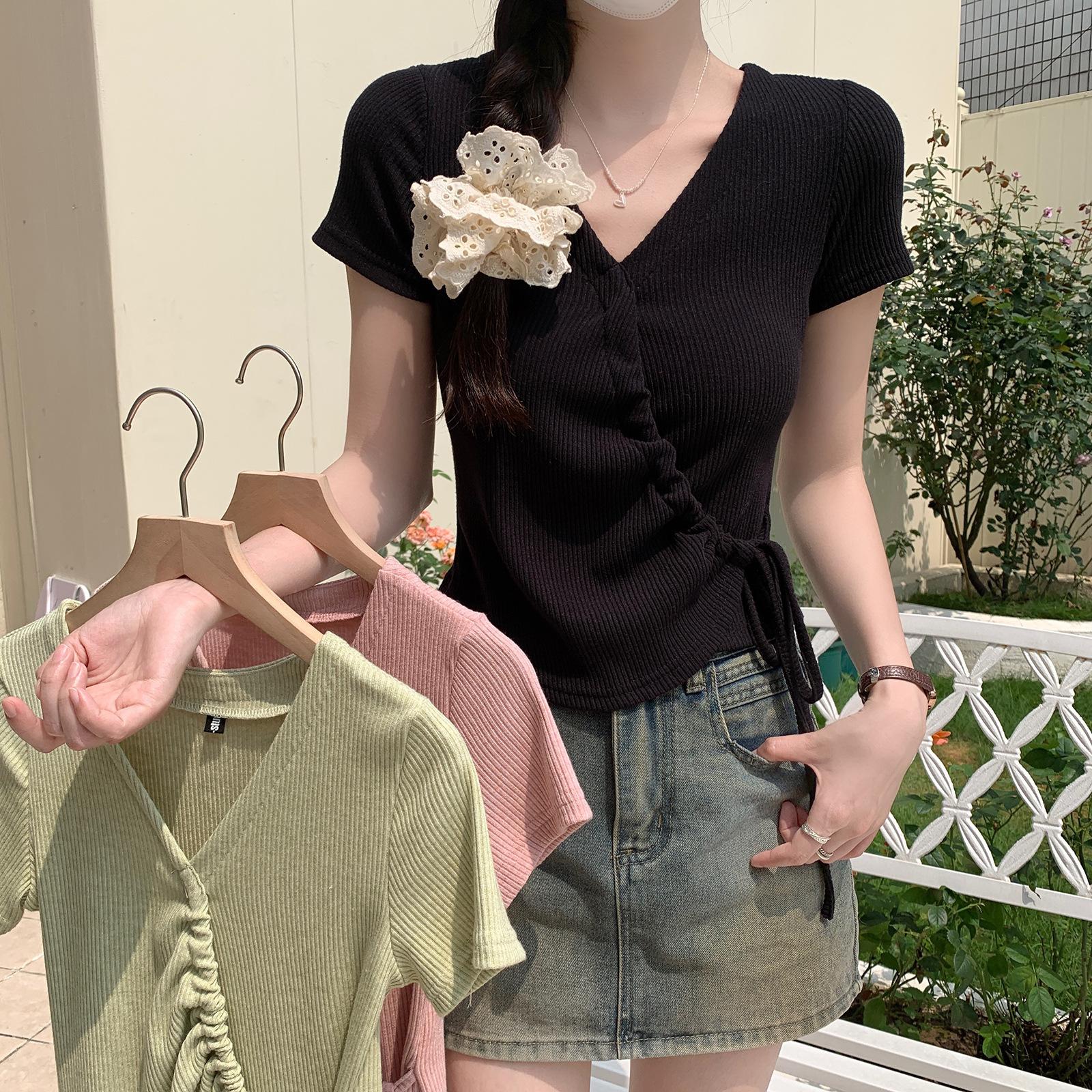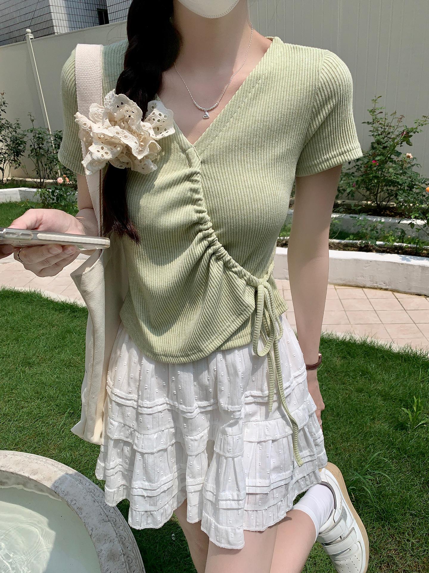Camiseta de manga corta con cuello en V y cordón ajustable para mujer, diseño veraniego, corte entallado, irregular, de alta gama, con hombros descubiertos