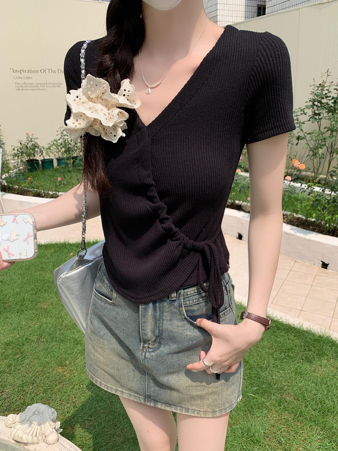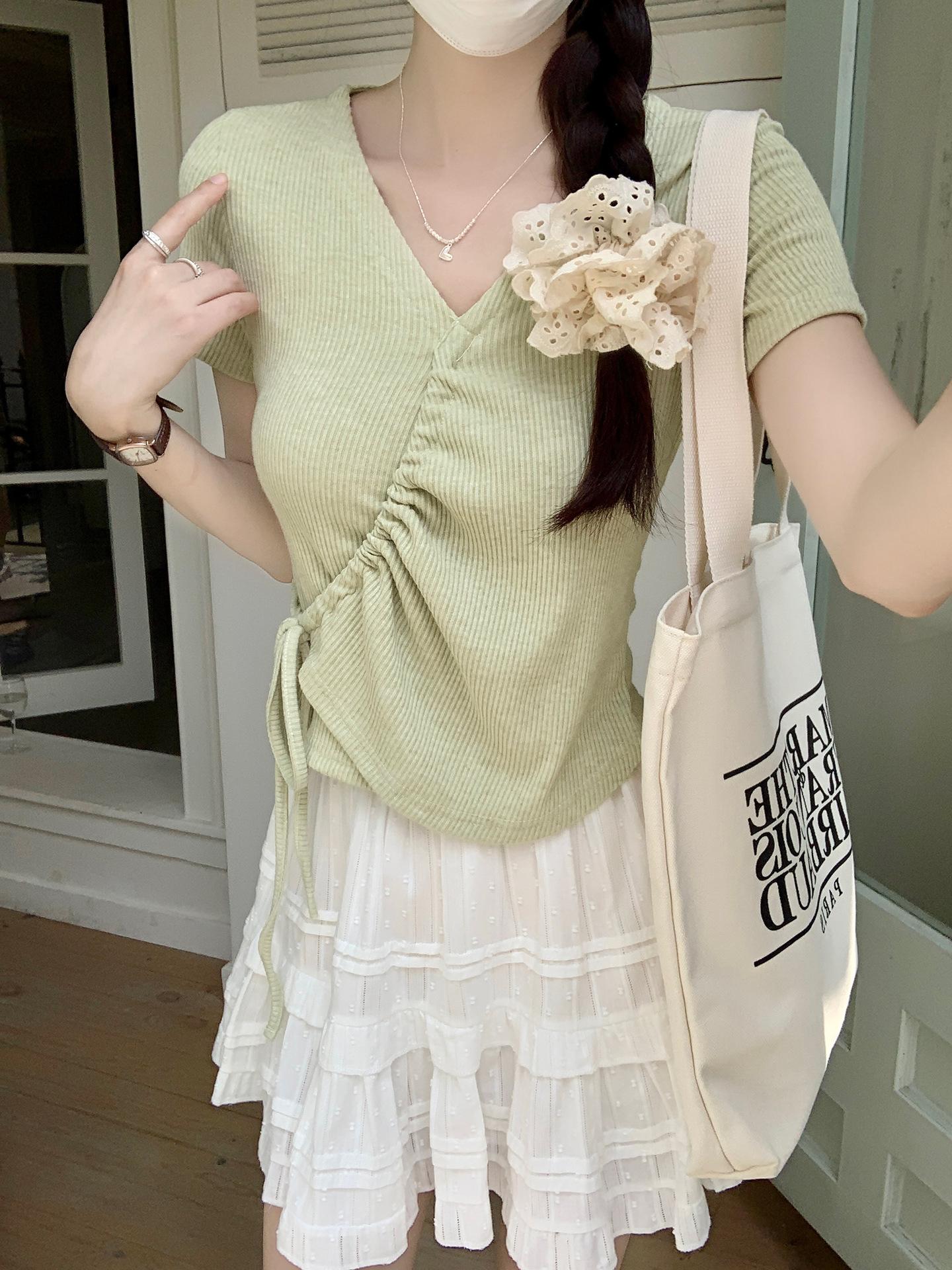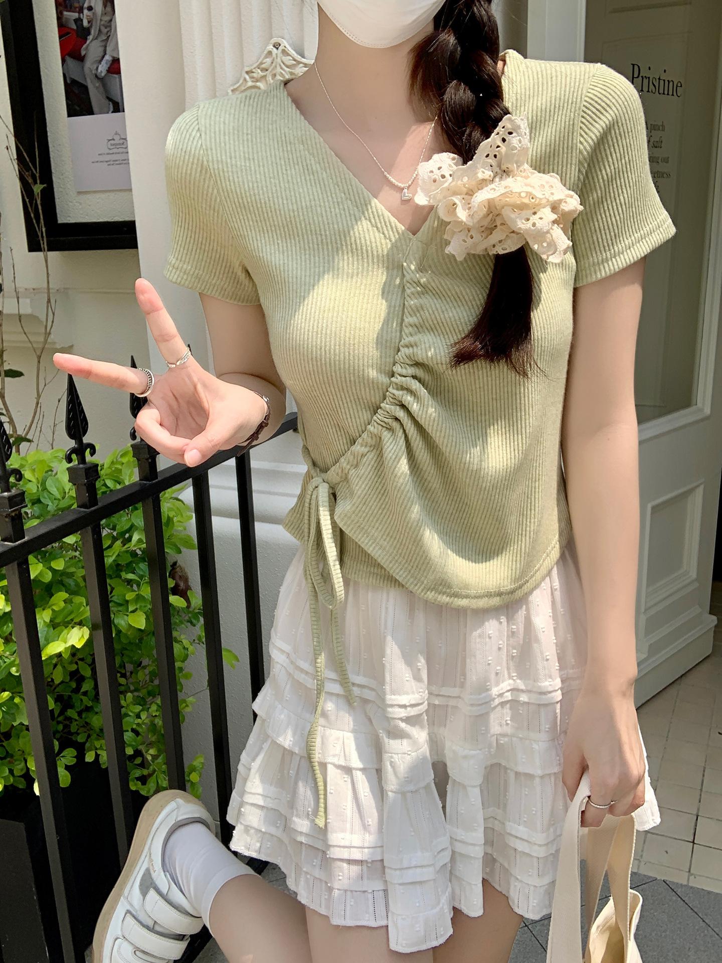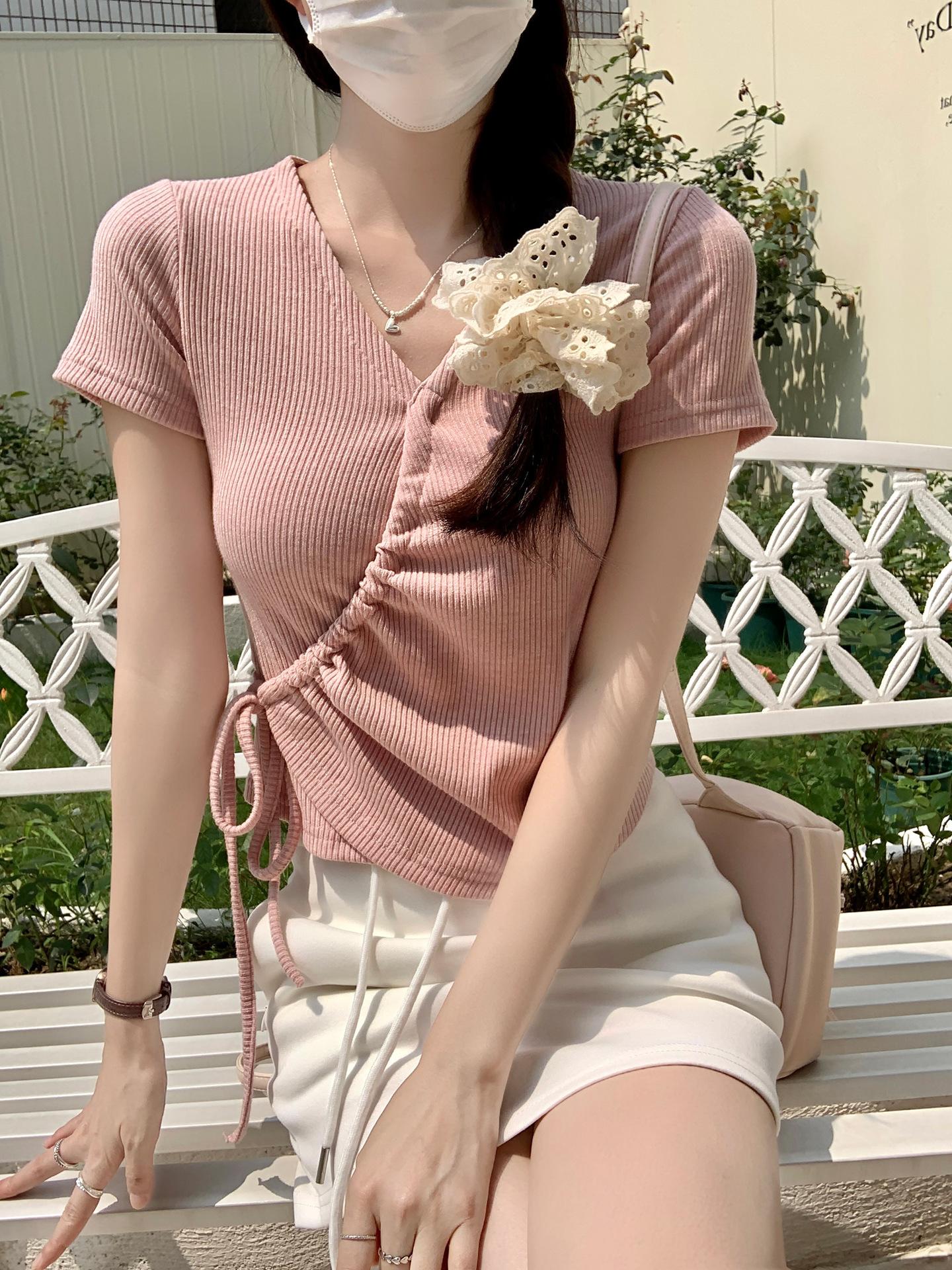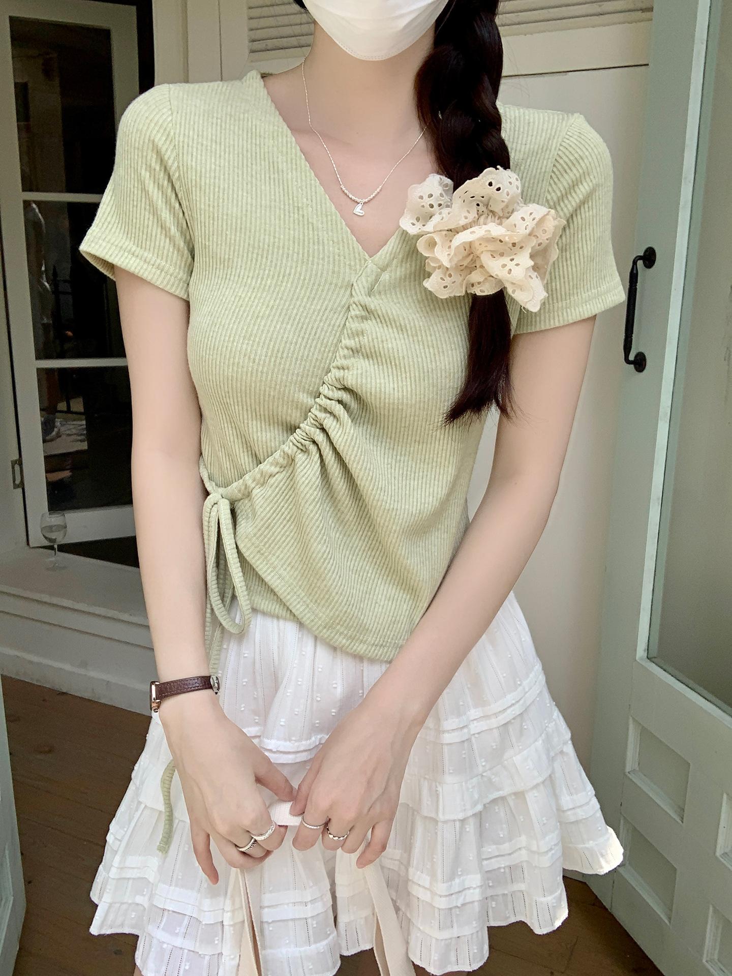 Camiseta de manga corta con cuello en V y cordón ajustable para mujer, diseño veraniego, corte entallado, irregular, de alta gama, con hombros descubiertos