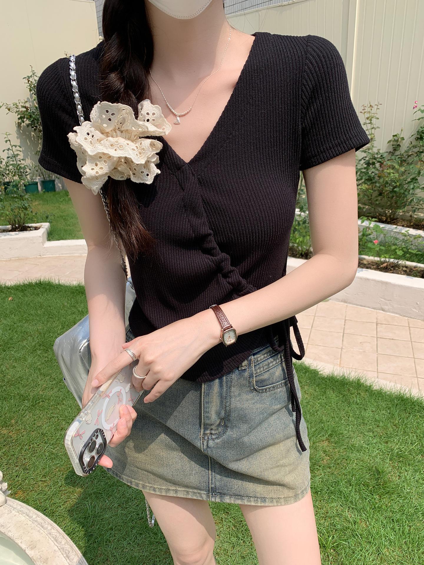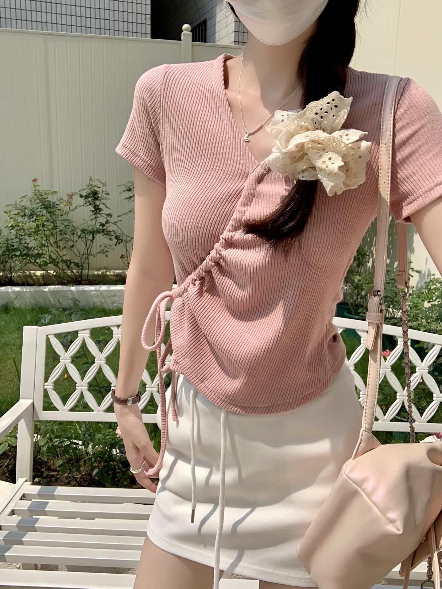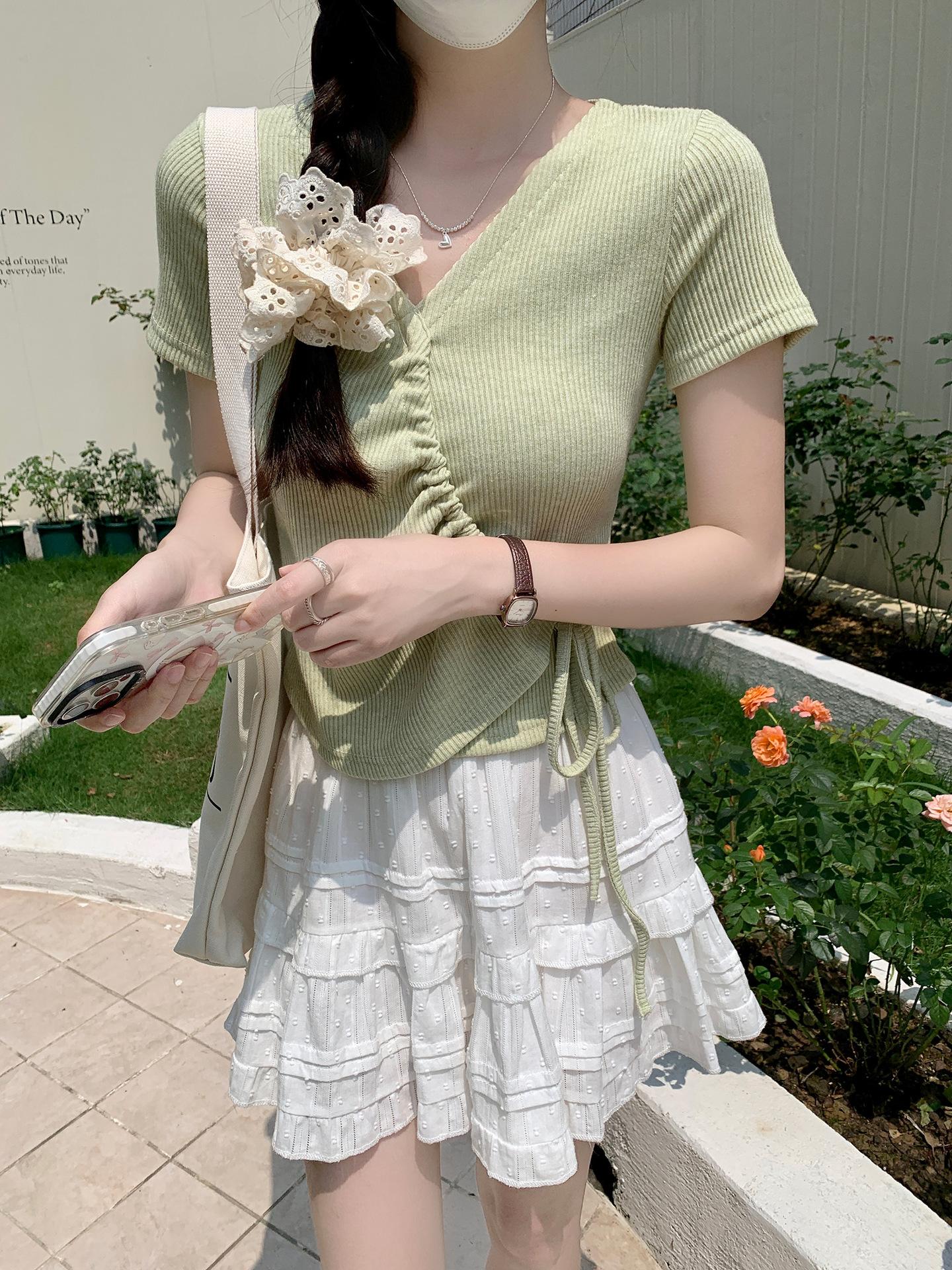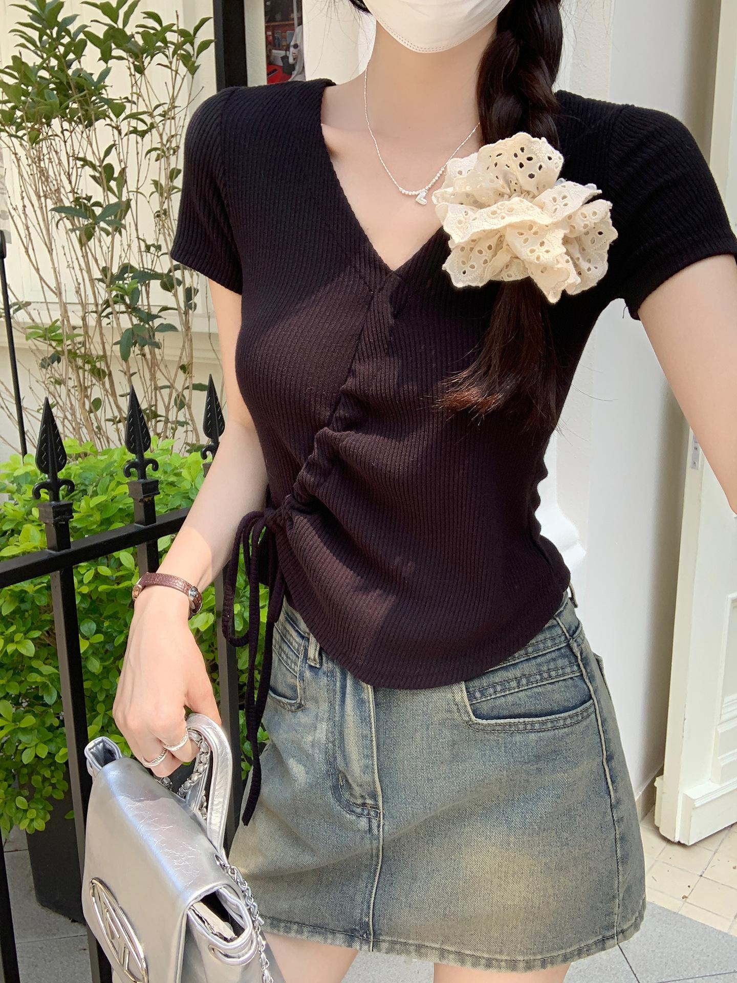 Camiseta de manga corta con cuello en V y cordón ajustable para mujer, diseño veraniego, corte entallado, irregular, de alta gama, con hombros descubiertos