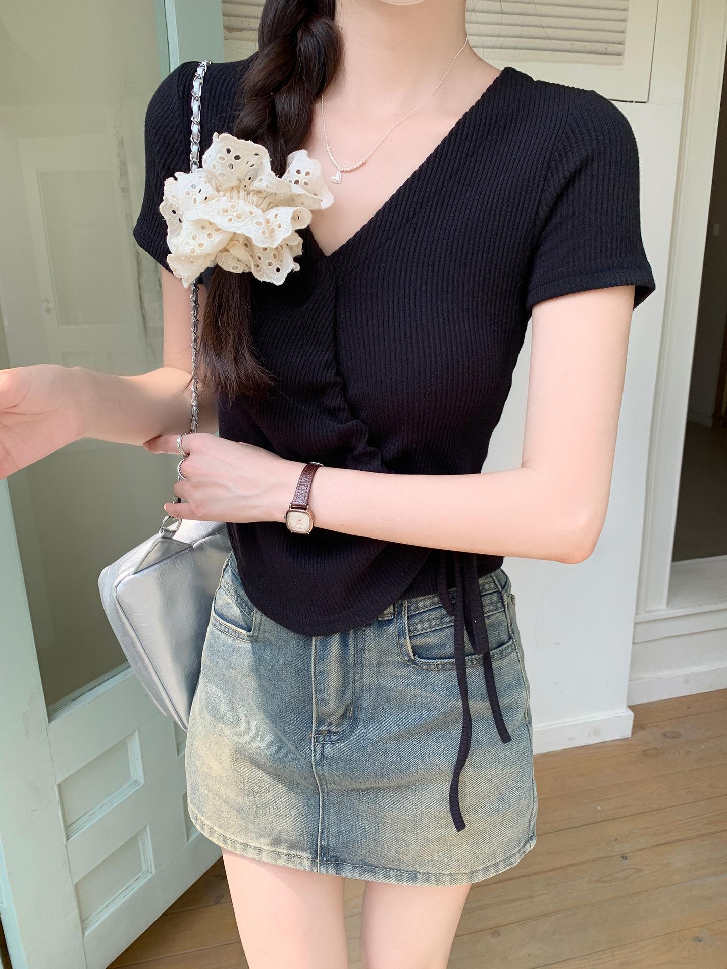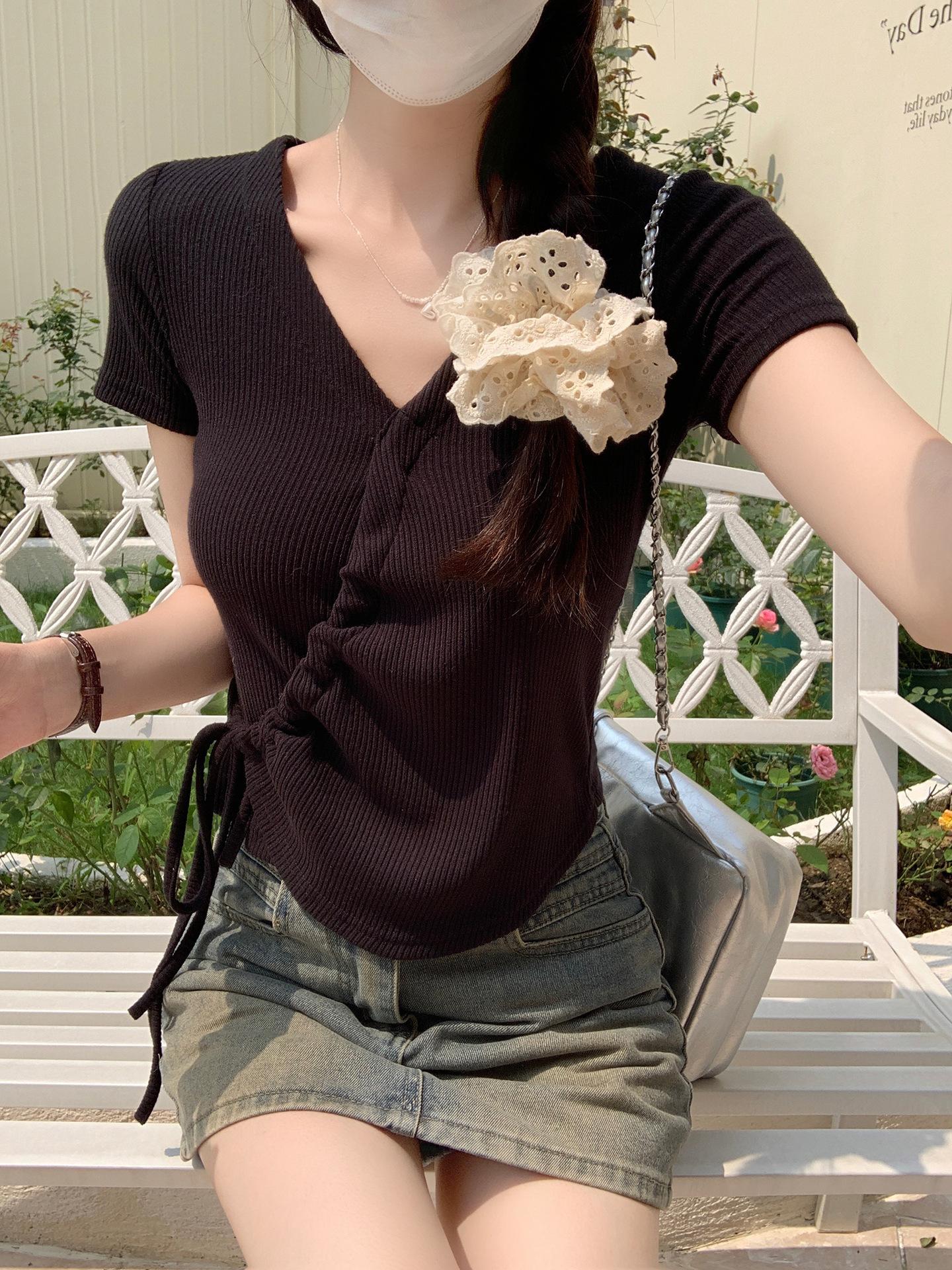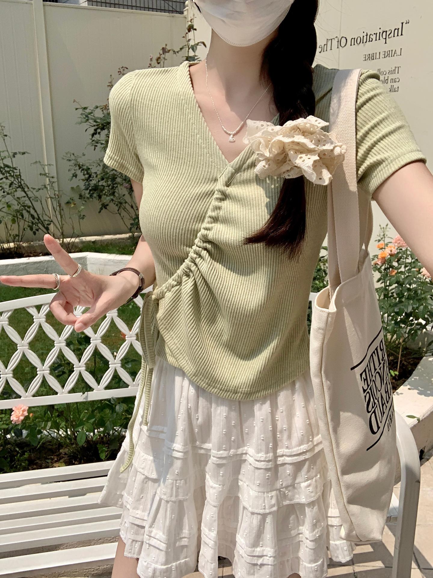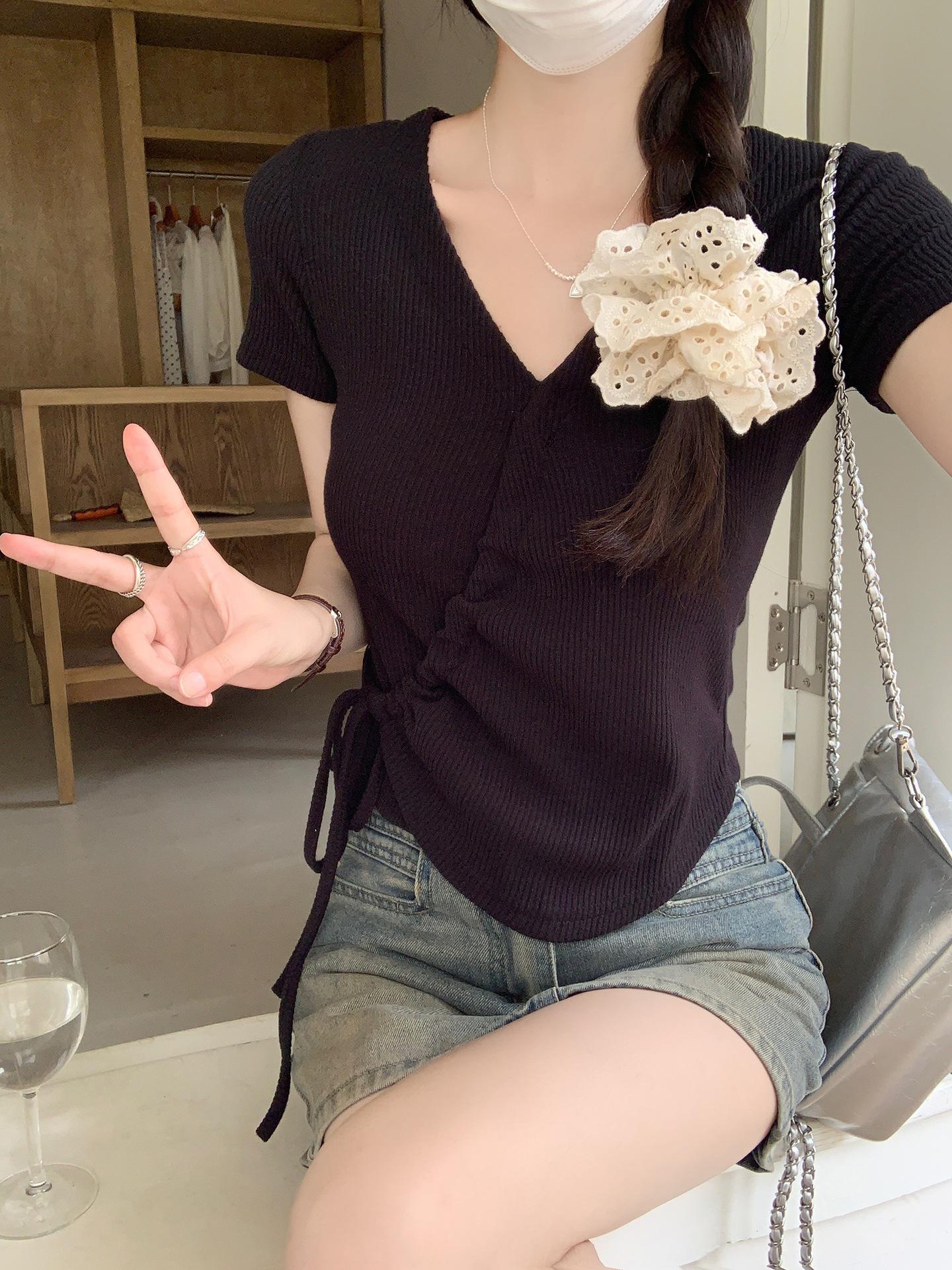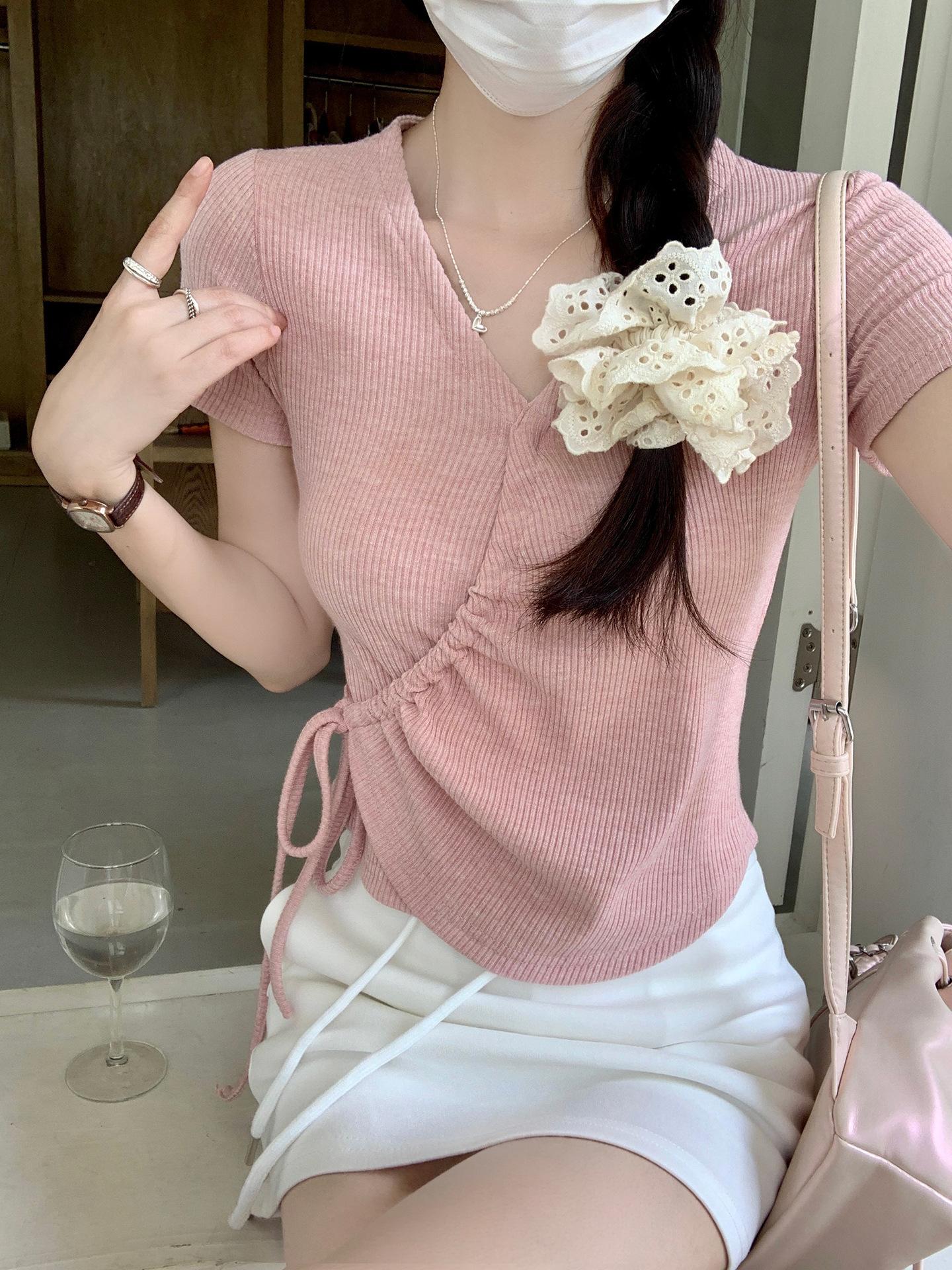 Camiseta de manga corta con cuello en V y cordón ajustable para mujer, diseño veraniego, corte entallado, irregular, de alta gama, con hombros descubiertos