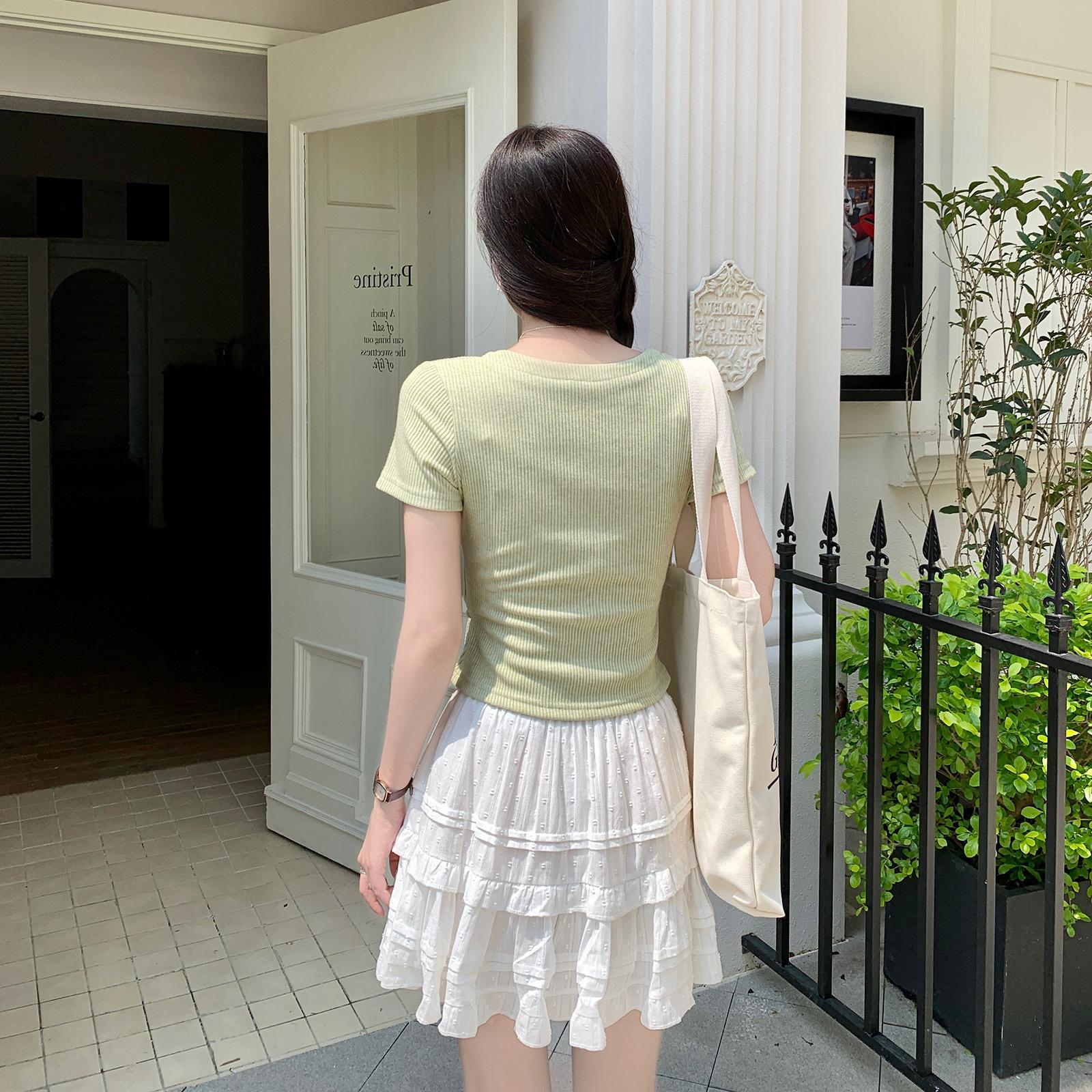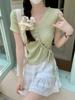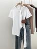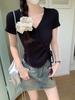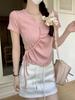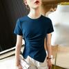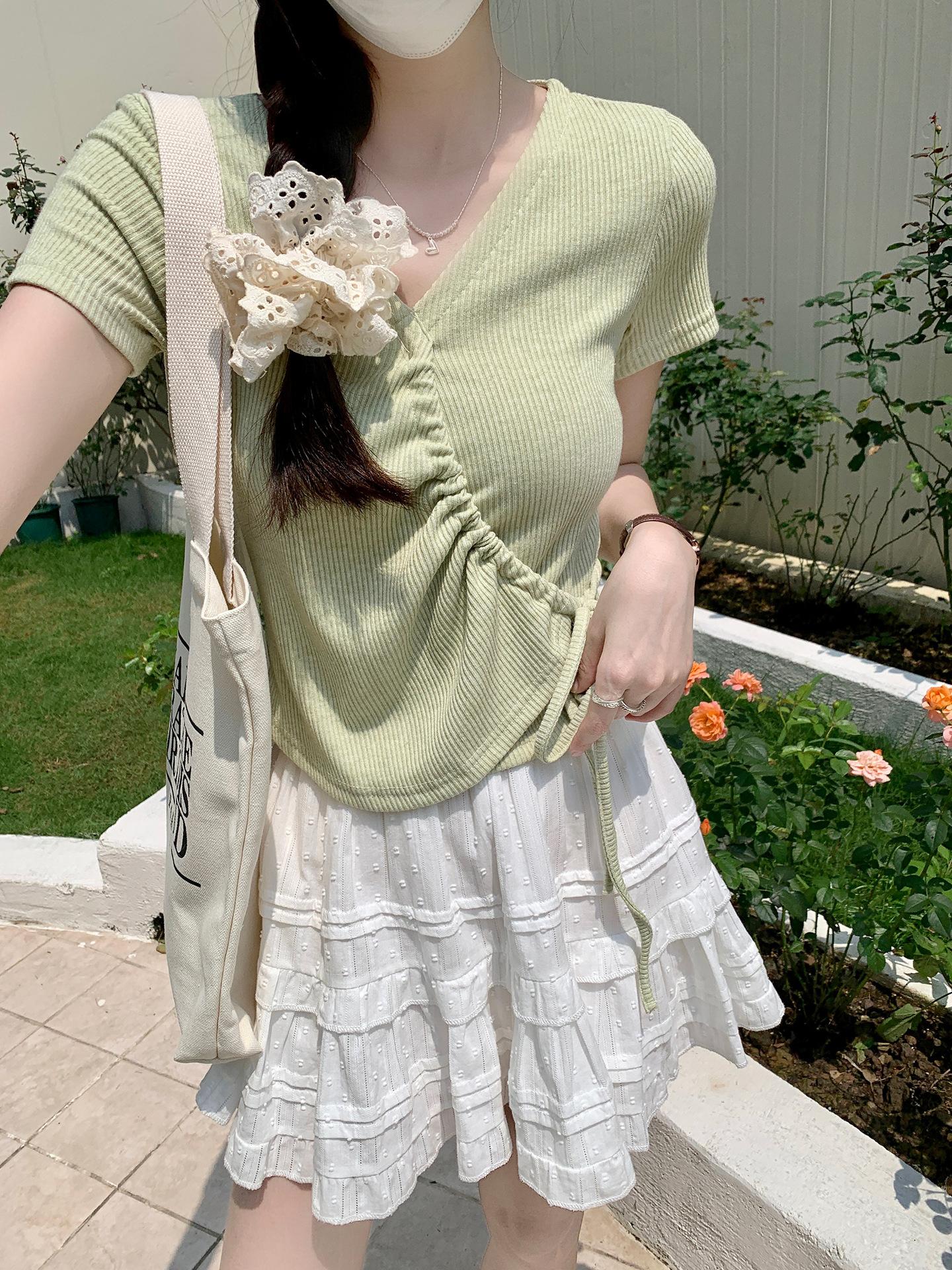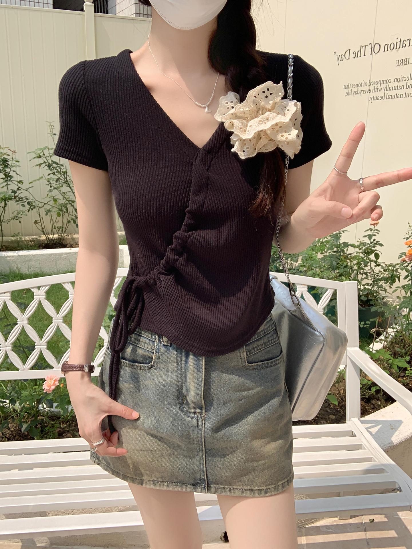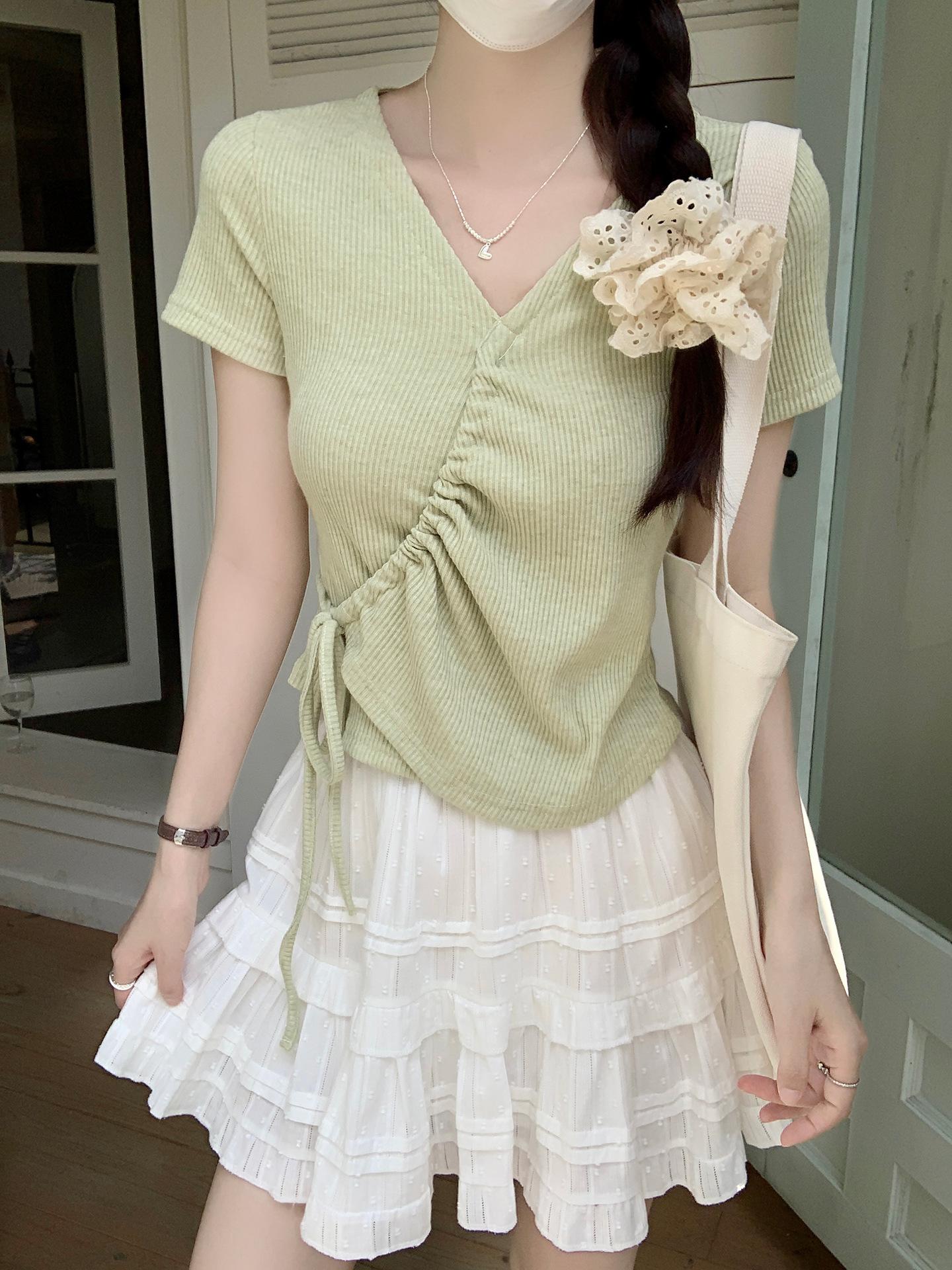 Camiseta de manga corta con cuello en V y cordón ajustable para mujer, diseño veraniego, corte entallado, irregular, de alta gama, con hombros descubiertos