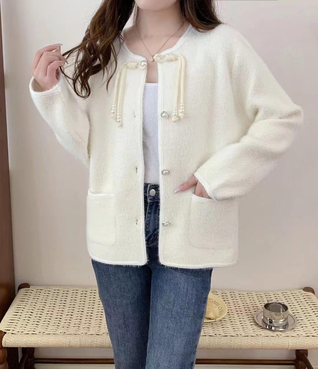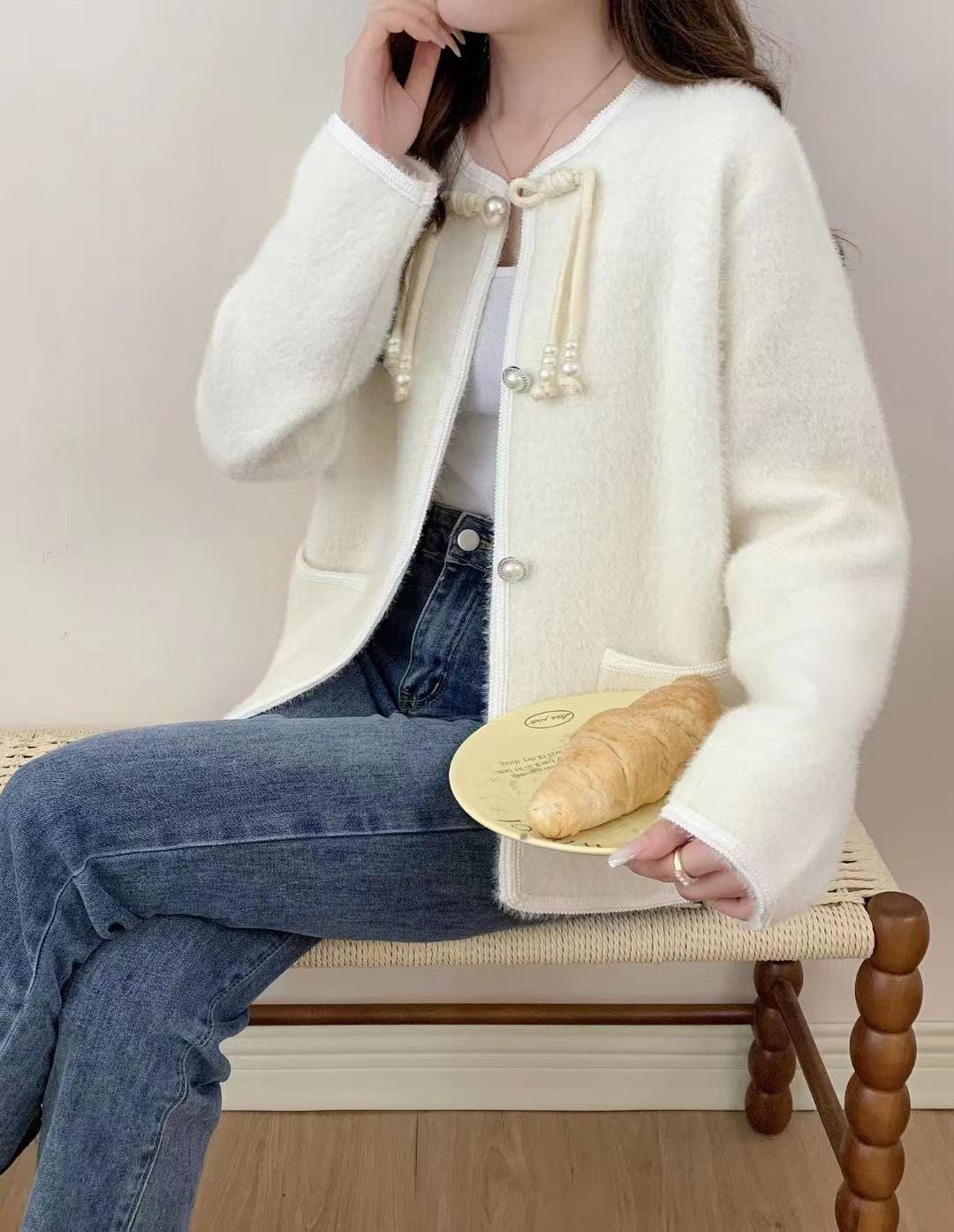 Cárdigan de punto con cuello de muñeca de encaje antiedad de estilo coreano dulce de otoño e invierno de 2024, abrigo de suéter de lana de mapache para mujer