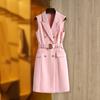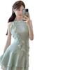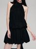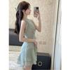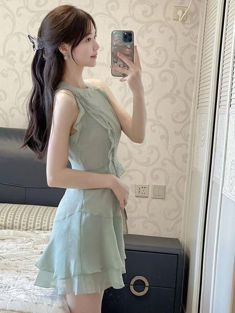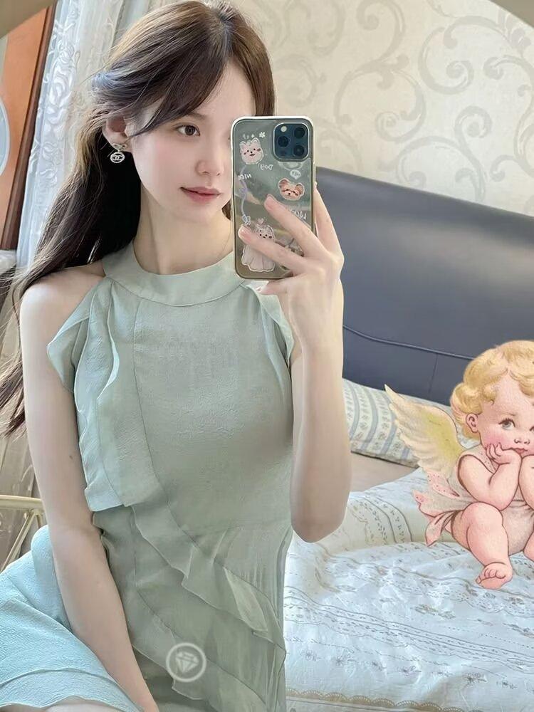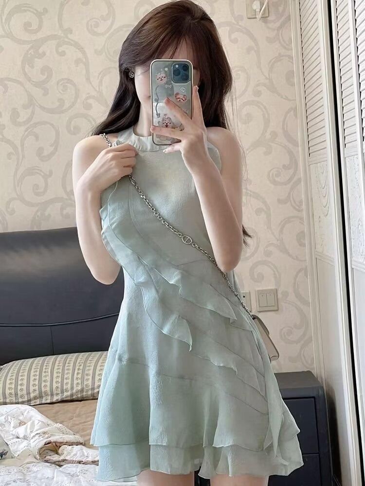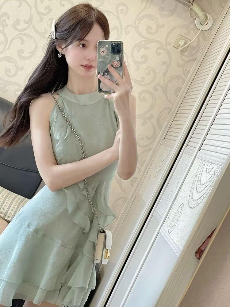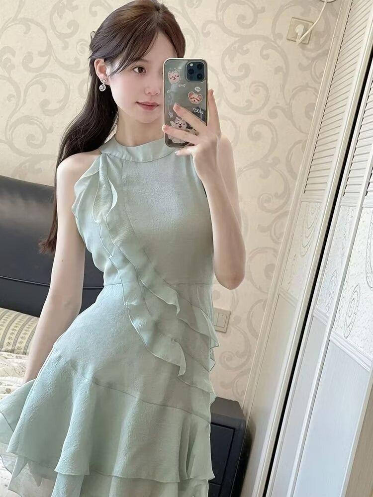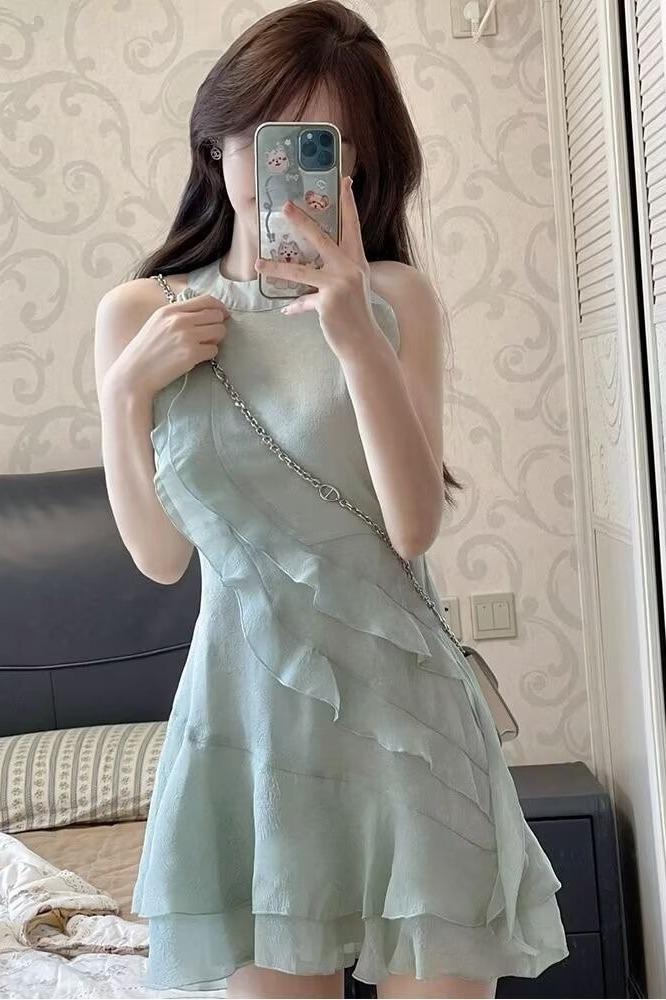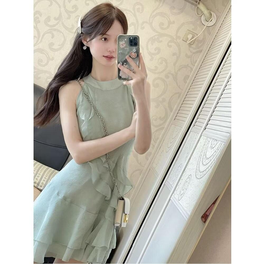 Vestido sin mangas con cuello colgante y volantes de verano para mujer, diseño costero, cintura elegante, falda corta, falda de moda 2024