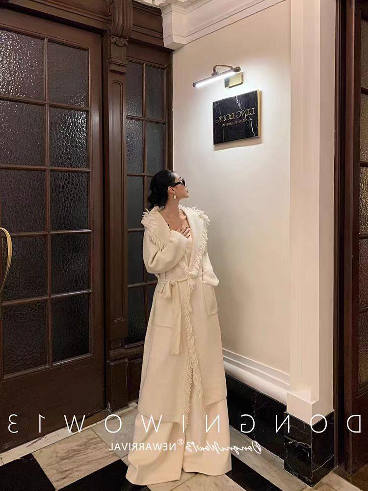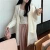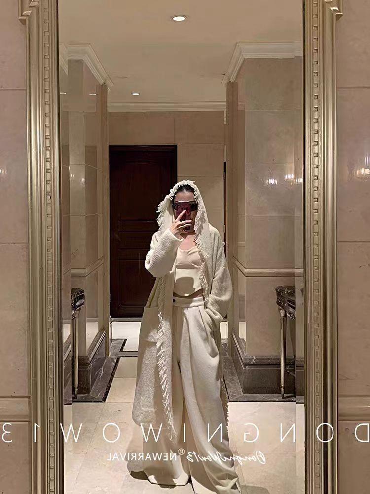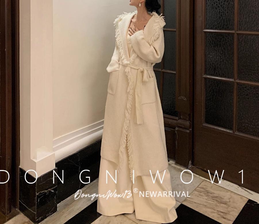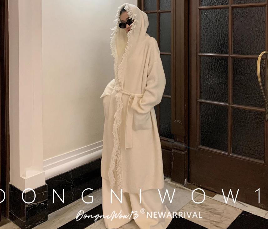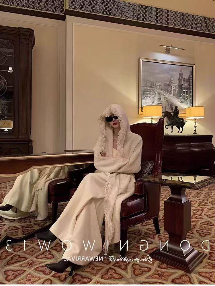 Cárdigan de punto con capucha y borlas de lana blanca para mujer, estilo holgado y perezoso, de longitud media, para otoño e invierno
