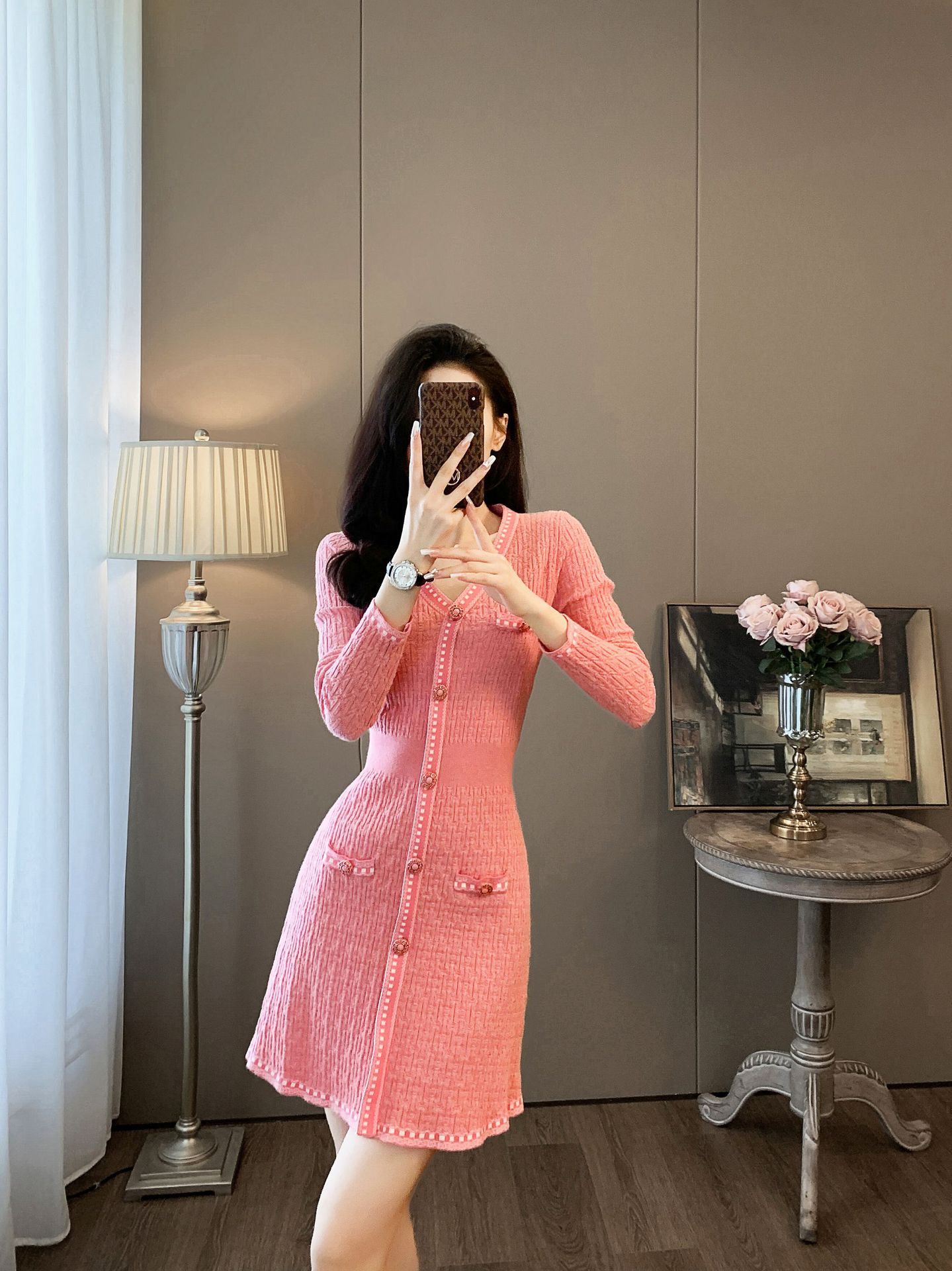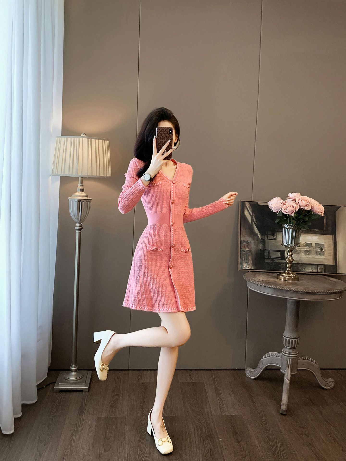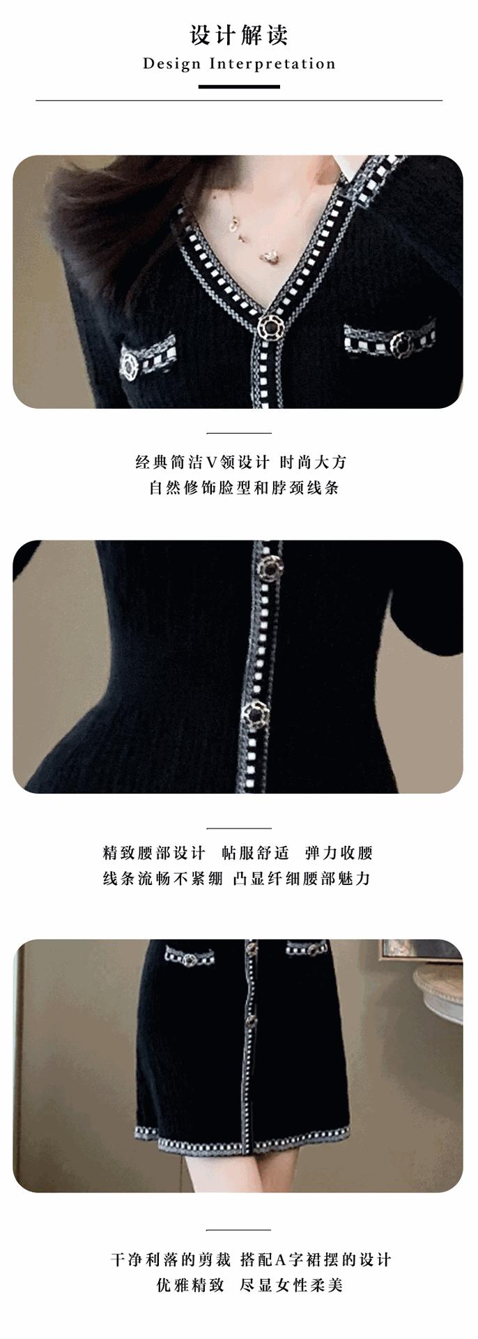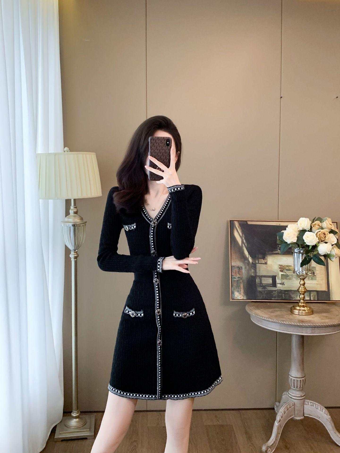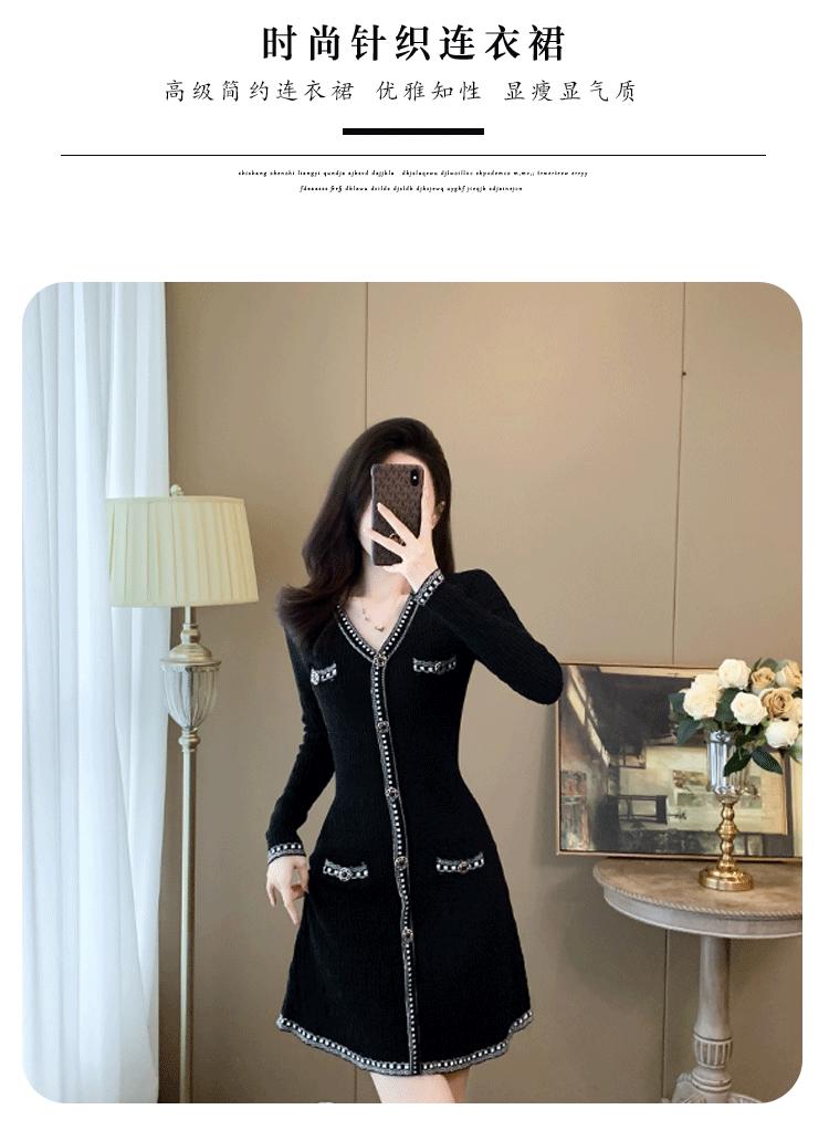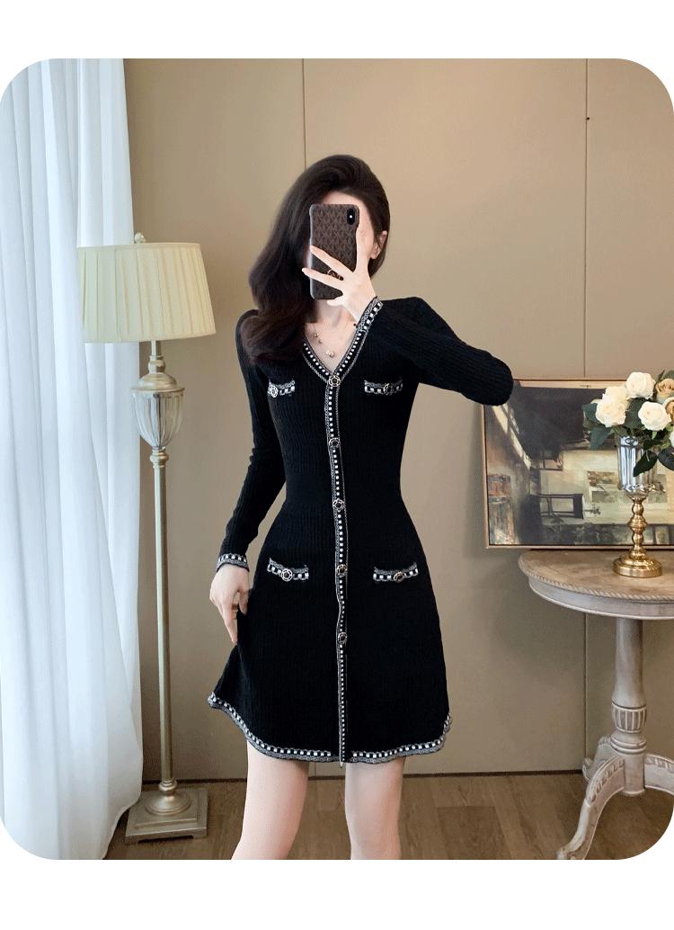 Vestido de Punto Estilo Dama Estilo Francés Nuevo Estilo 2025 Elegante y de Alta Gama Cuello en V Abotonadura Sencilla Falda Línea A para Mujer