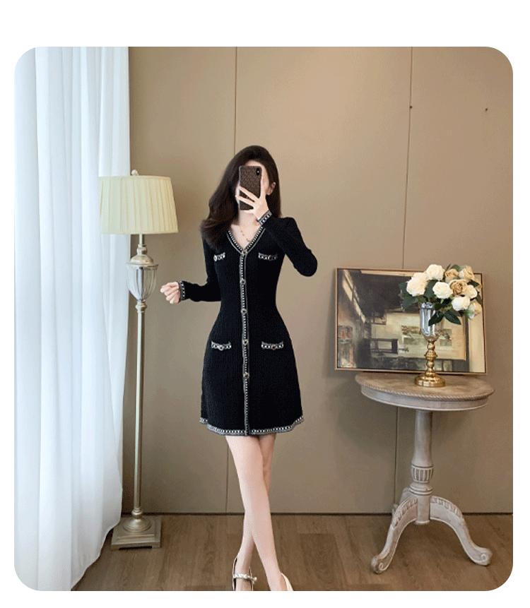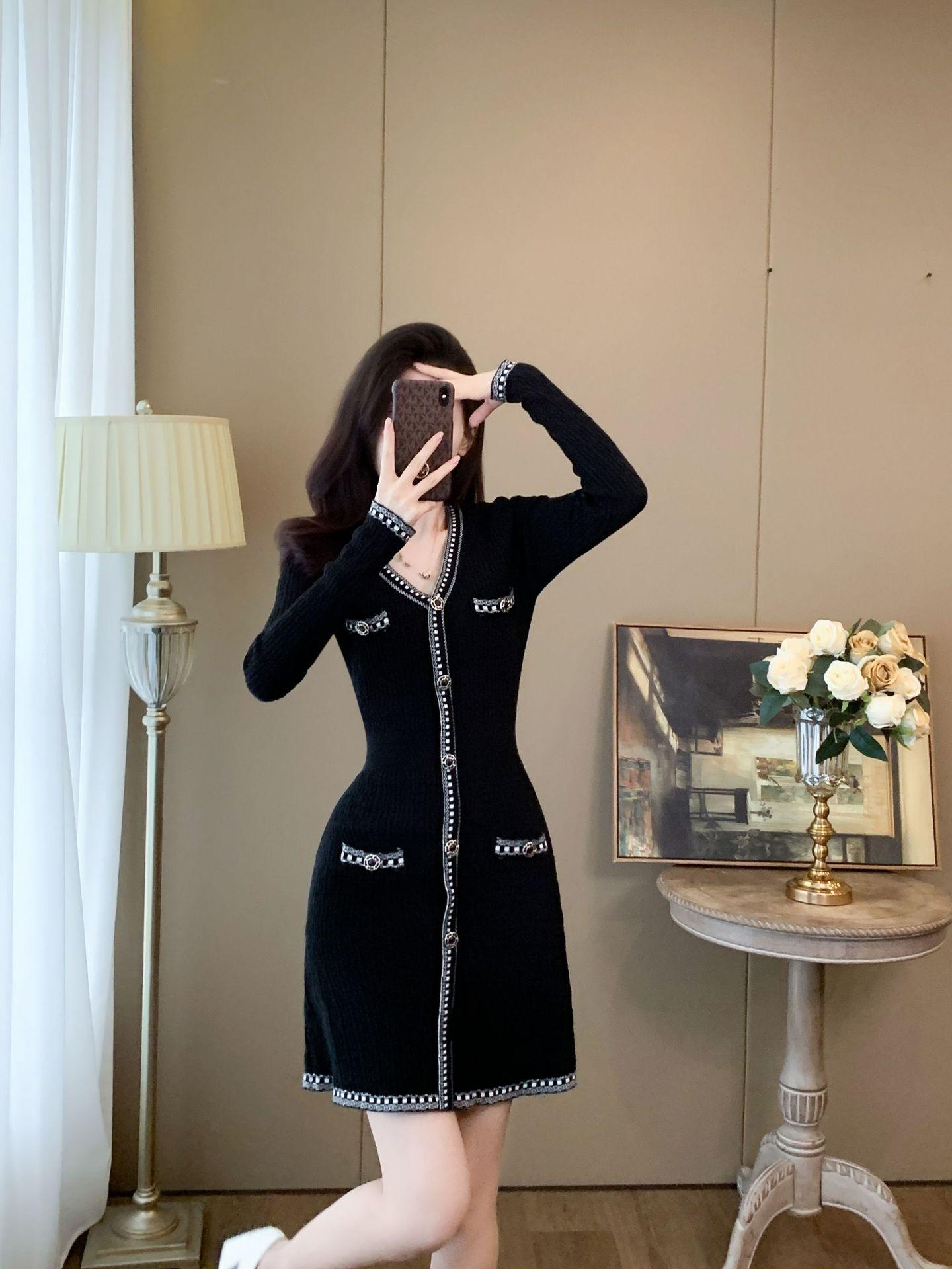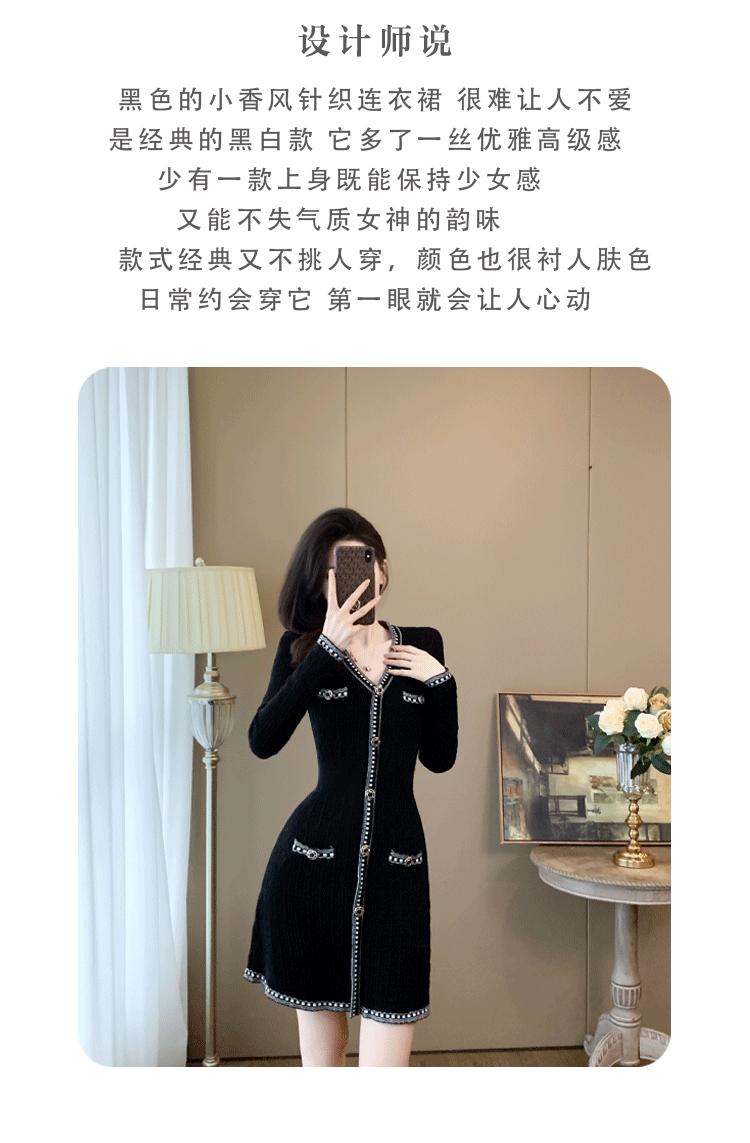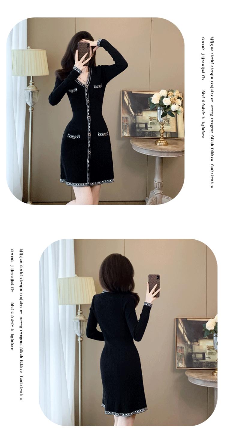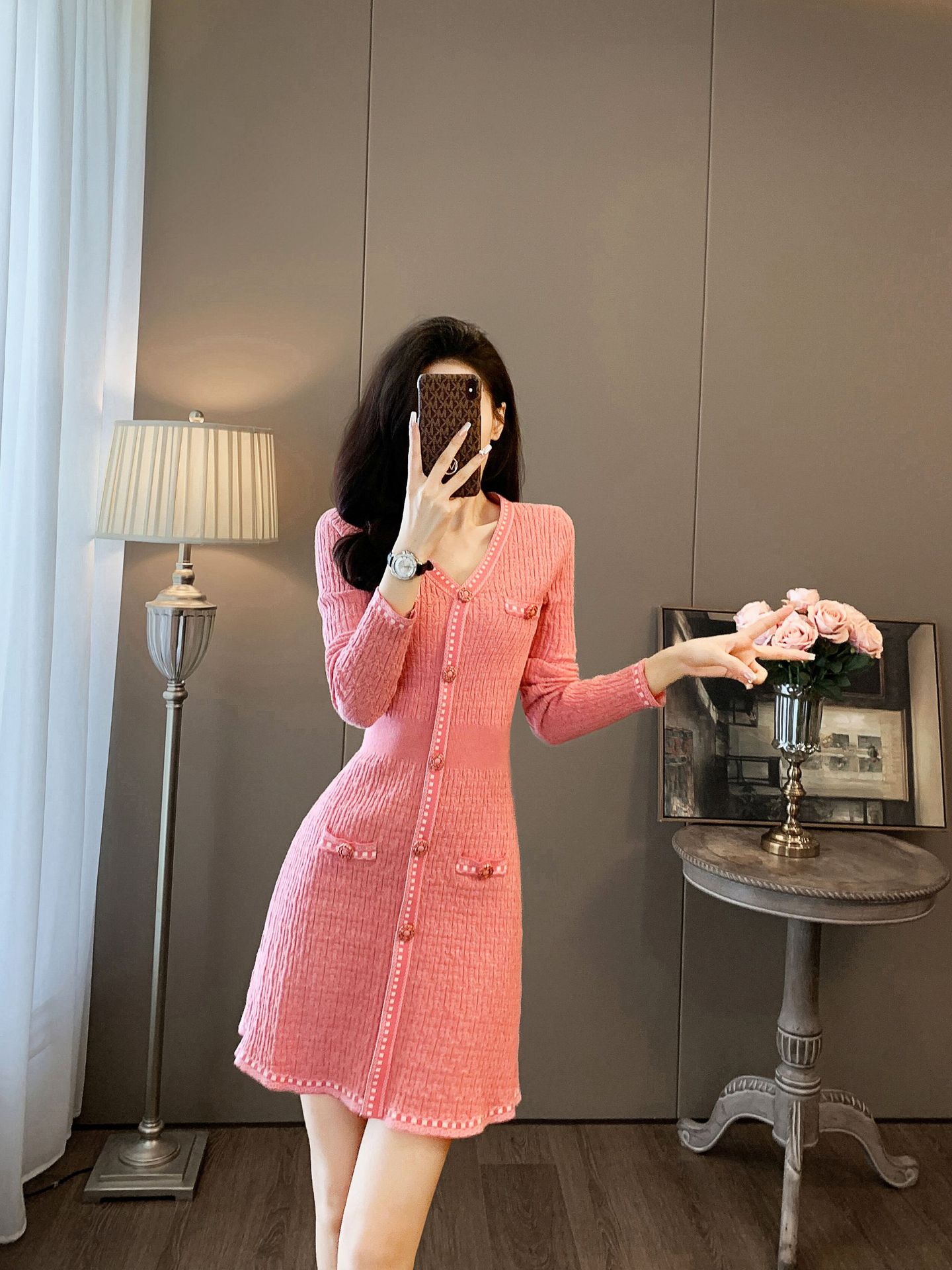 Vestido de Punto Estilo Dama Estilo Francés Nuevo Estilo 2025 Elegante y de Alta Gama Cuello en V Abotonadura Sencilla Falda Línea A para Mujer