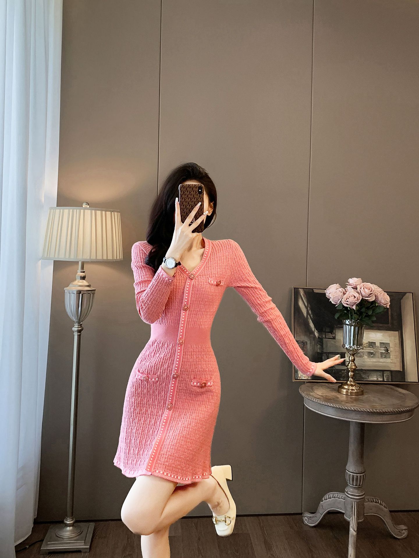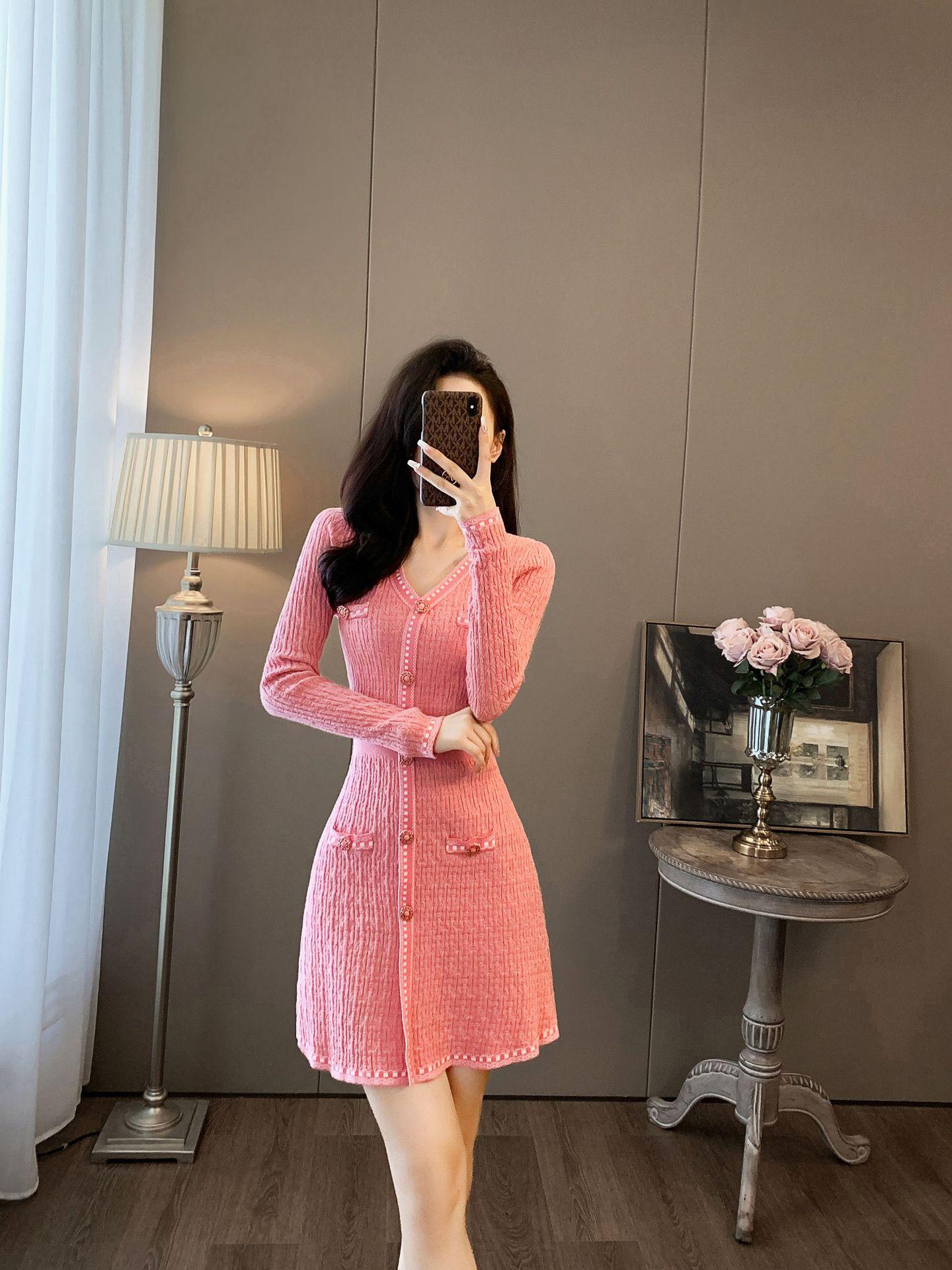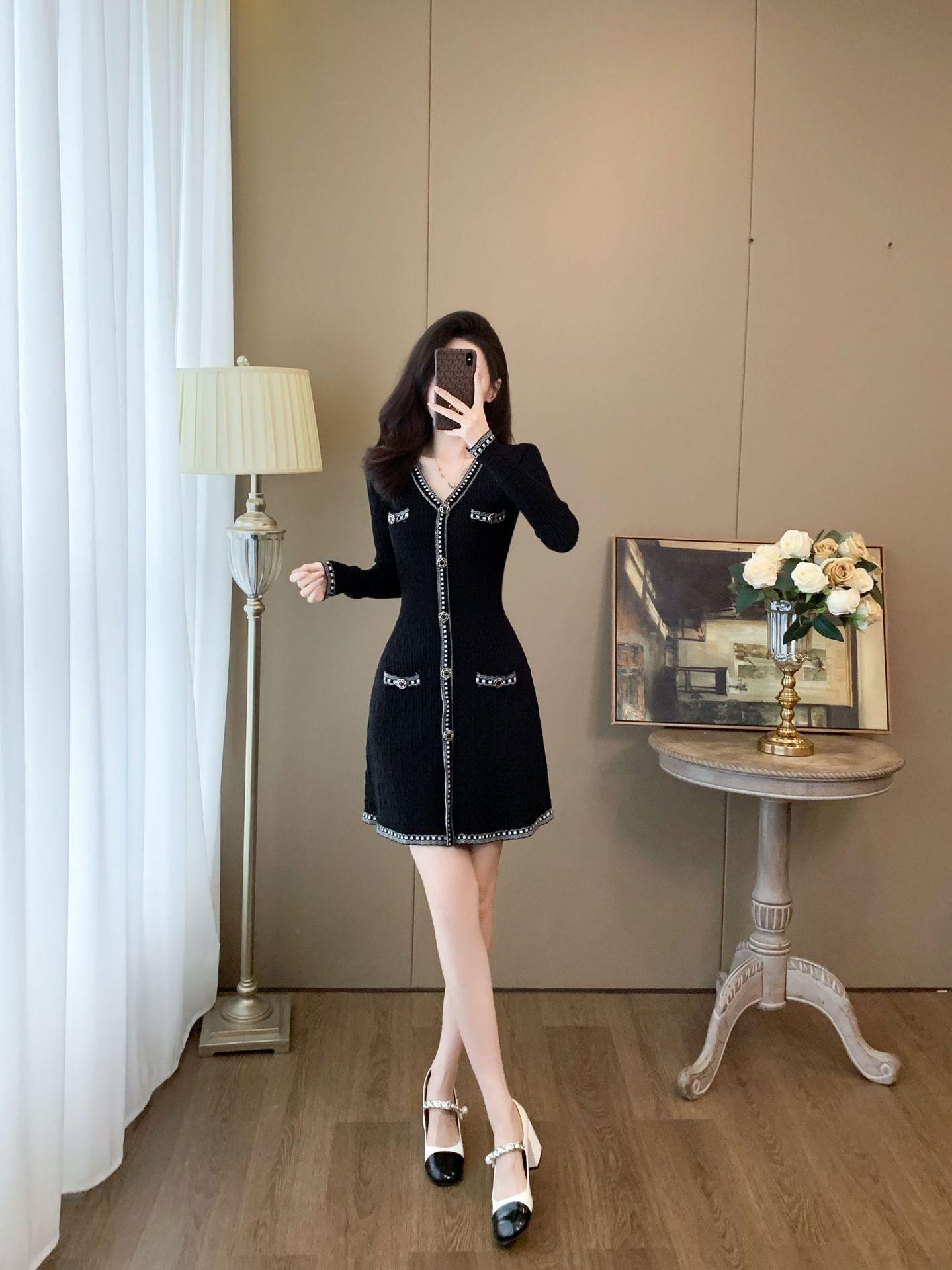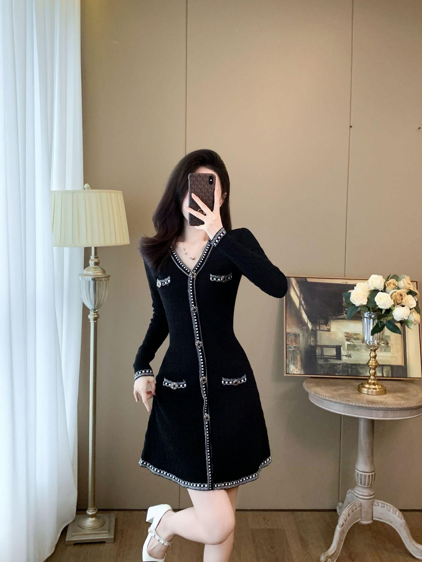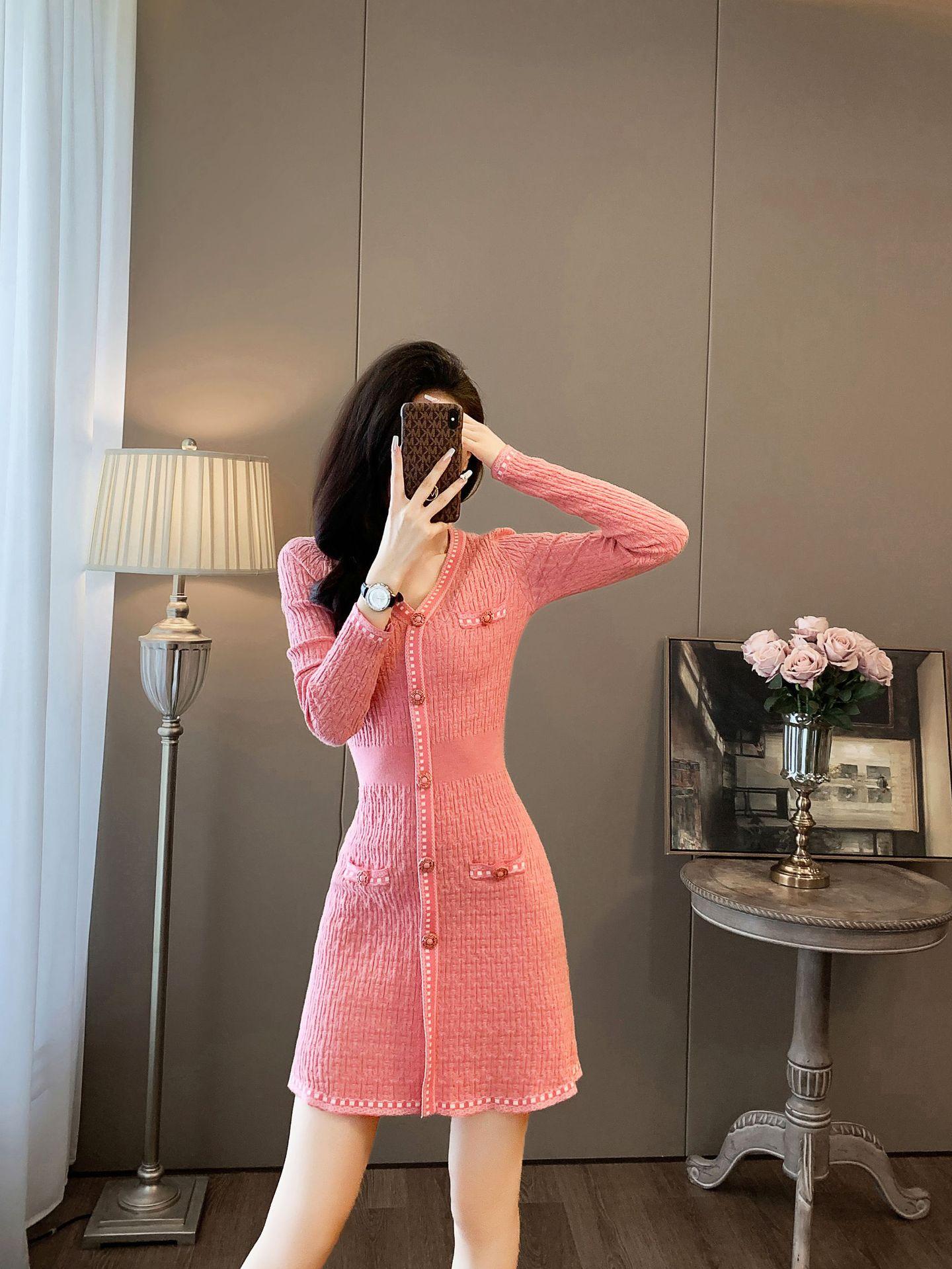 Vestido de Punto Estilo Dama Estilo Francés Nuevo Estilo 2025 Elegante y de Alta Gama Cuello en V Abotonadura Sencilla Falda Línea A para Mujer