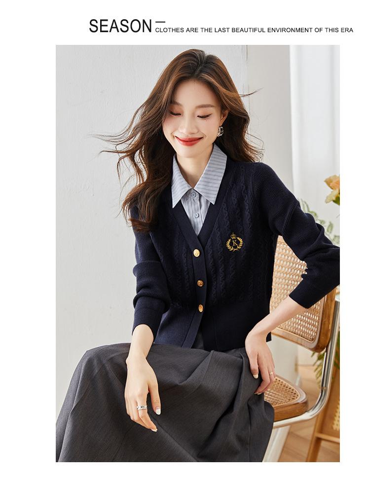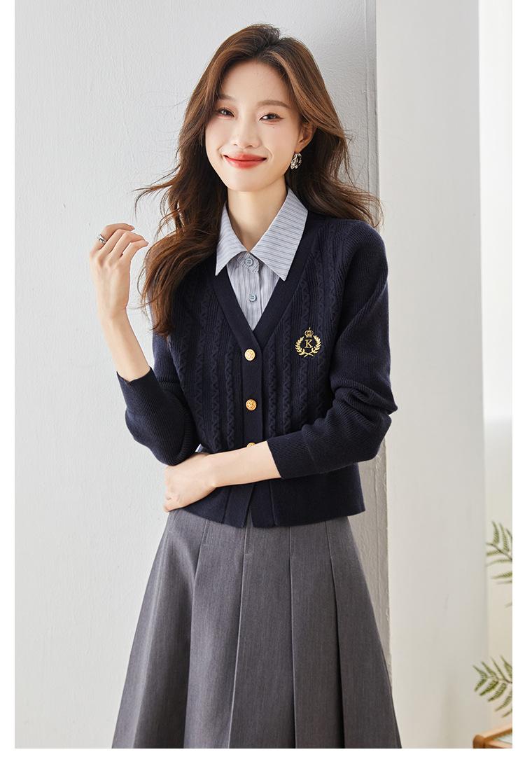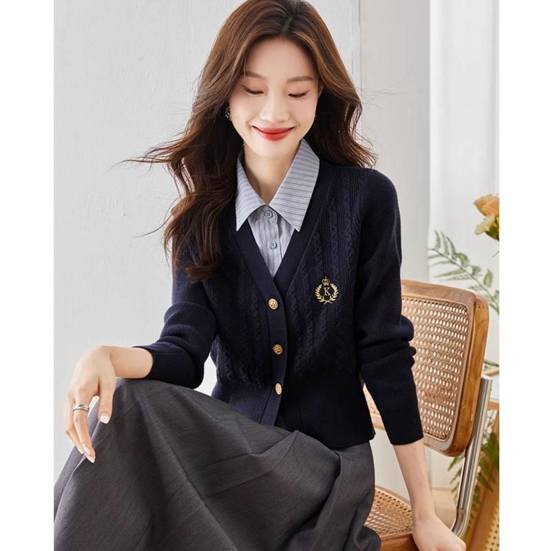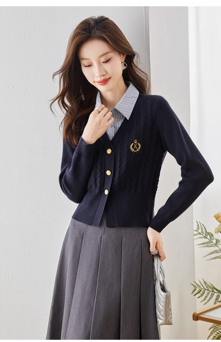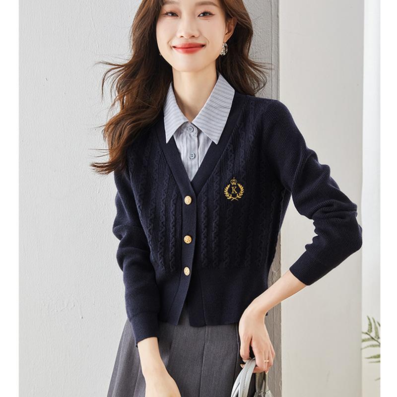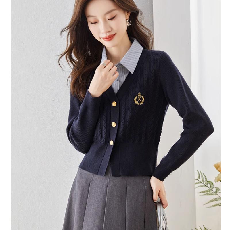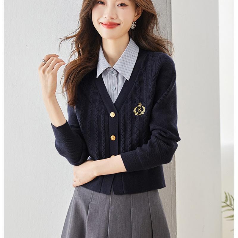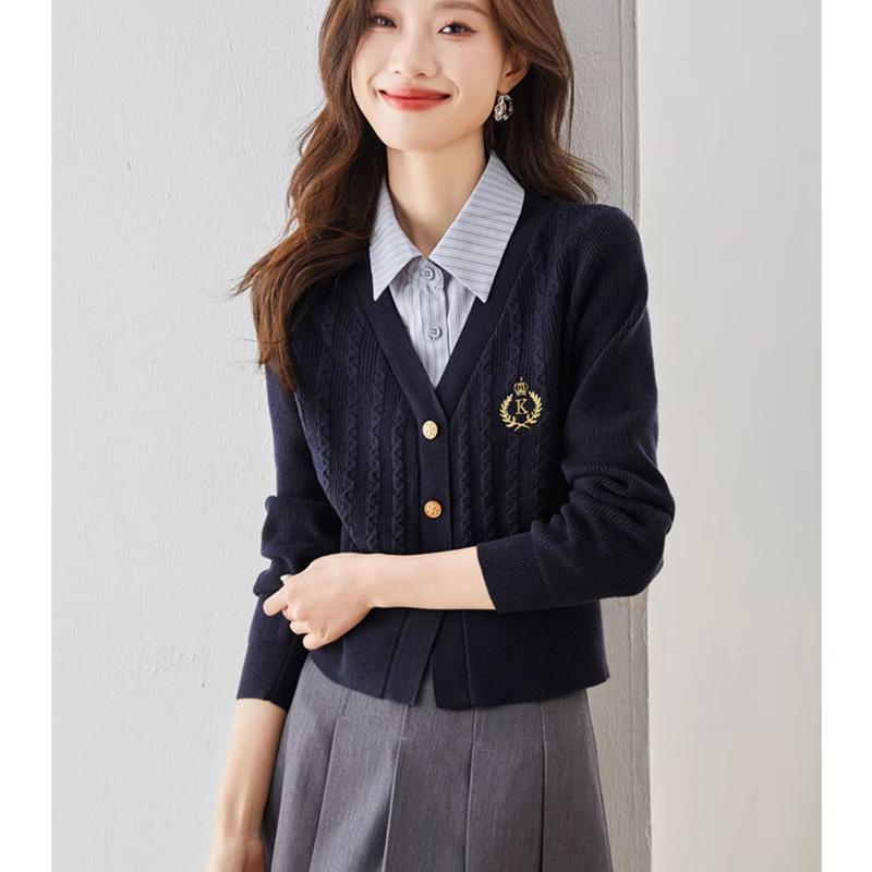 Tejido de punto para mujer, costuras a rayas, top falso de dos piezas, nuevo otoño 2024, manga larga, estilo universitario, suéter con cuello POLO