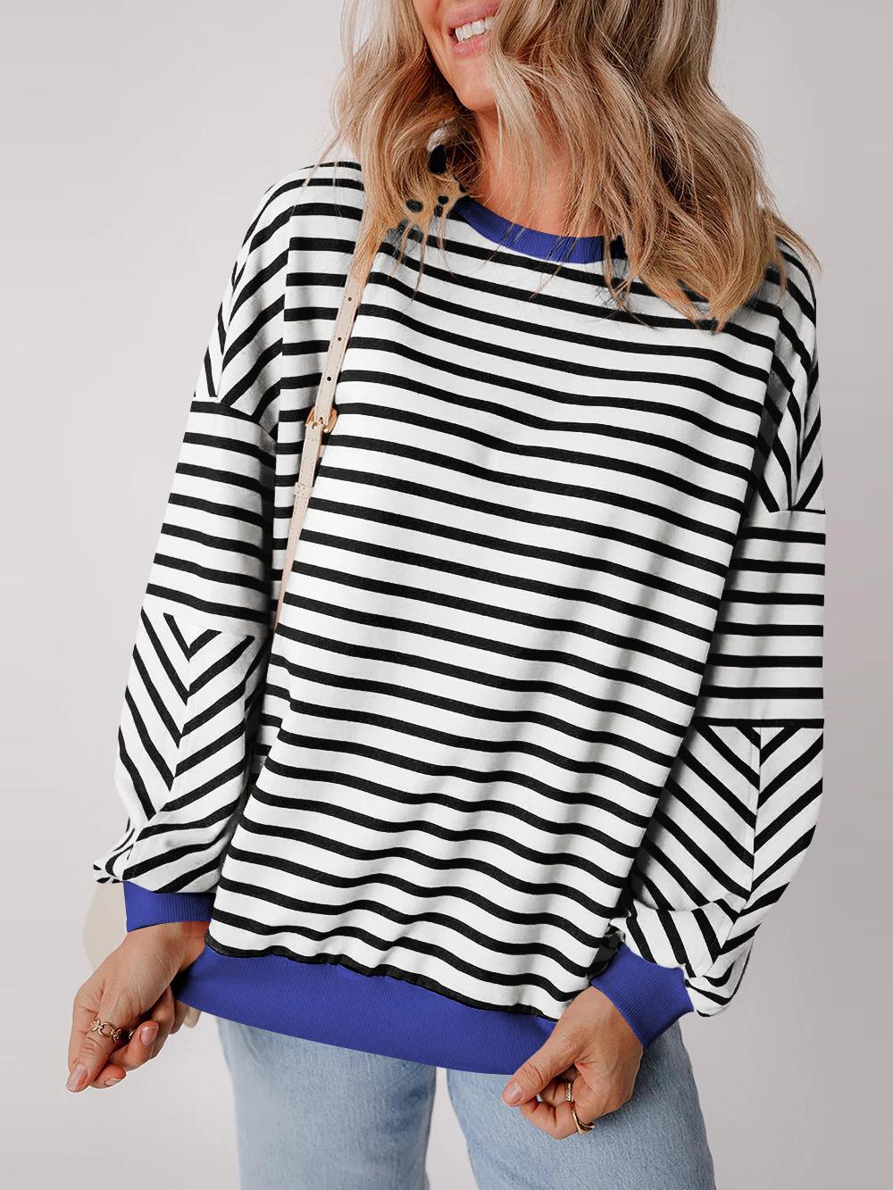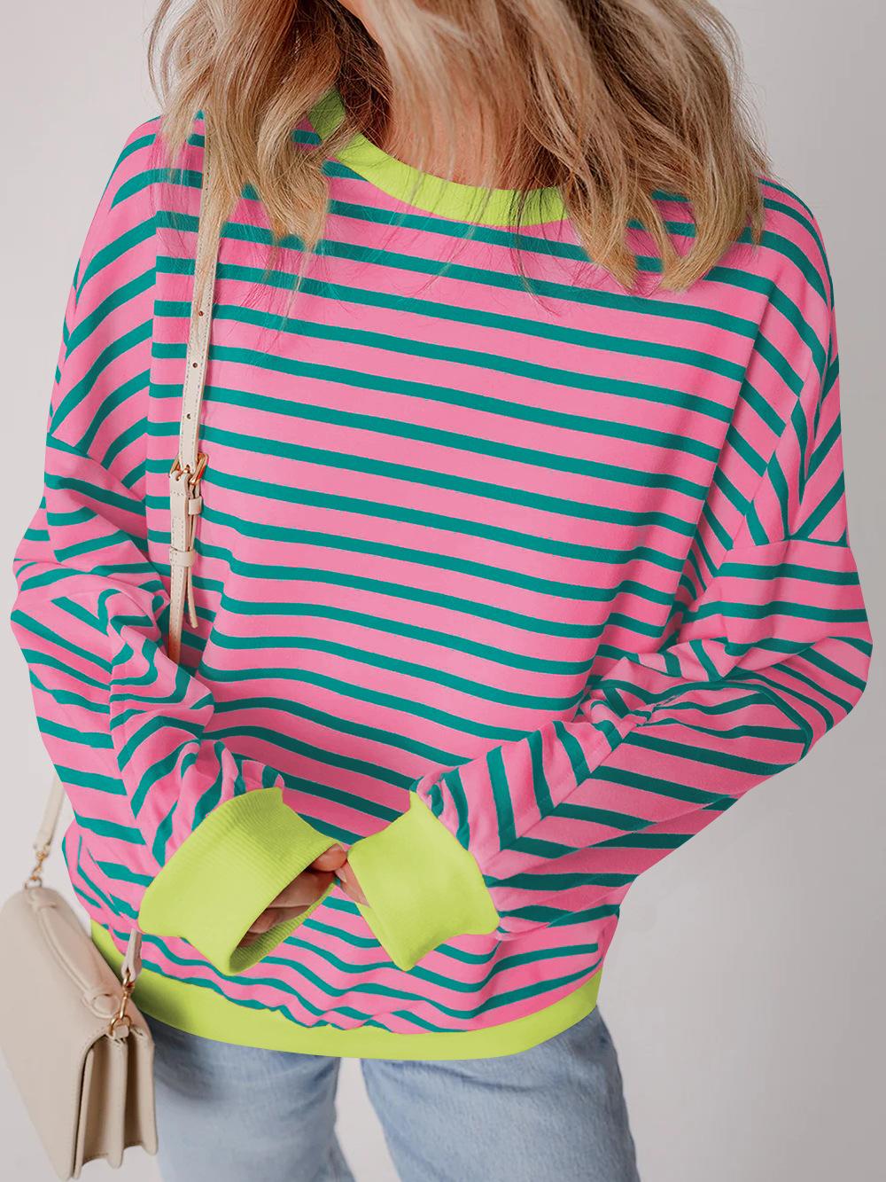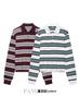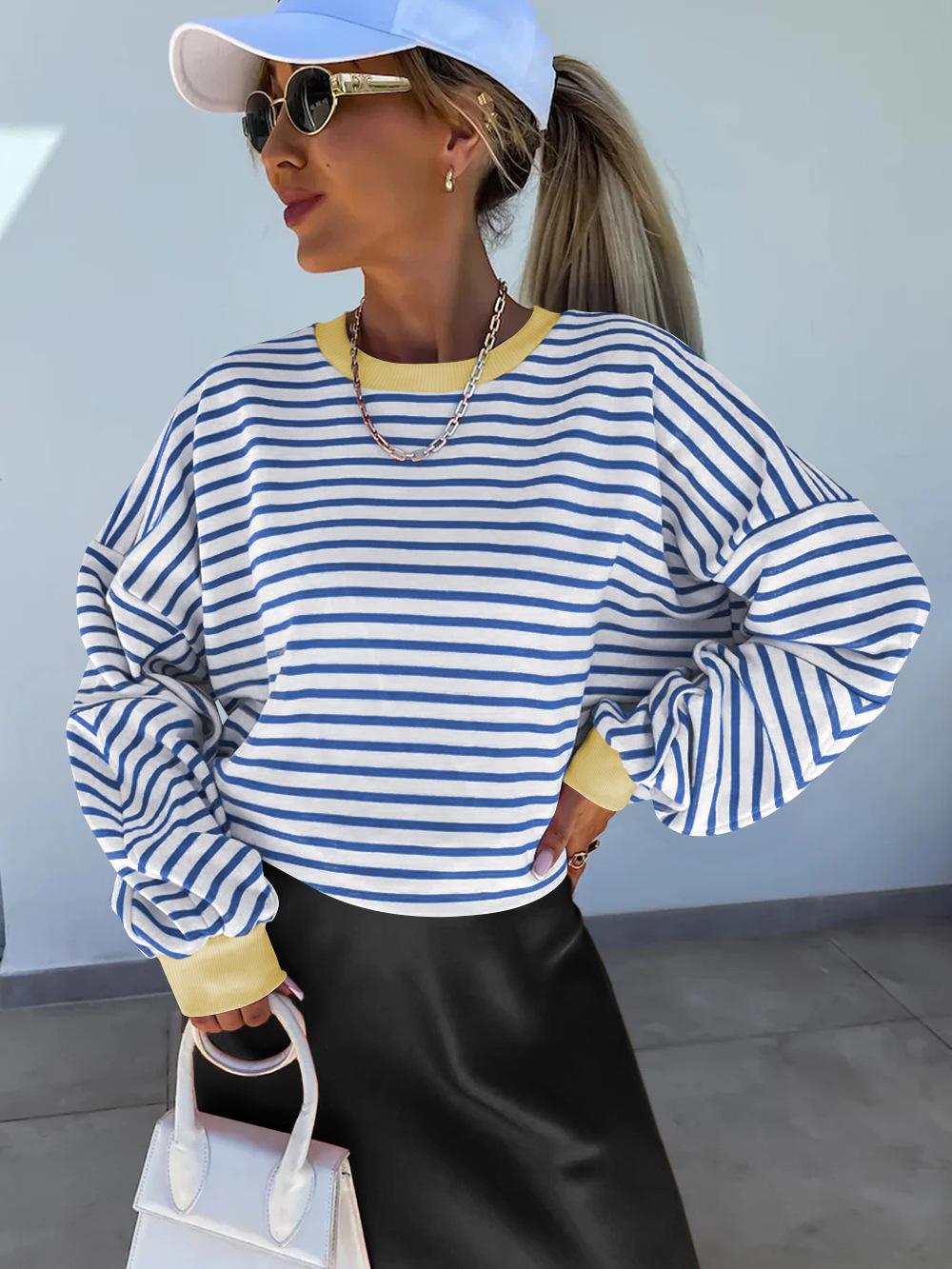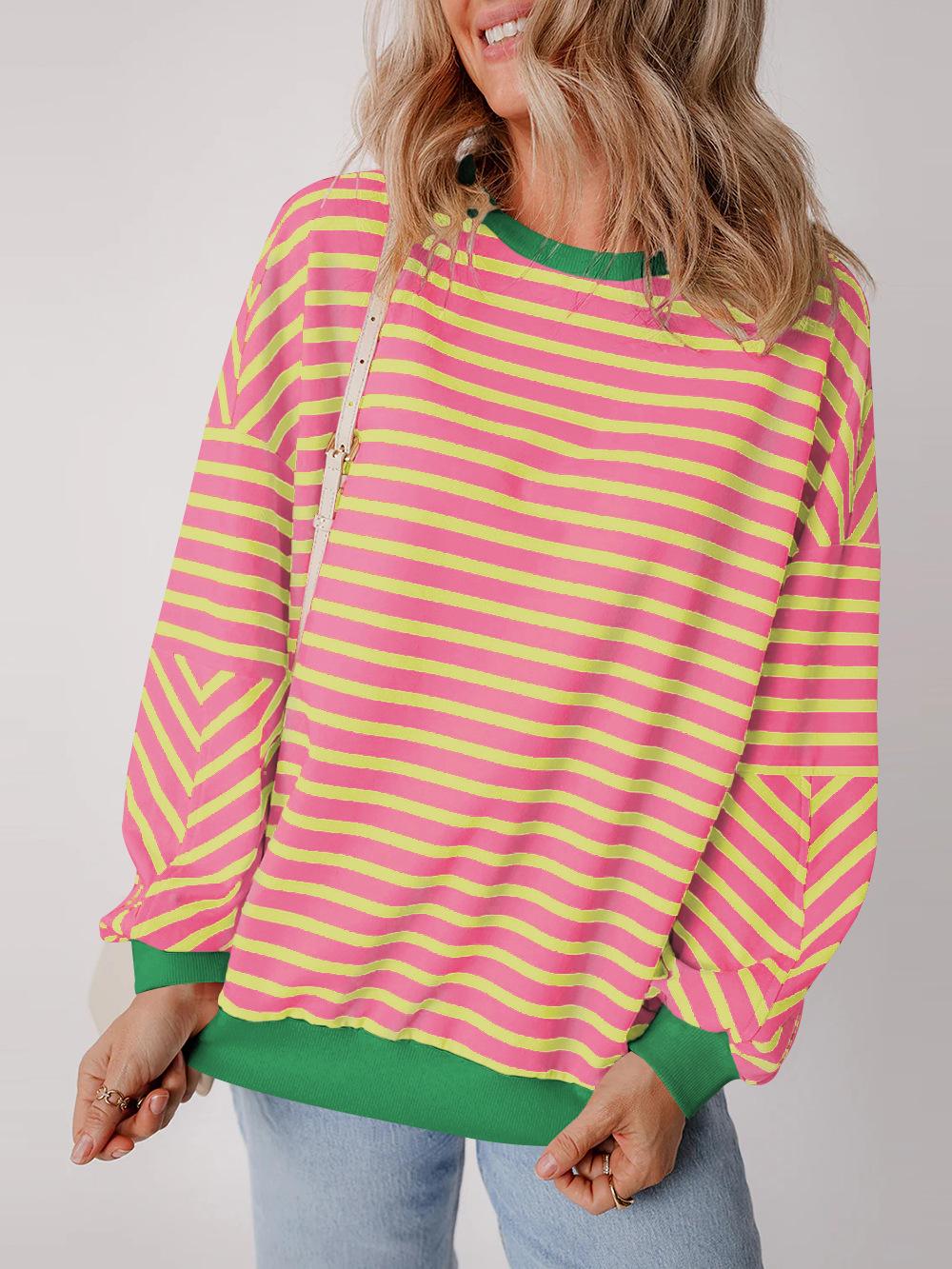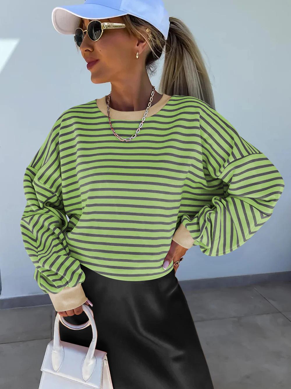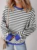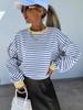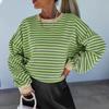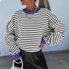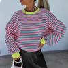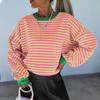 Sudadera de Punto de Cuello Redondo con Rayas en Contraste Transfronteriza Europea y Americana para Primavera y Otoño Diseño Holgado Estilo Casual Top Versátil de Manga Larga