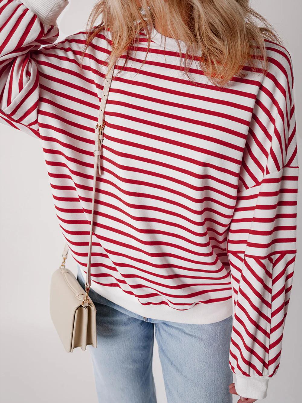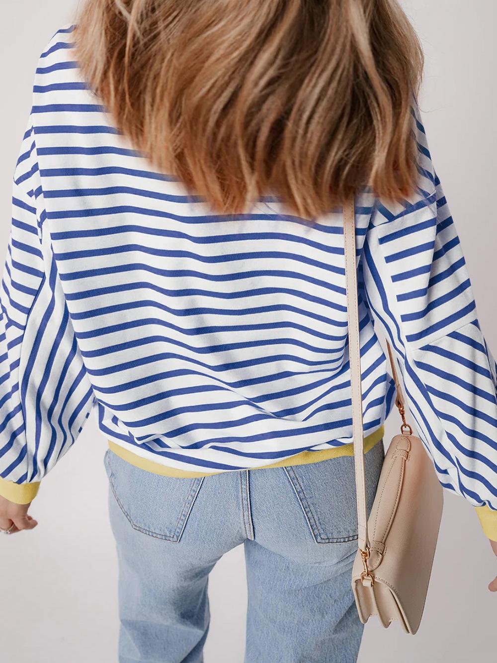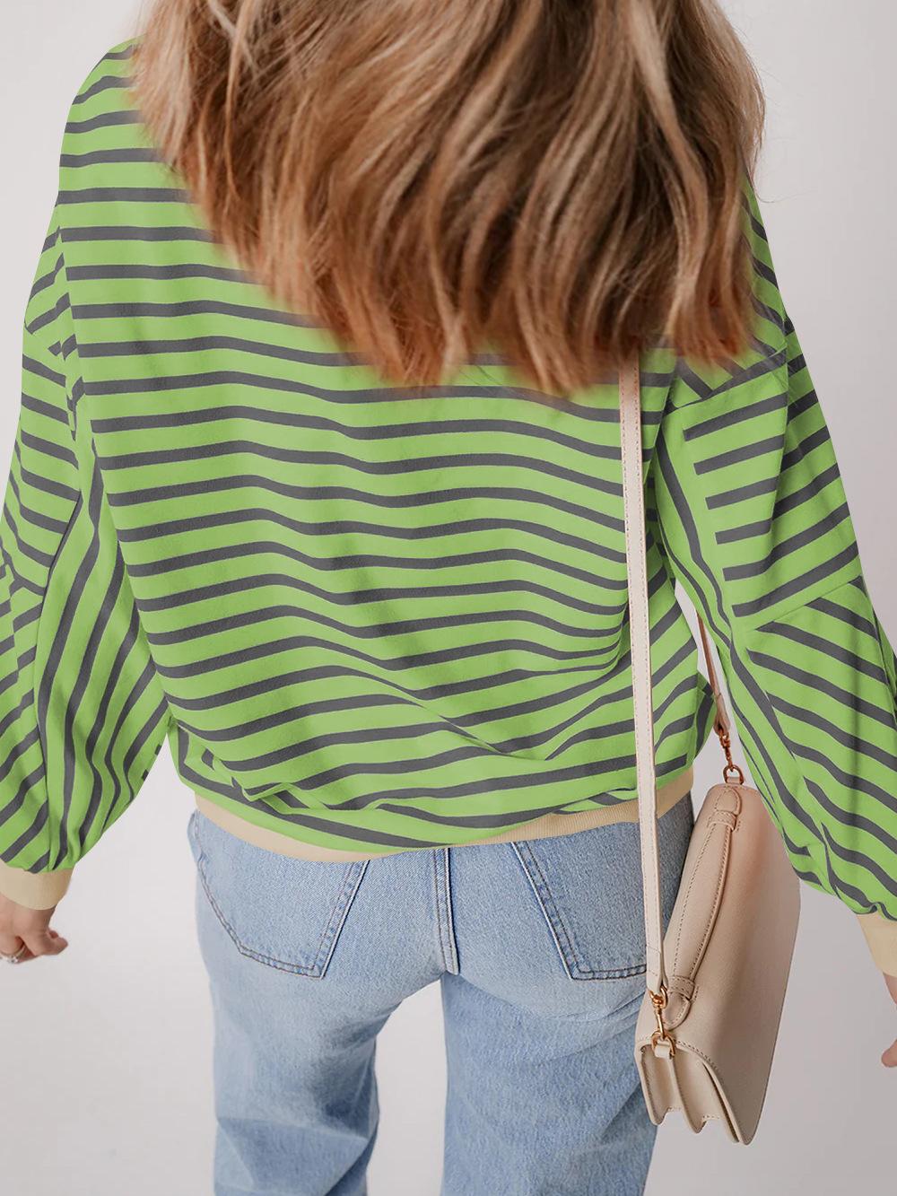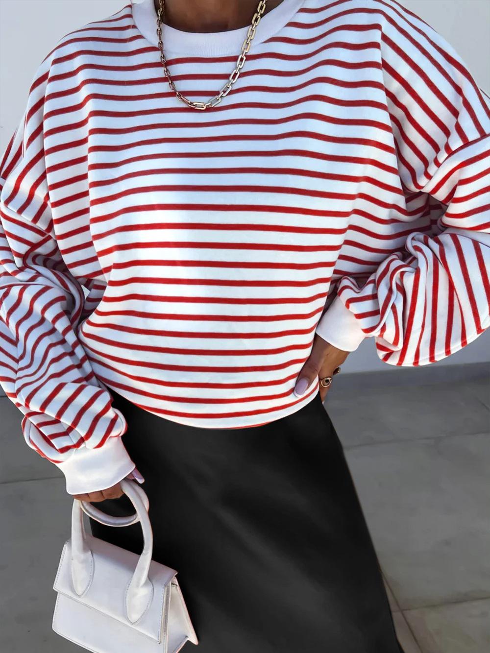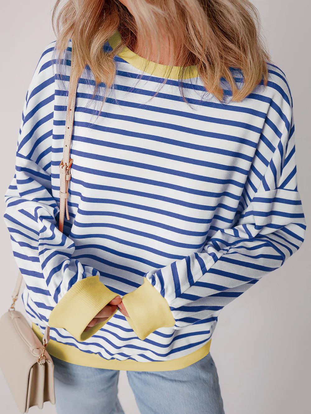 Sudadera de Punto de Cuello Redondo con Rayas en Contraste Transfronteriza Europea y Americana para Primavera y Otoño Diseño Holgado Estilo Casual Top Versátil de Manga Larga