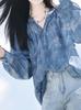 Camisa holgada elegante de verano 2024 para mujer, con cuello en V, estampado, botones, cordones y mangas abullonadas.