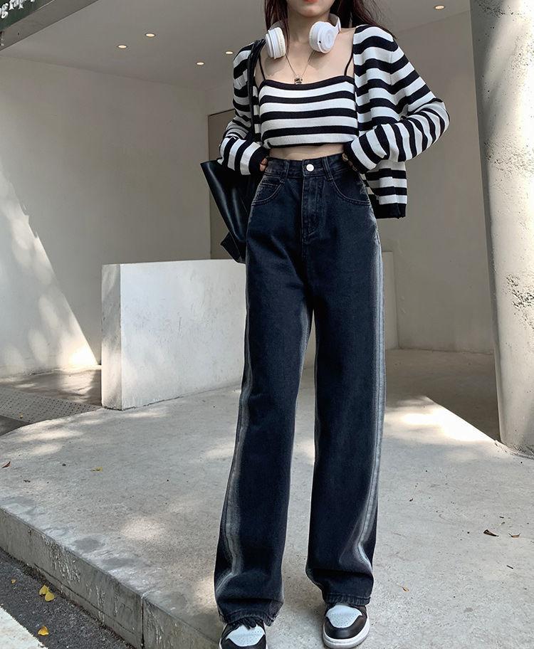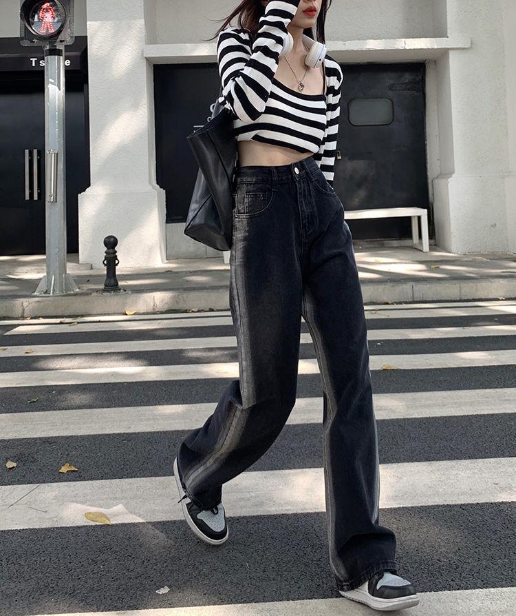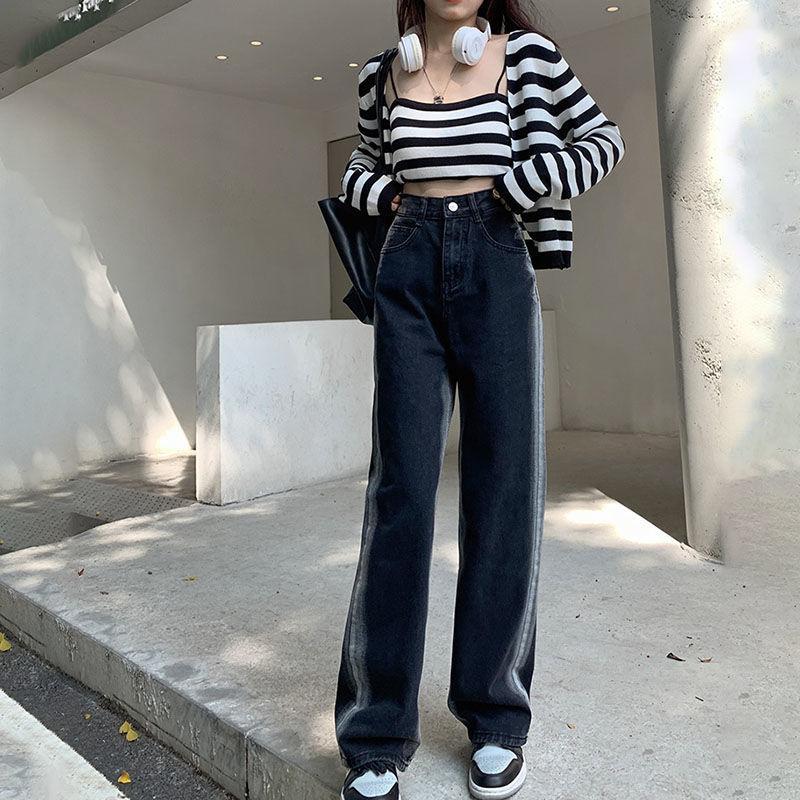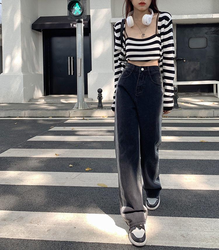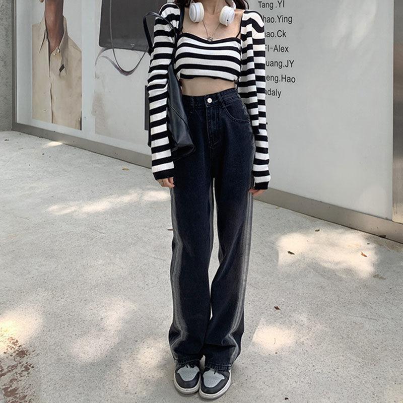 Jeans para Mujer Rectos Sueltos Primavera 2022 Nuevo Cintura Alta Slim Negro Degradado Sumergido Pantalones de Pierna Ancha