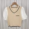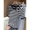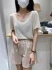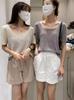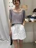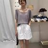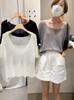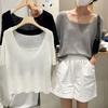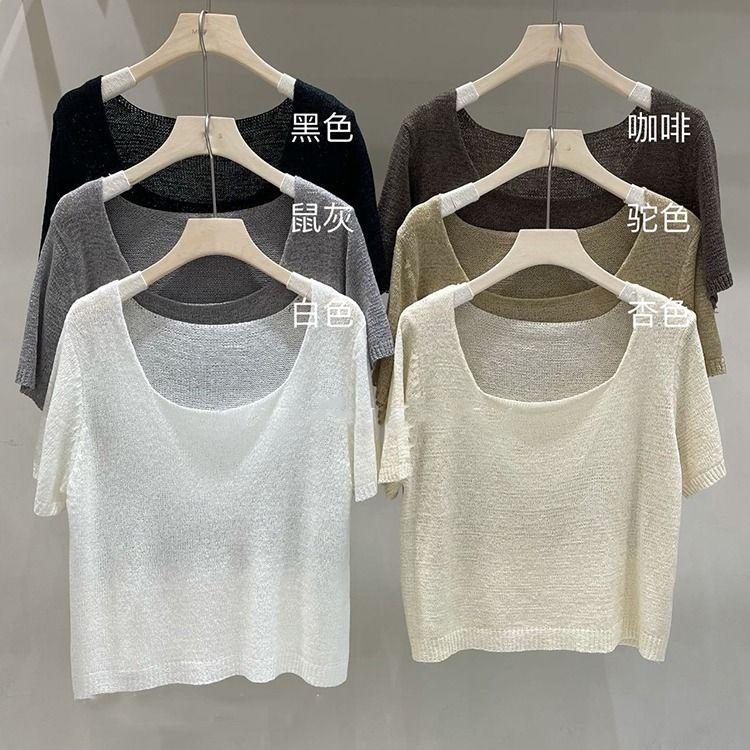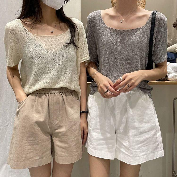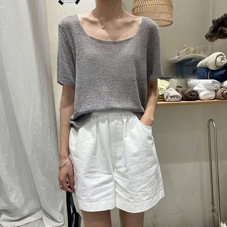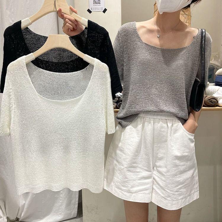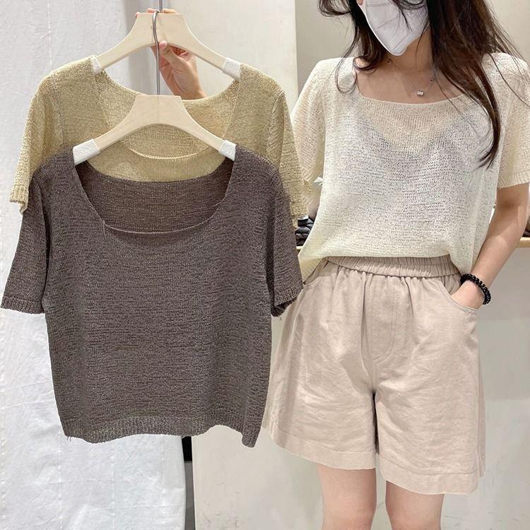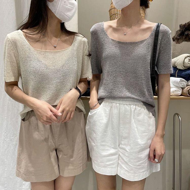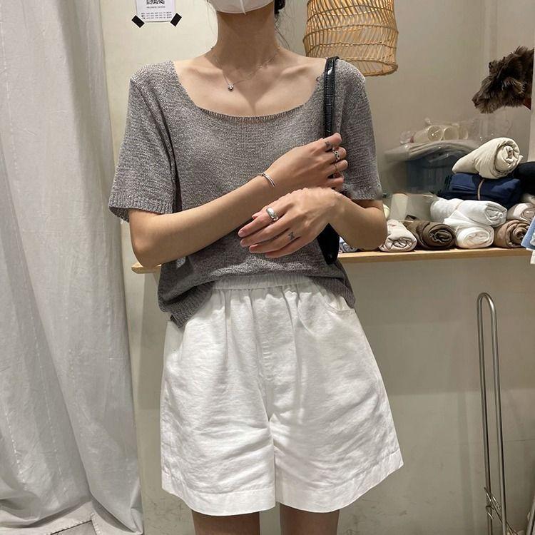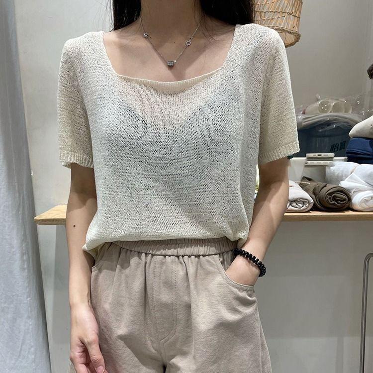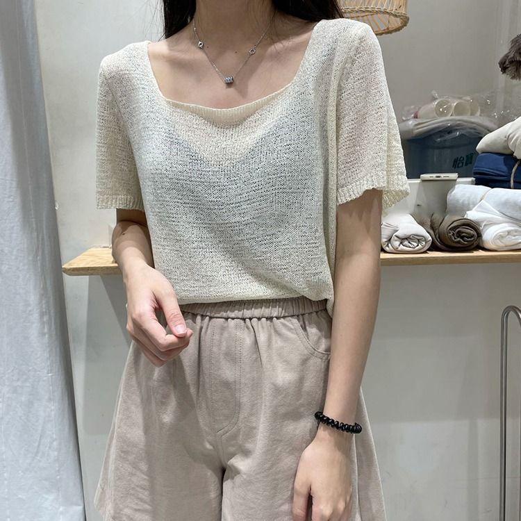 Top de Punto Elegante de Verano de Manga Corta Cuello Cuadrado Fino Diseño Holgado para Mujer Nicho Clavícula Expuesta Chic Camiseta Básica