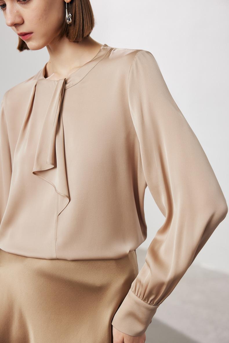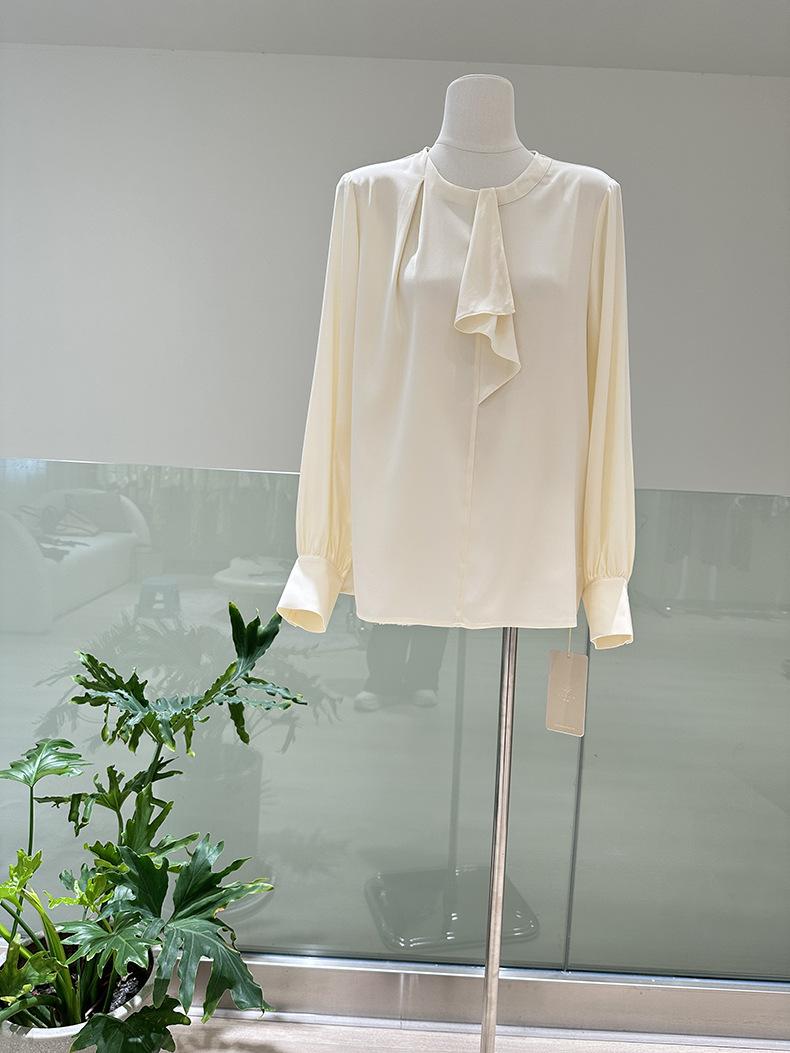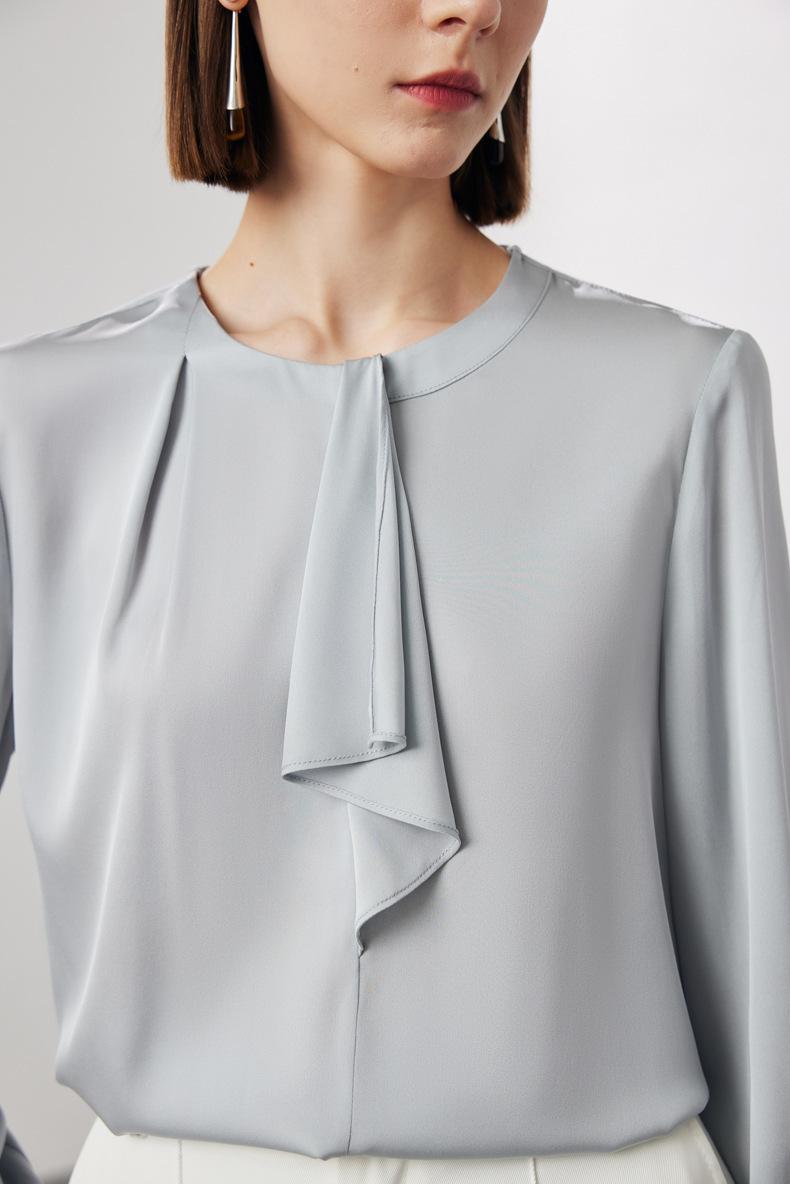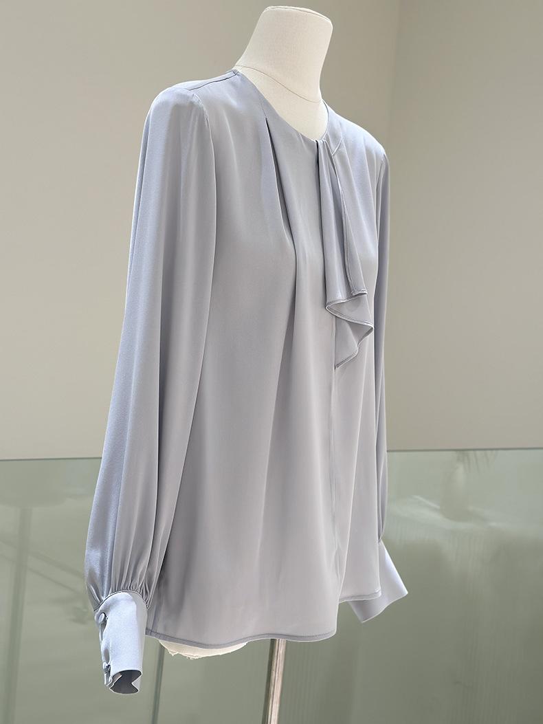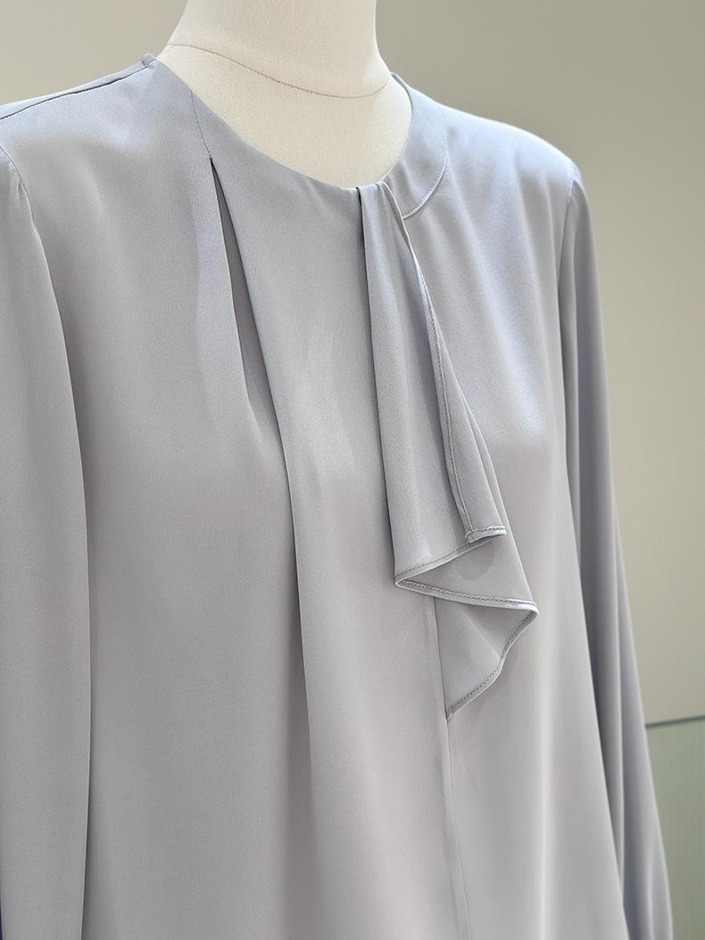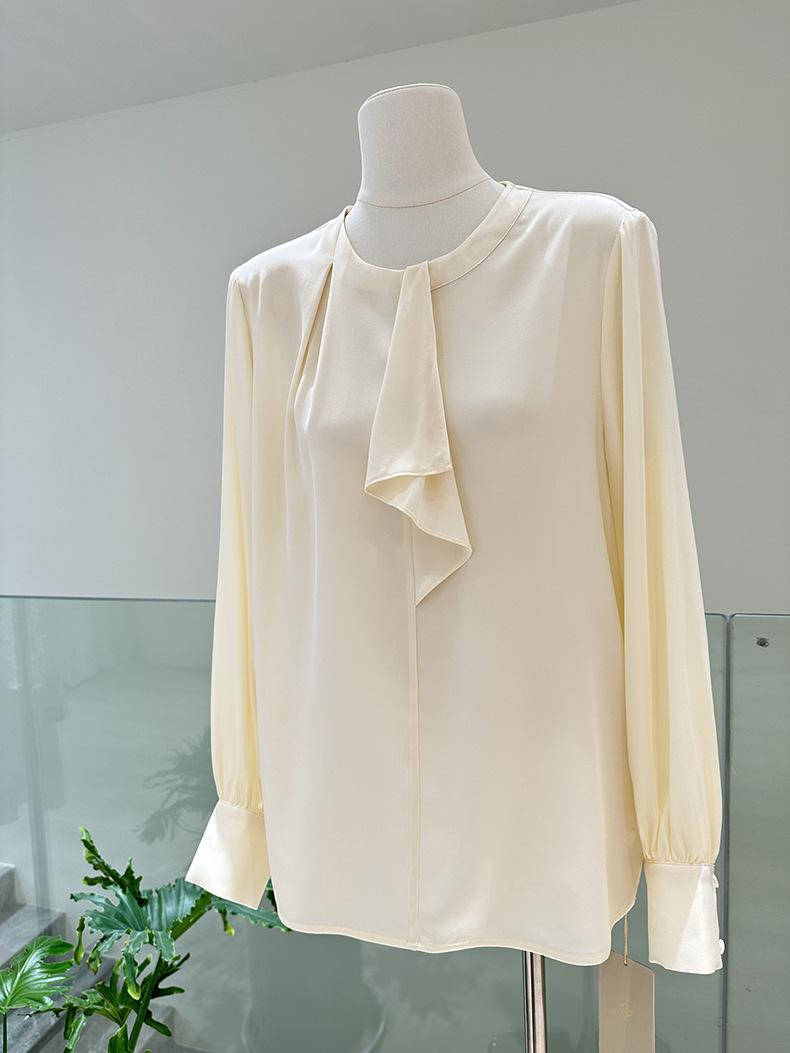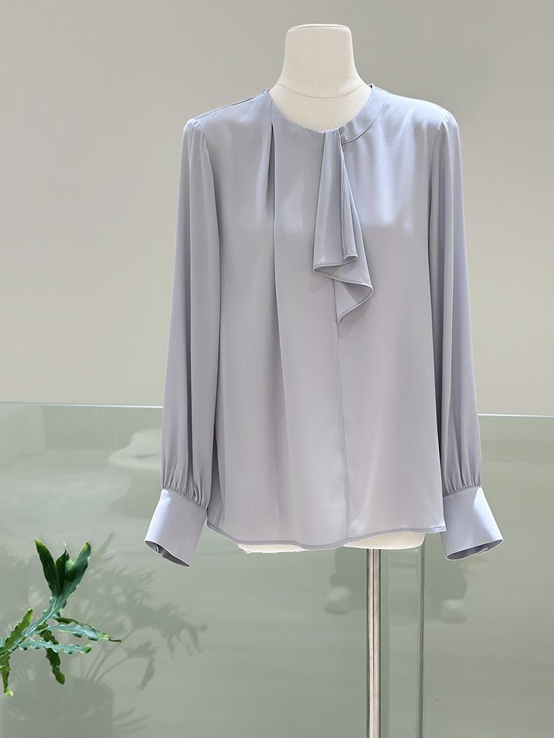 Camisa de seda de manga larga para mujer 2025 primavera y verano nuevo cuello redondo con lazo para ir al trabajo manga larga elástica doble joe seda de morera top