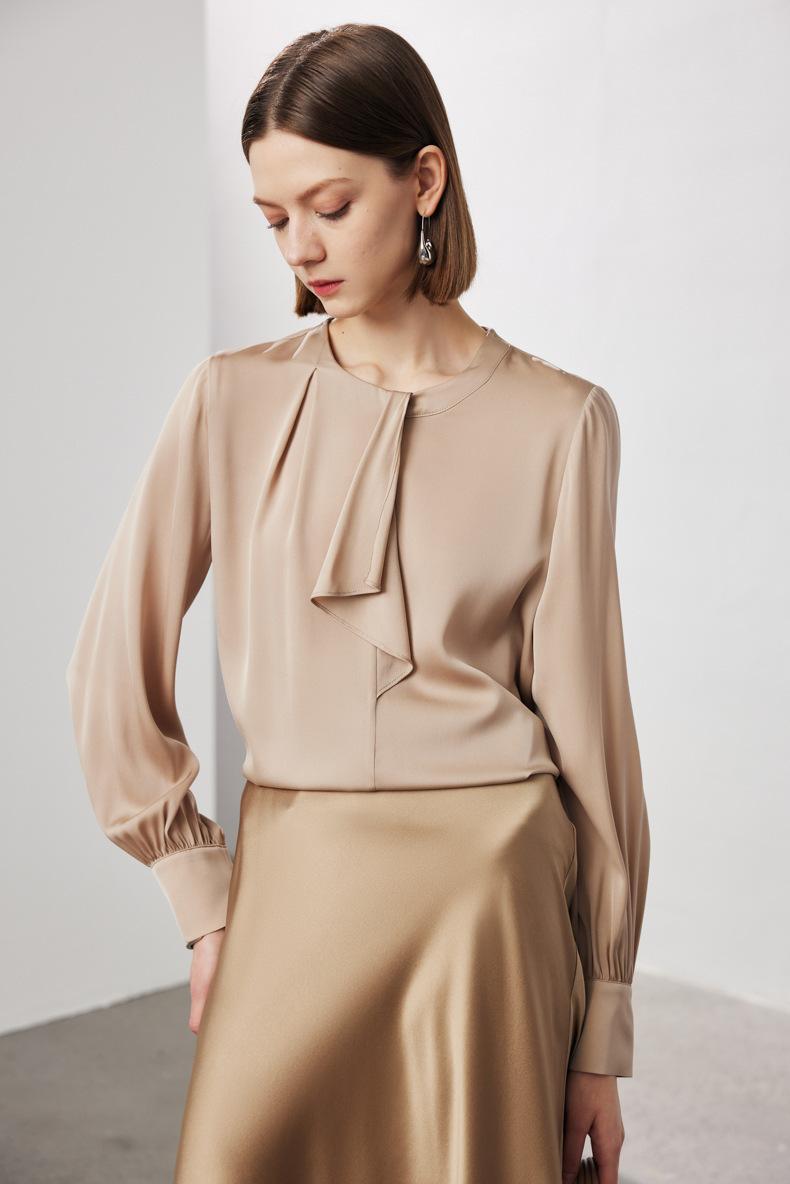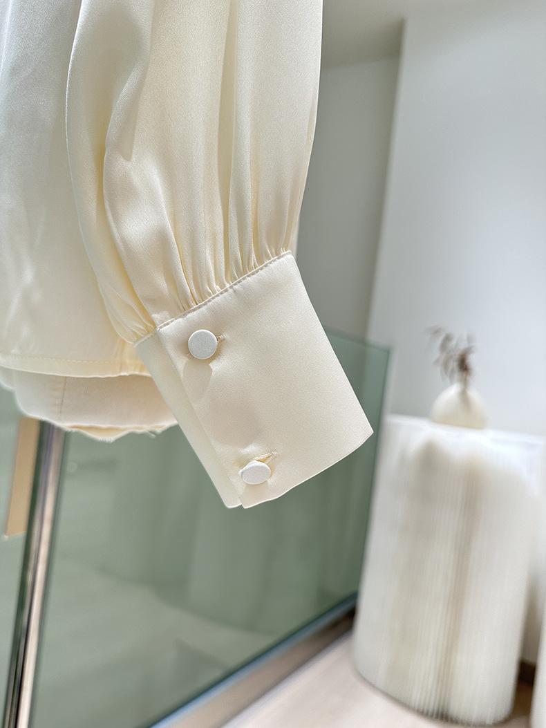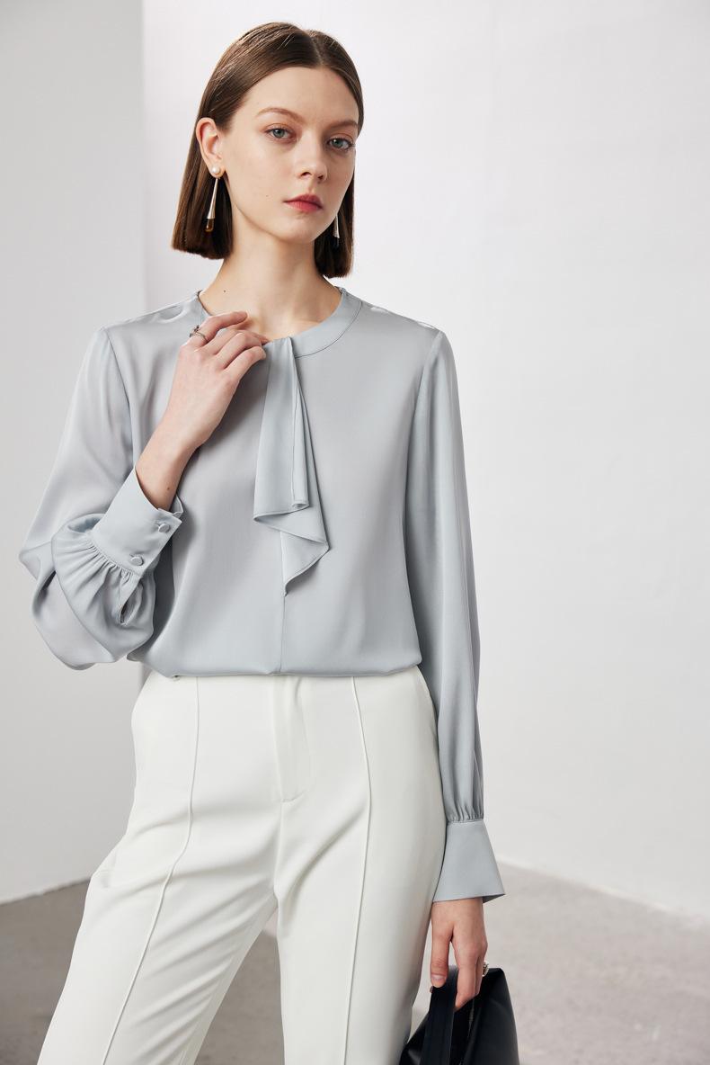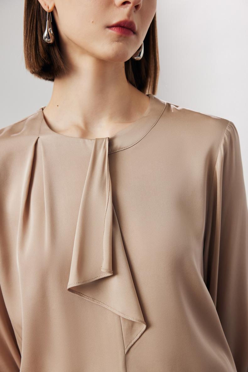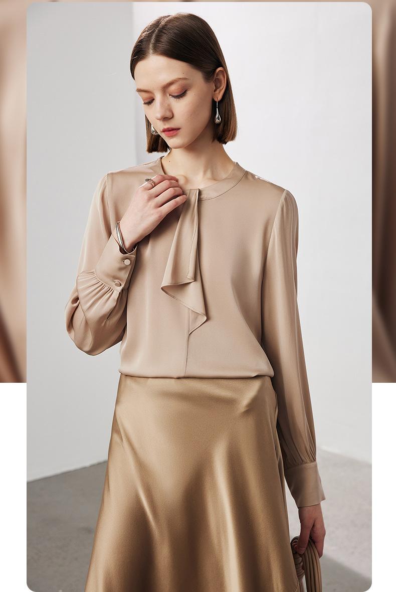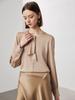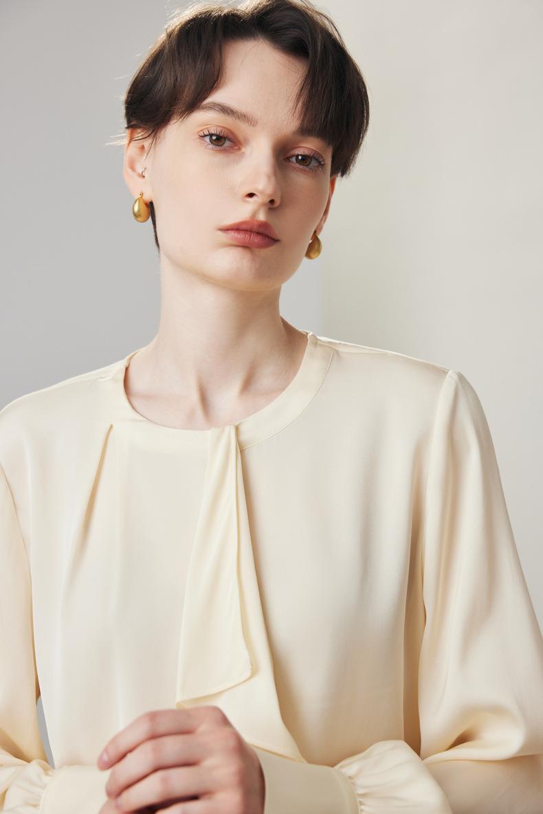 Camisa de seda de manga larga para mujer 2025 primavera y verano nuevo cuello redondo con lazo para ir al trabajo manga larga elástica doble joe seda de morera top