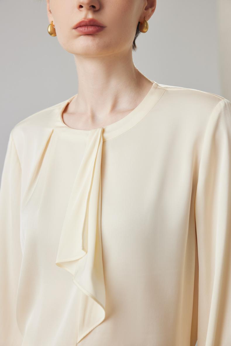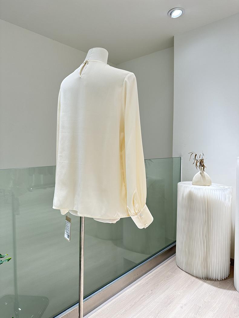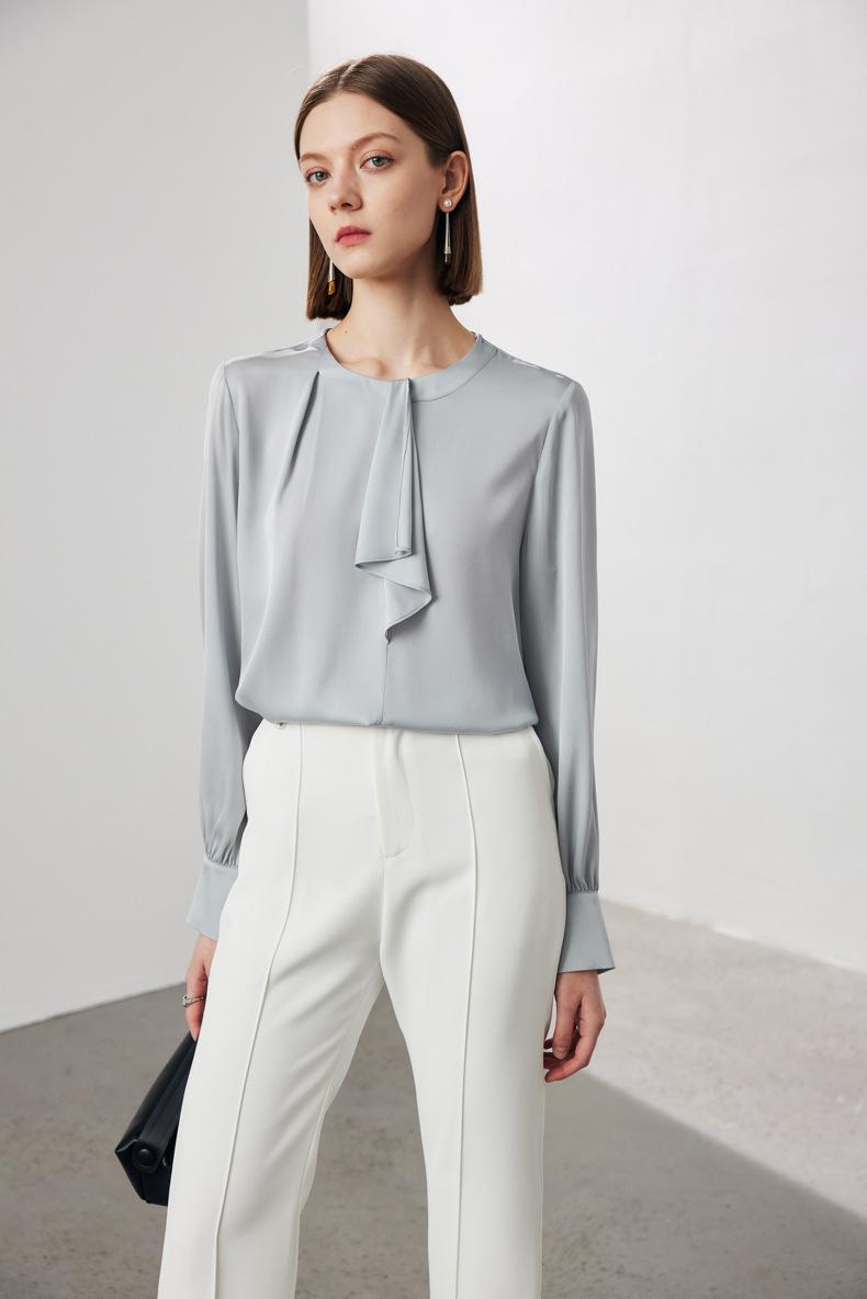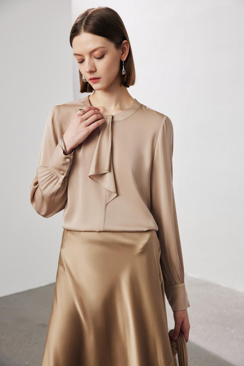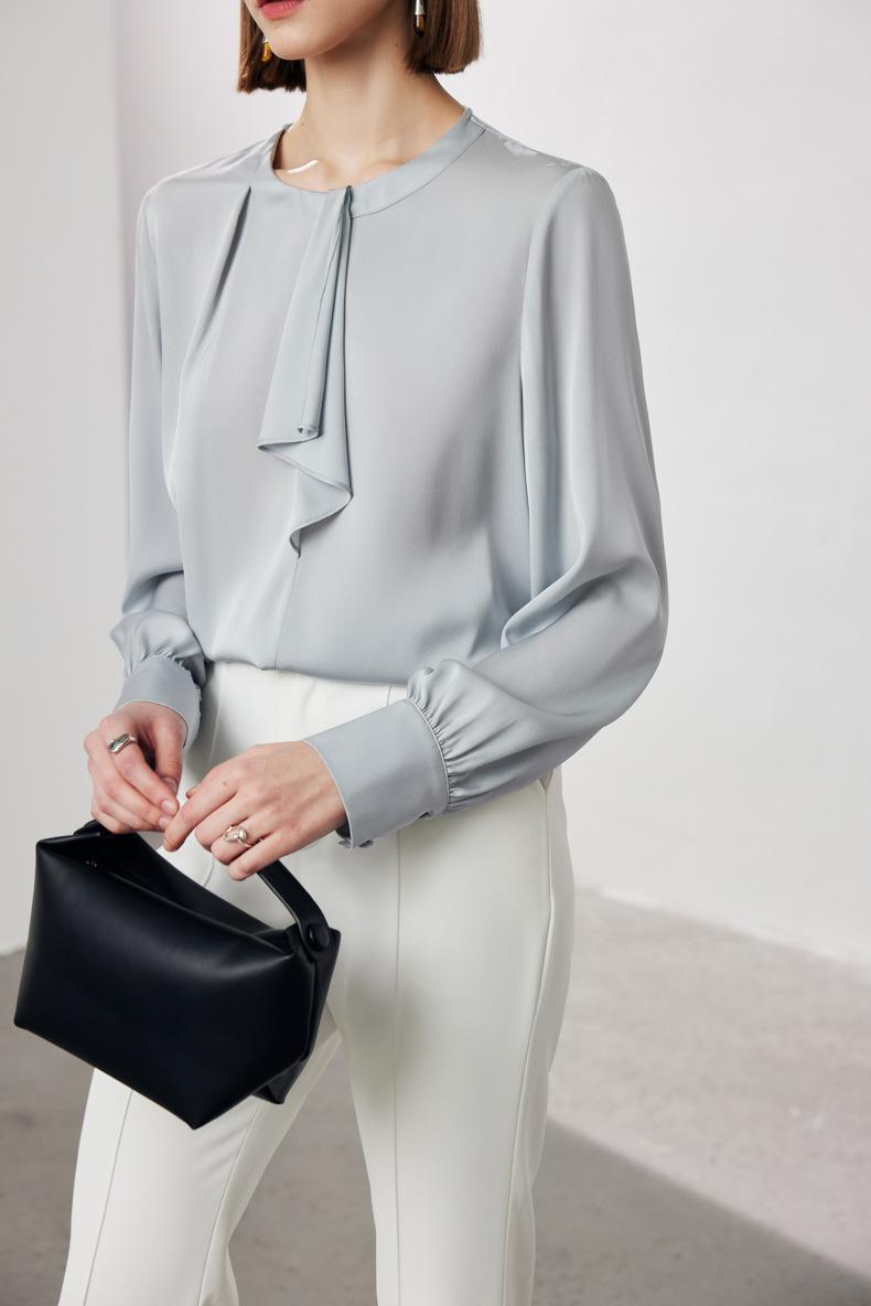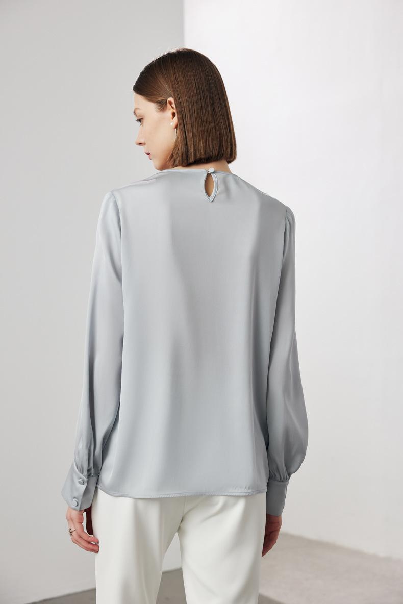 Camisa de seda de manga larga para mujer 2025 primavera y verano nuevo cuello redondo con lazo para ir al trabajo manga larga elástica doble joe seda de morera top