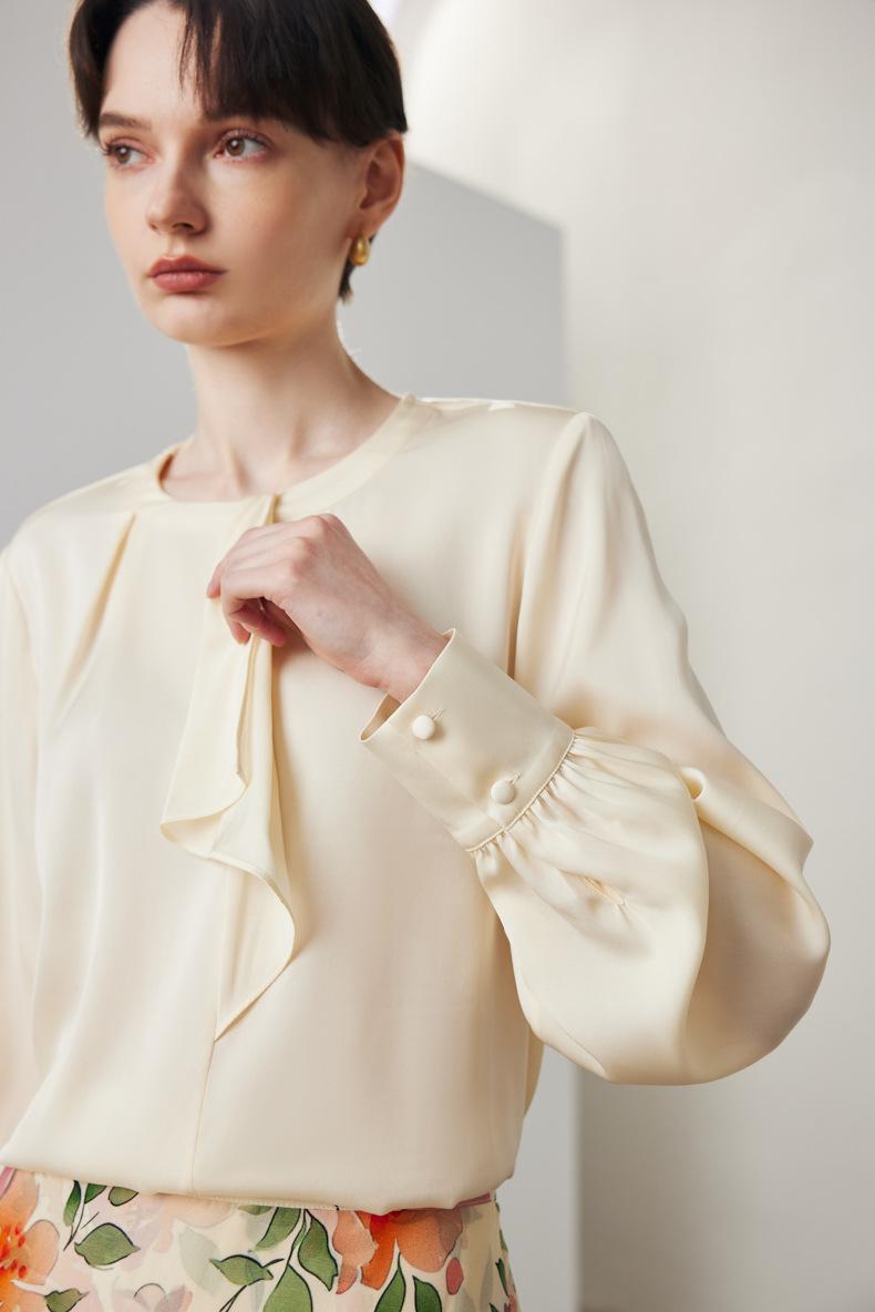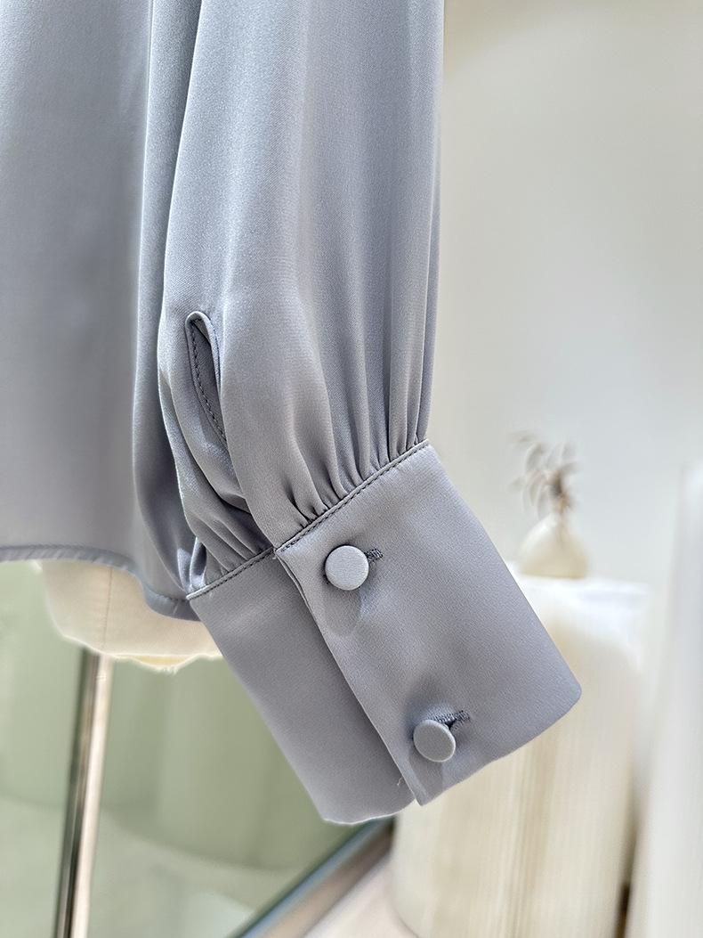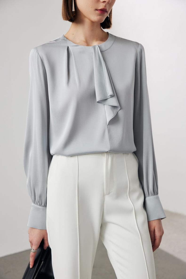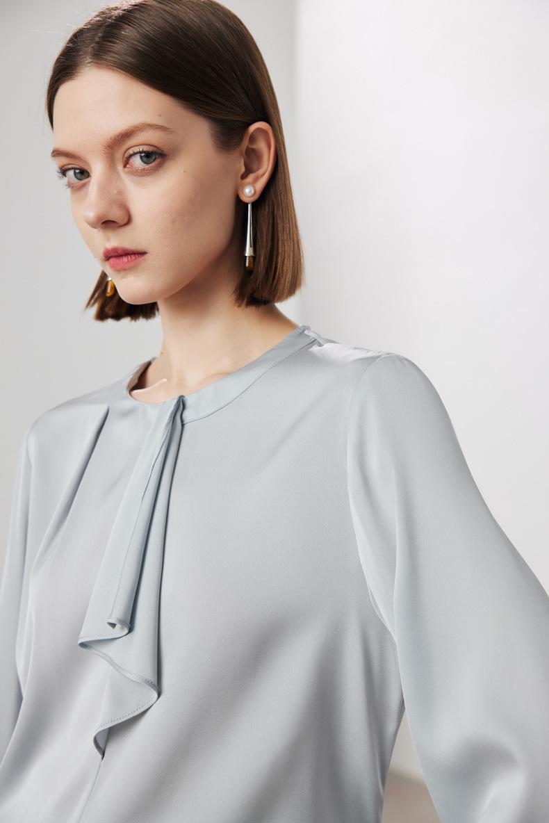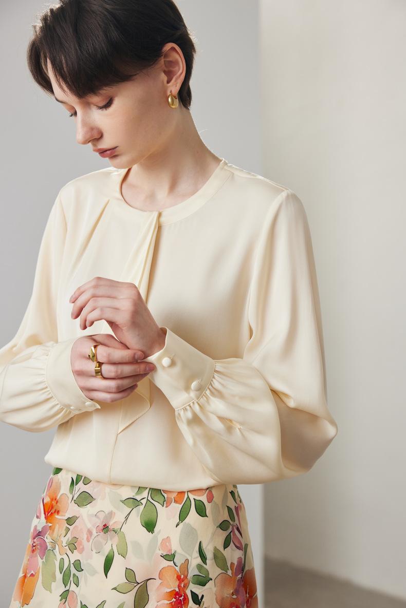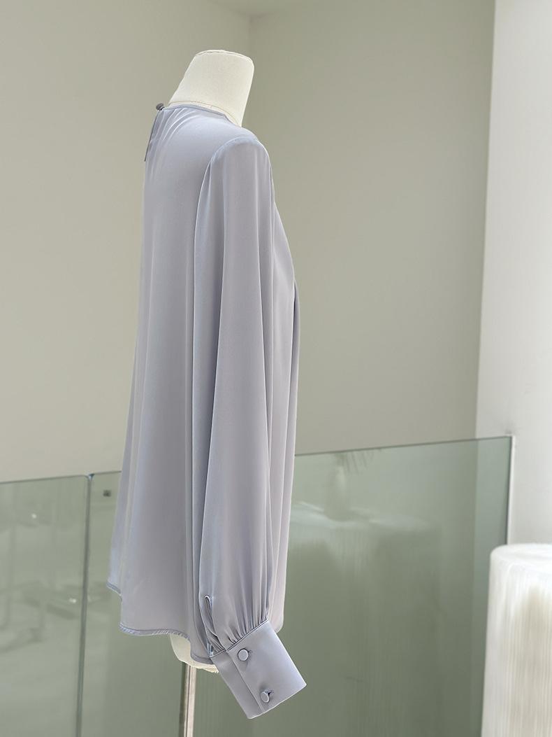 Camisa de seda de manga larga para mujer 2025 primavera y verano nuevo cuello redondo con lazo para ir al trabajo manga larga elástica doble joe seda de morera top