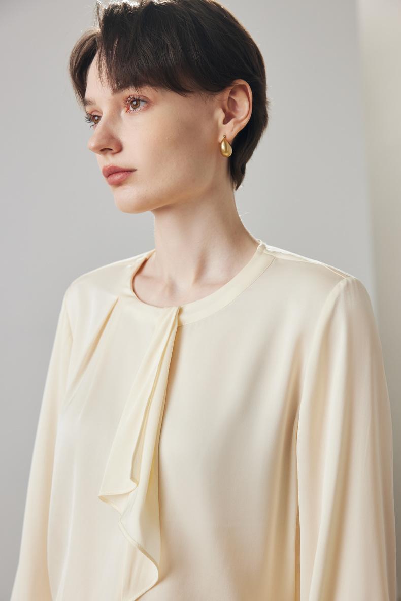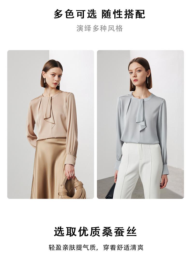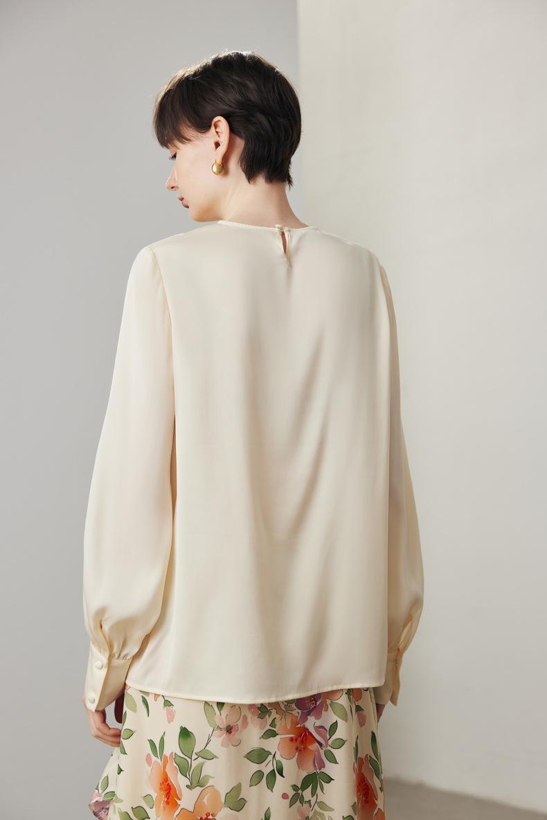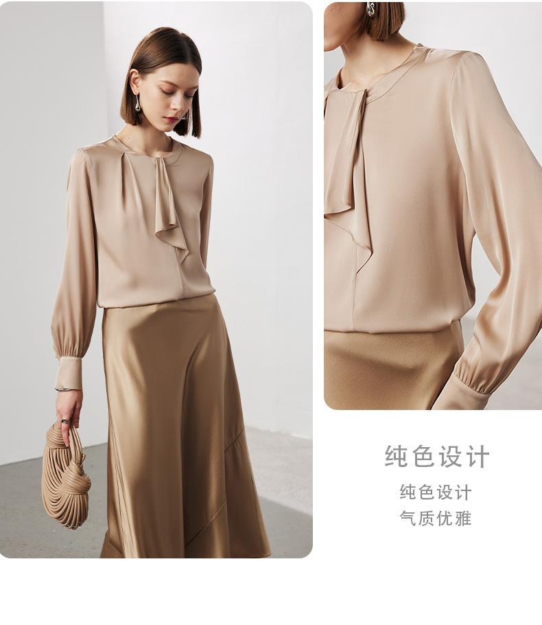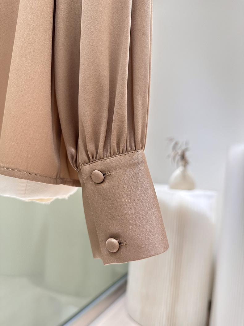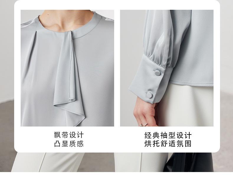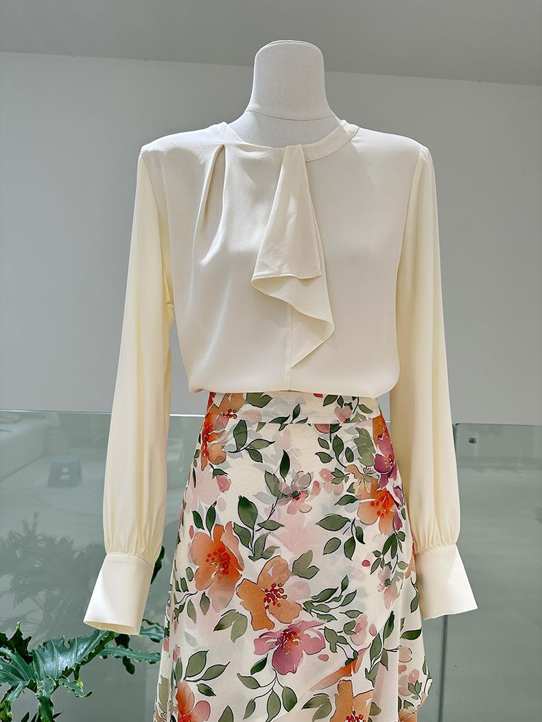 Camisa de seda de manga larga para mujer 2025 primavera y verano nuevo cuello redondo con lazo para ir al trabajo manga larga elástica doble joe seda de morera top