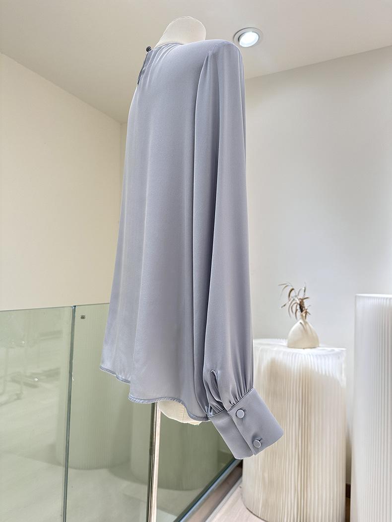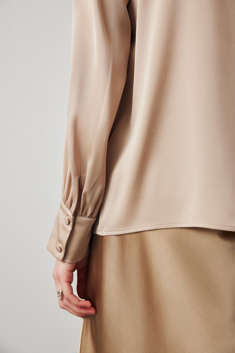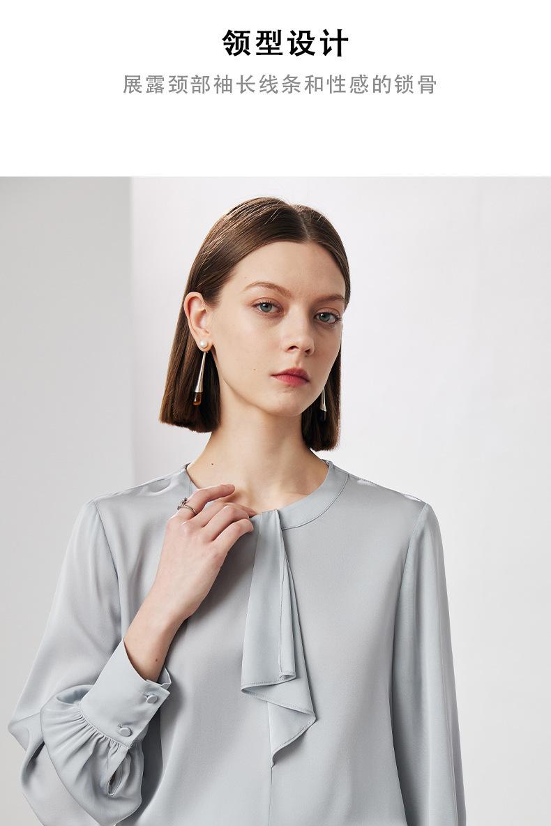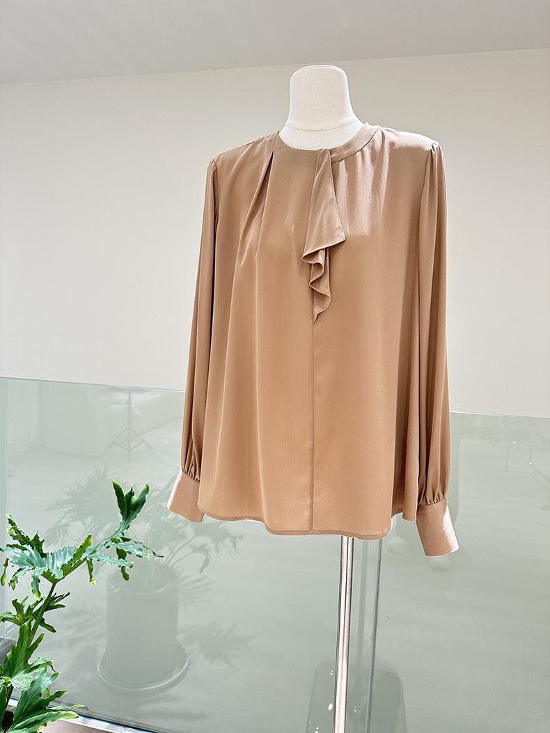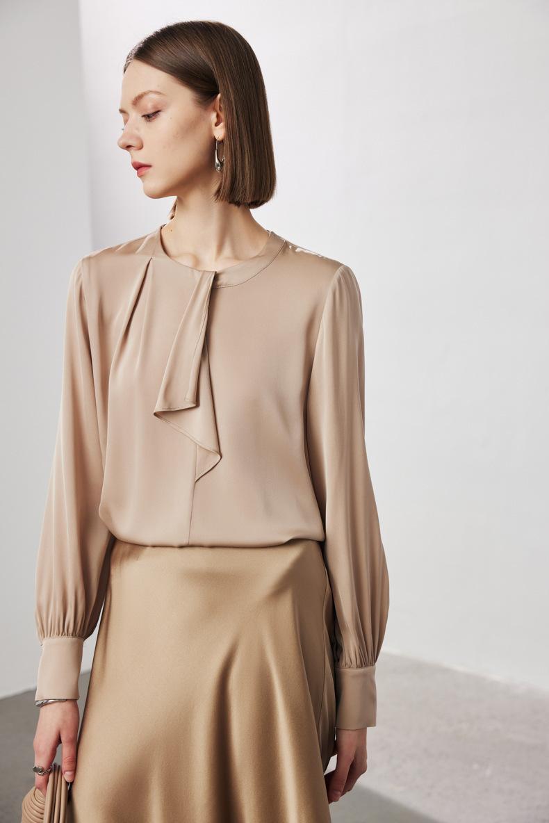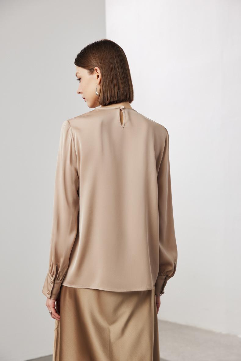 Camisa de seda de manga larga para mujer 2025 primavera y verano nuevo cuello redondo con lazo para ir al trabajo manga larga elástica doble joe seda de morera top
