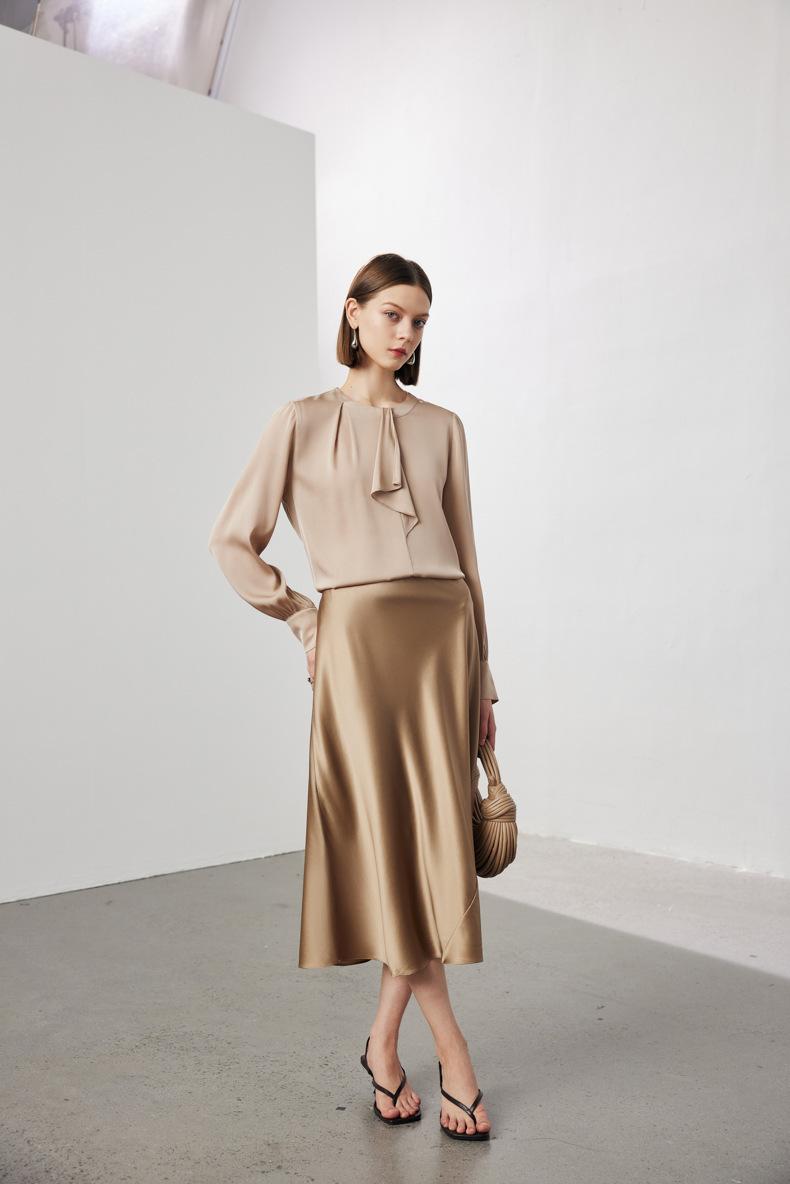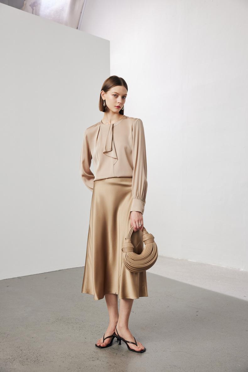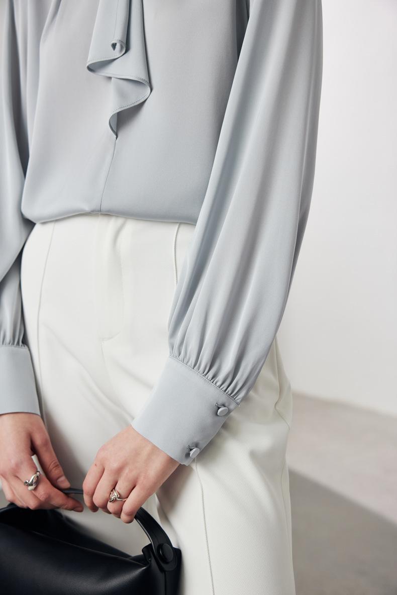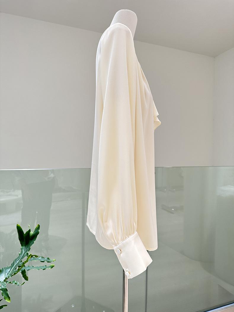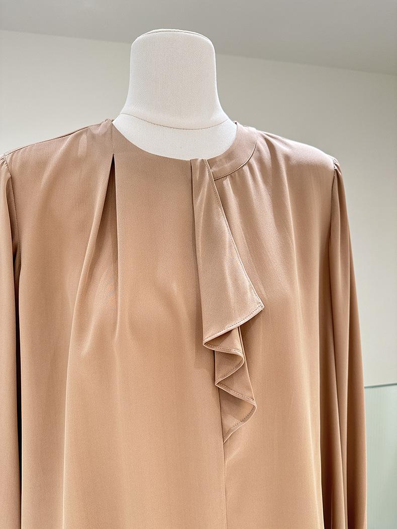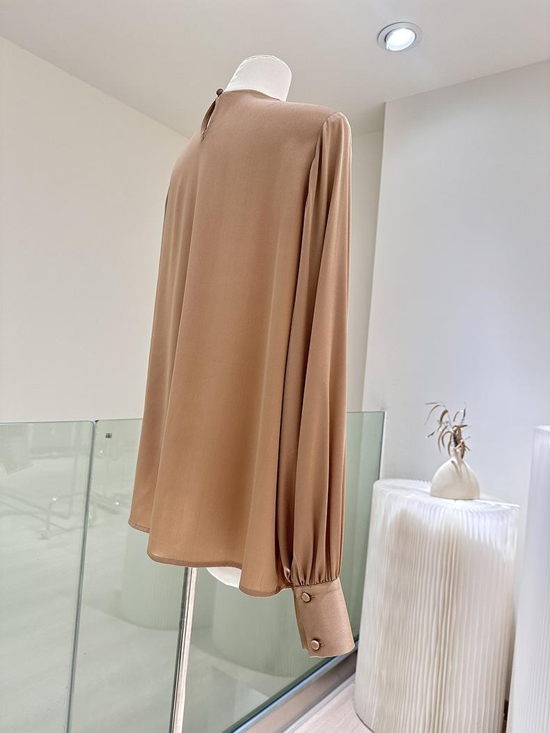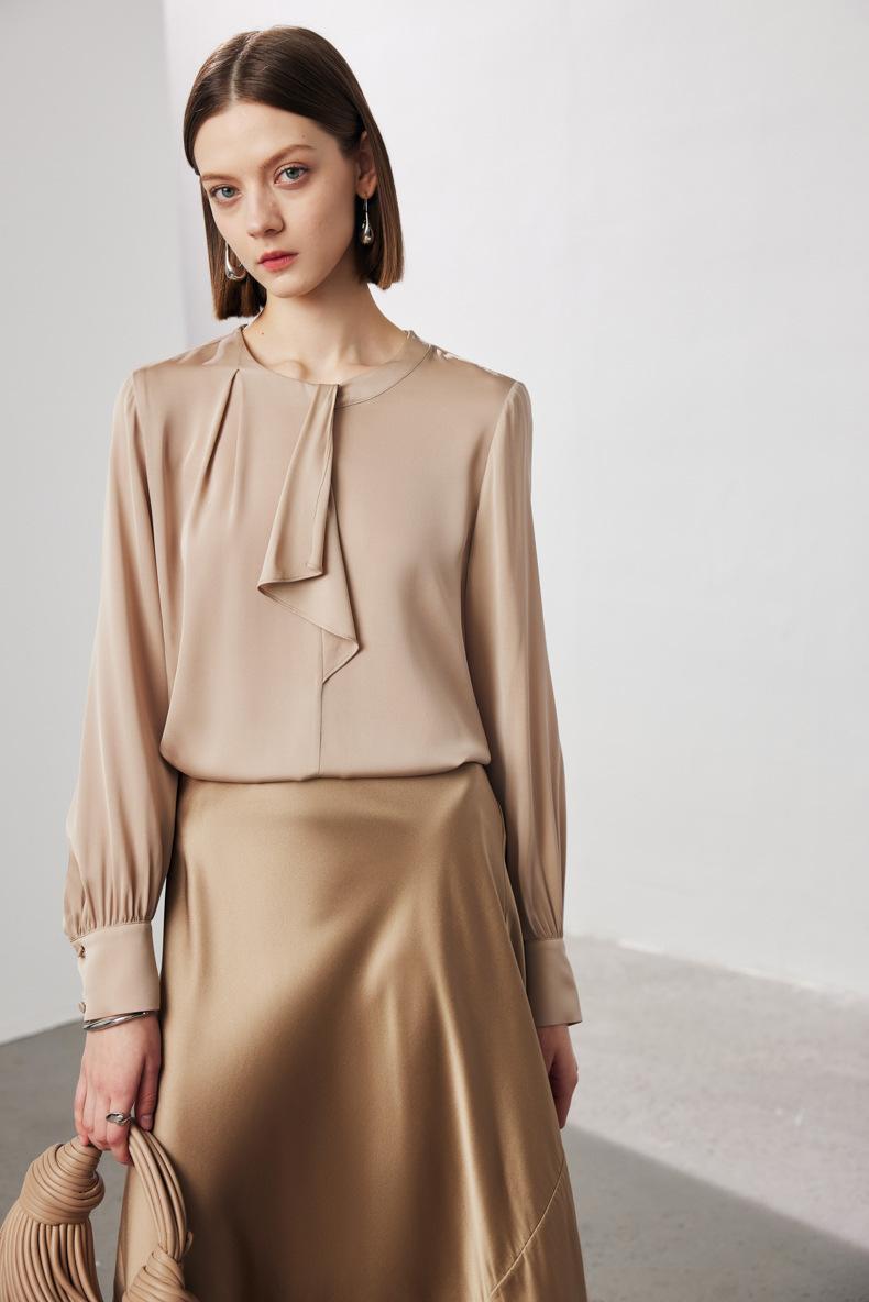 Camisa de seda de manga larga para mujer 2025 primavera y verano nuevo cuello redondo con lazo para ir al trabajo manga larga elástica doble joe seda de morera top