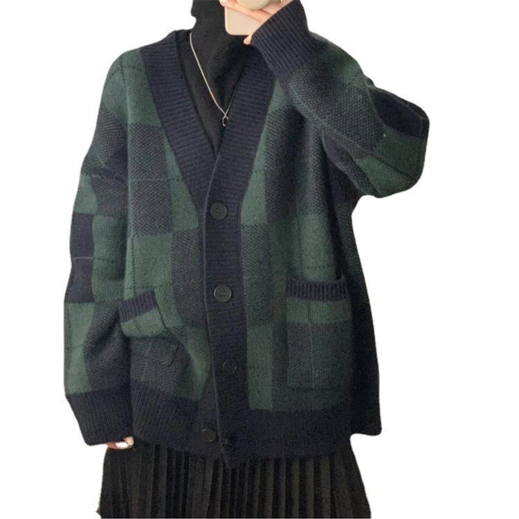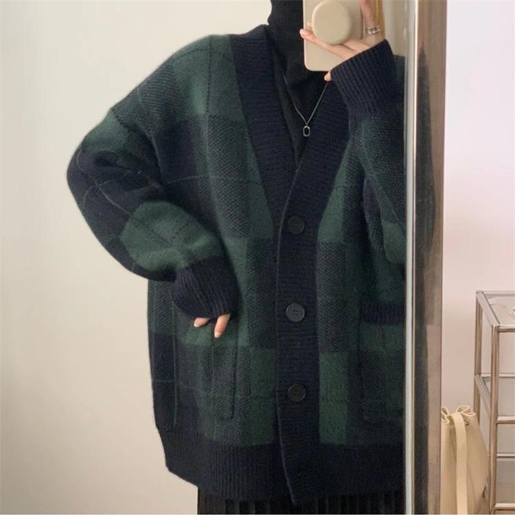 Chaqueta de punto a cuadros para mujer, suéter retro ajustado con cuello en V, holgada, con doble bolsillo, a la moda, otoño e invierno de 2024