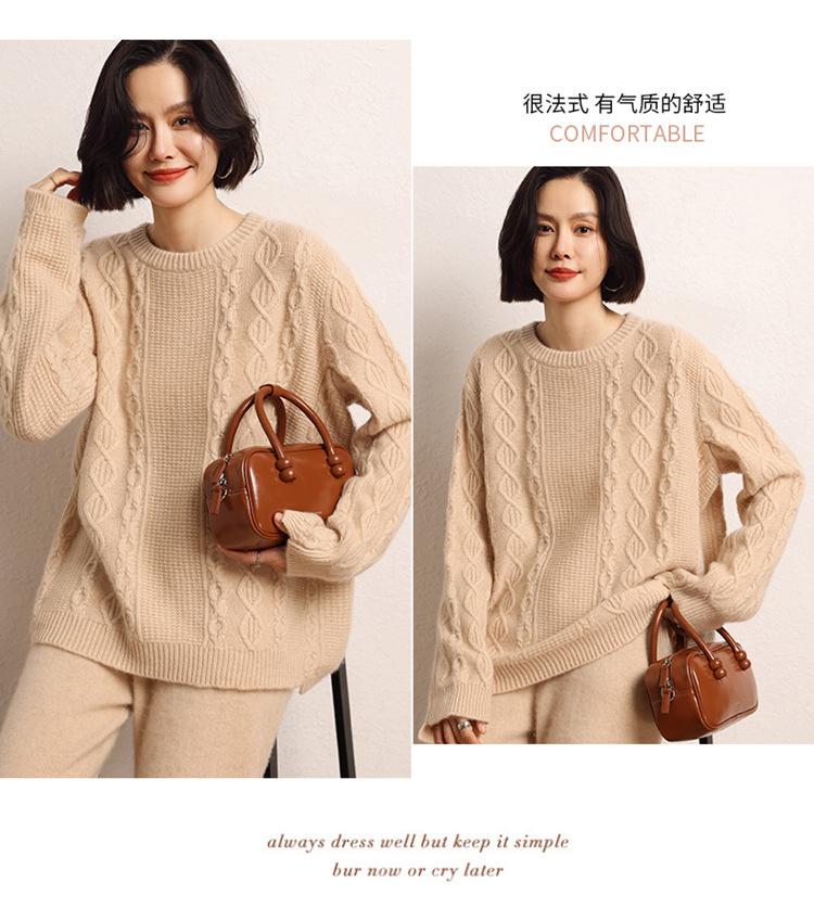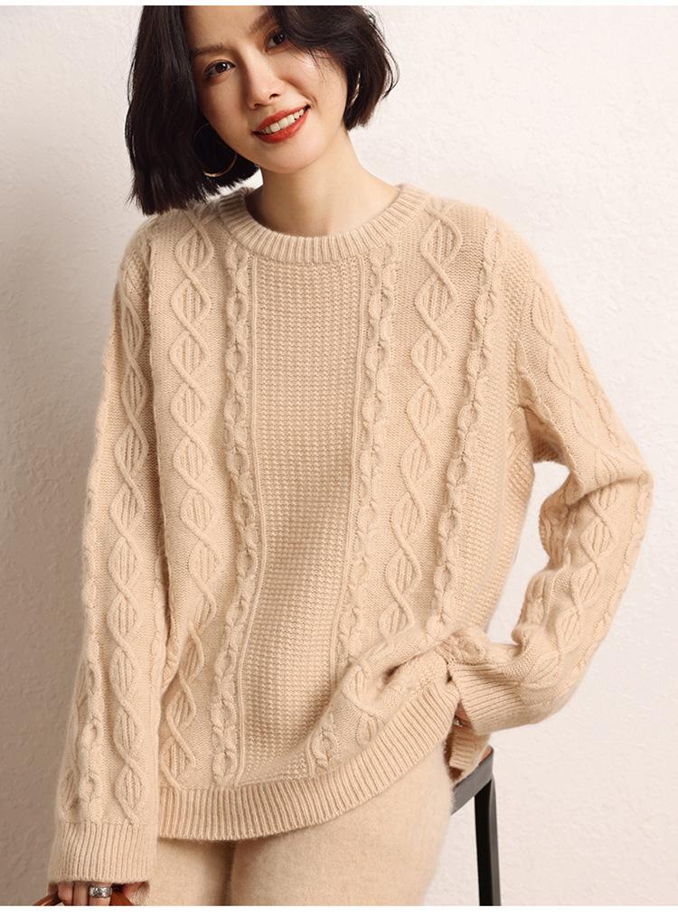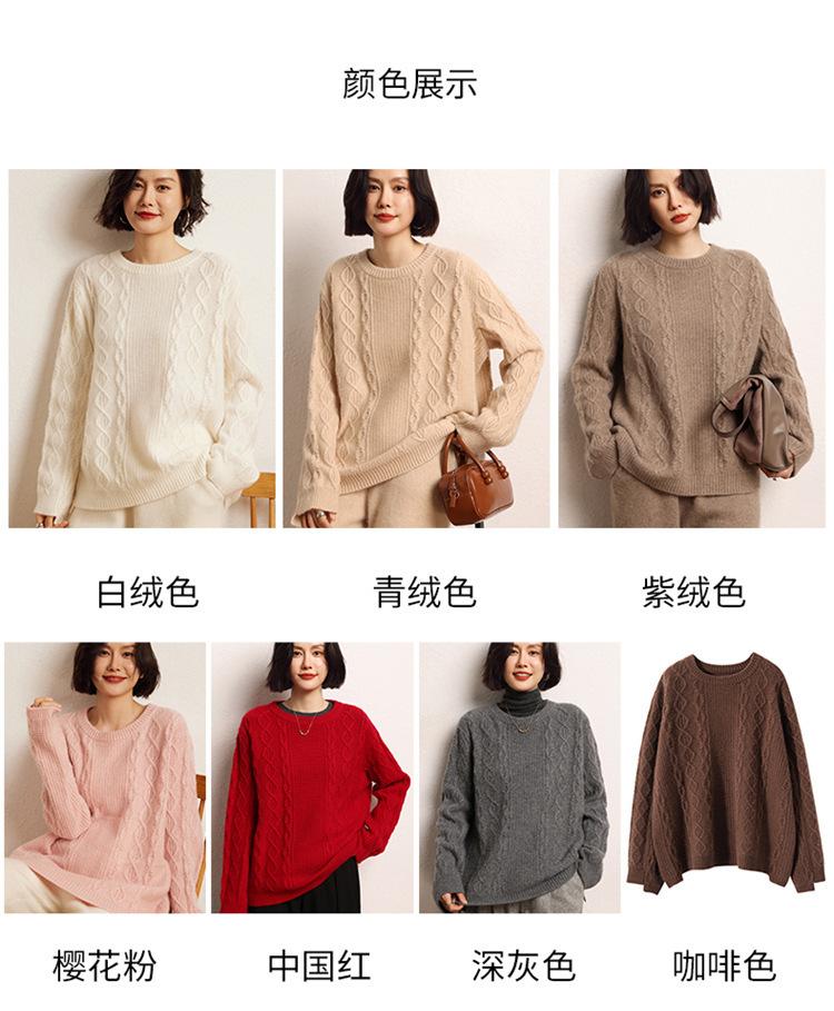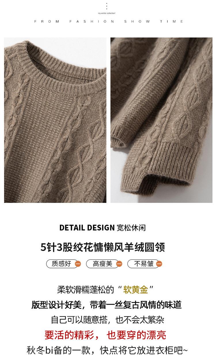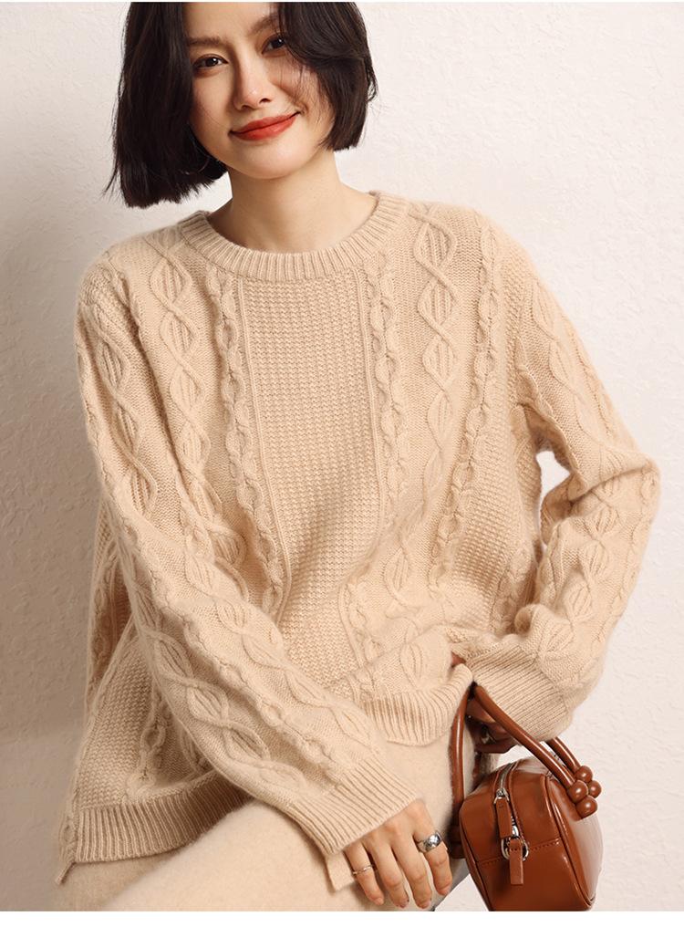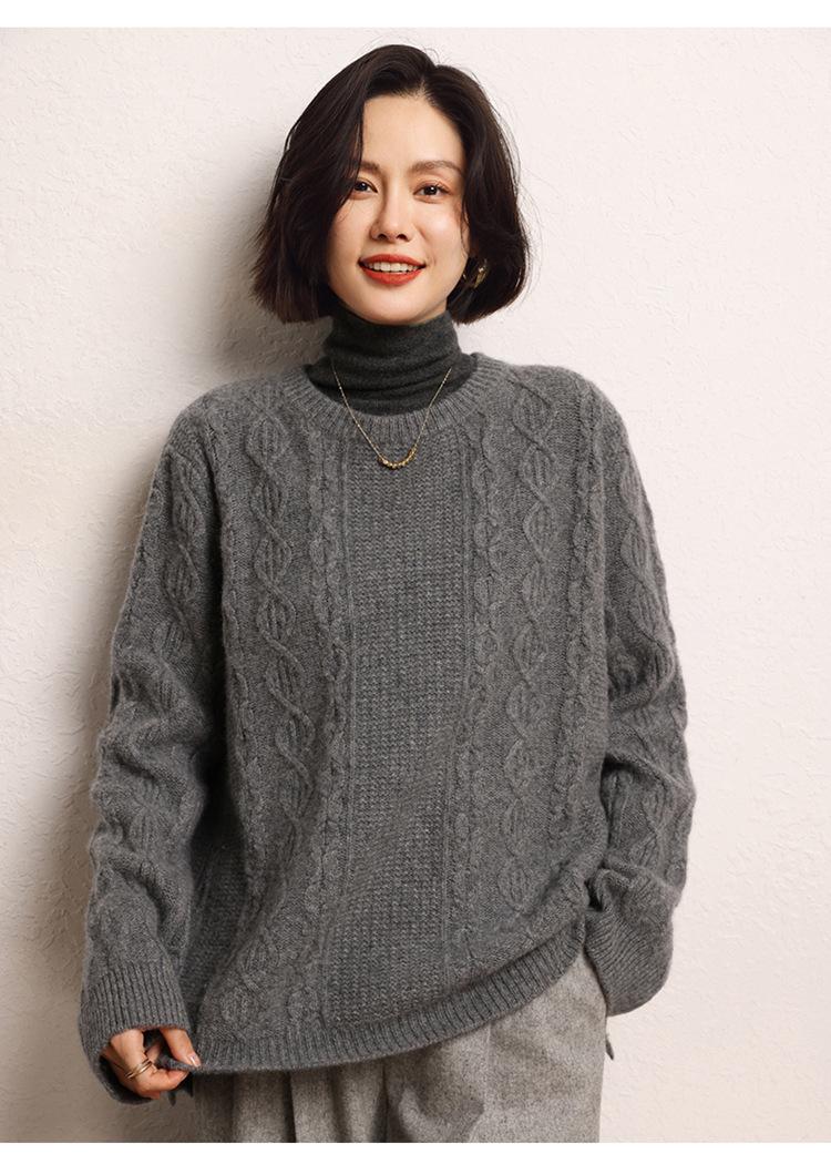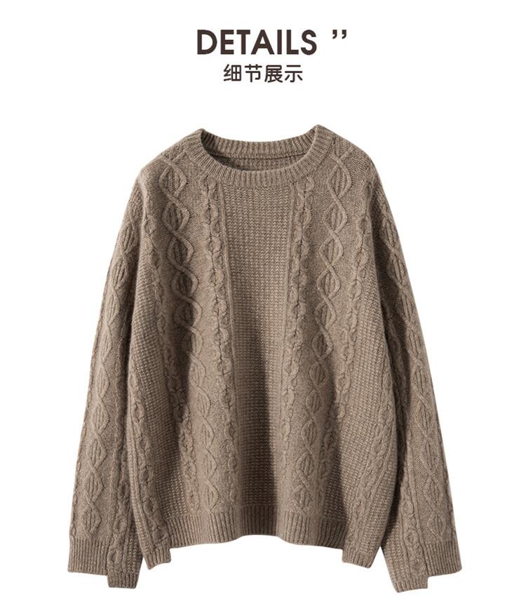 Cachemira 2025 Otoño e Invierno Nuevo Suéter de Punto de Fondo de Cable de Cuerpo Entero Estilo Holgazán Engrosado de Cuello Redondo Corto Suelto para Mujer
