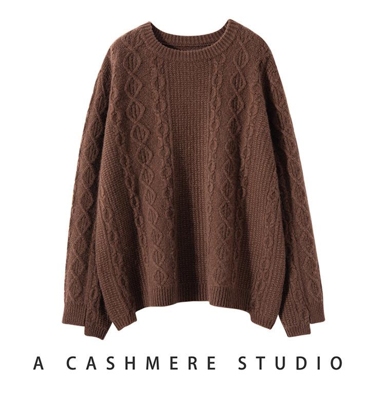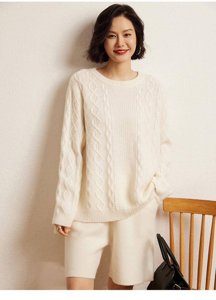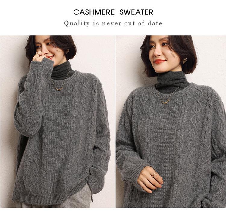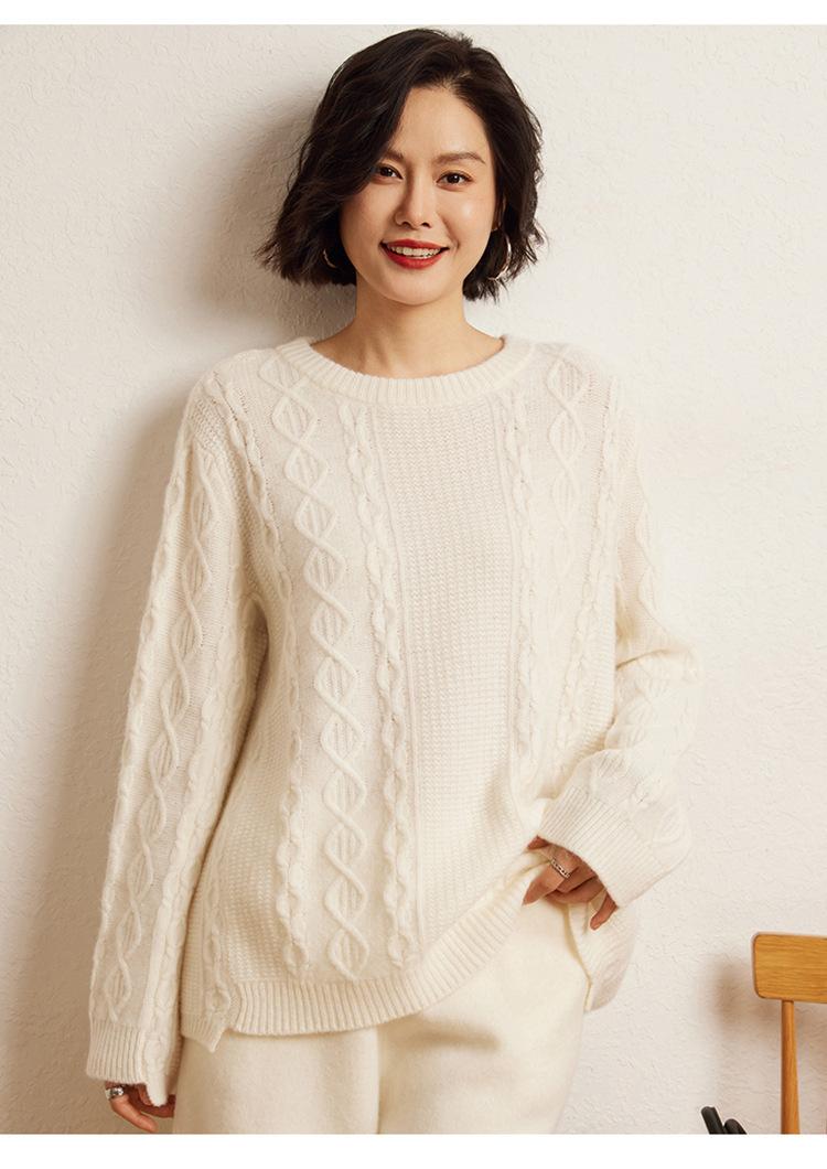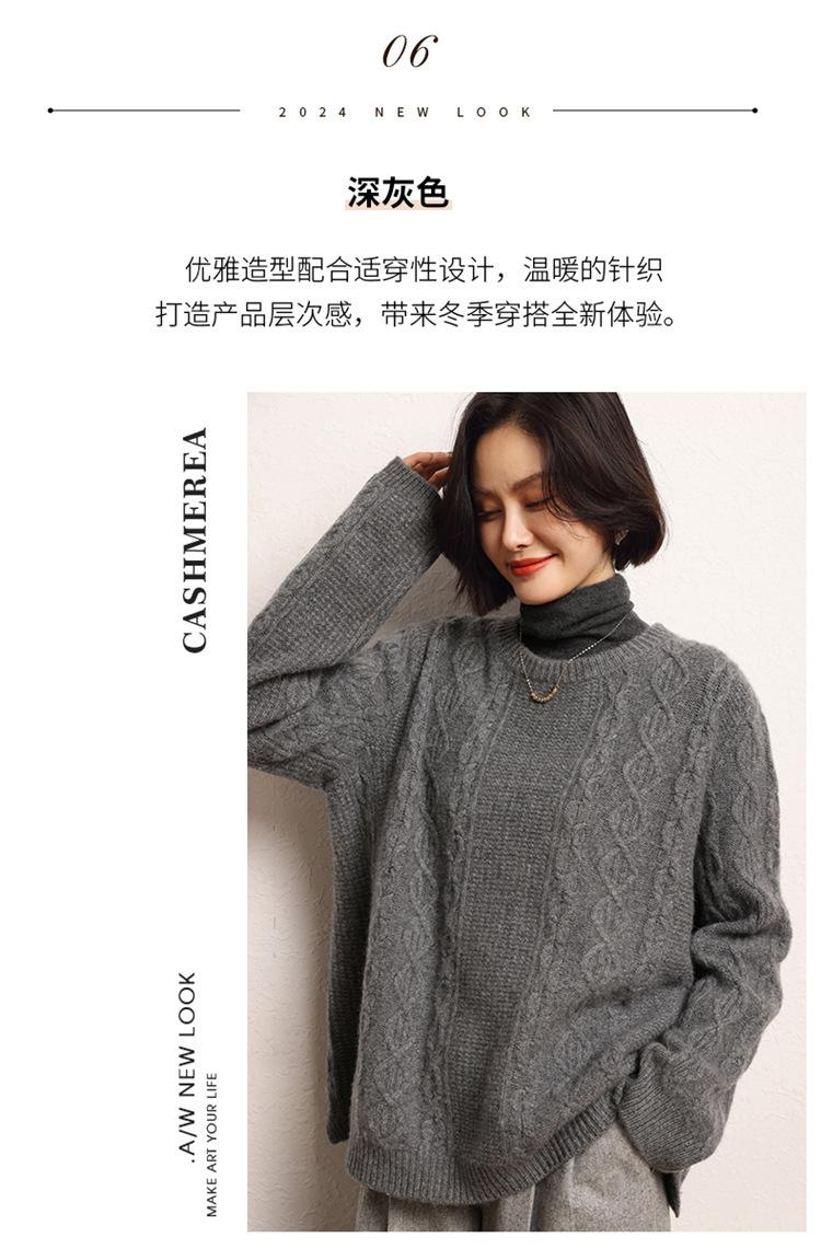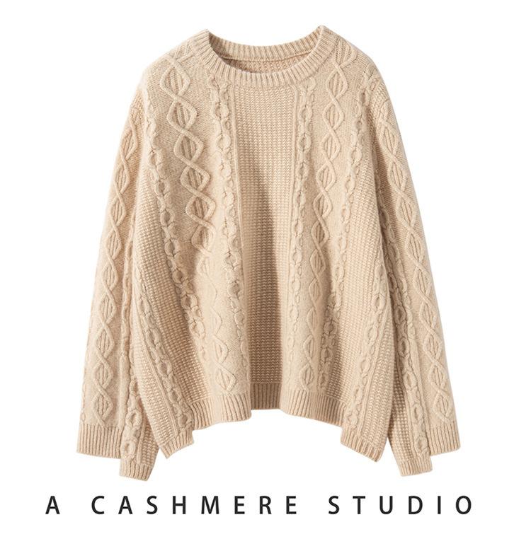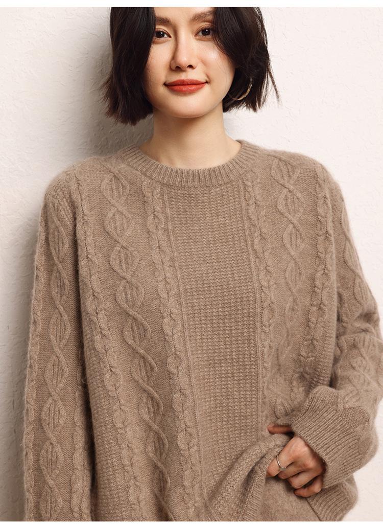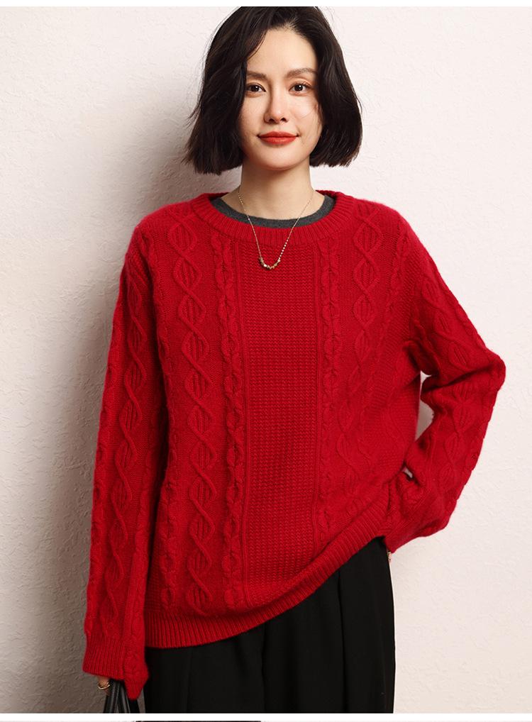 Cachemira 2025 Otoño e Invierno Nuevo Suéter de Punto de Fondo de Cable de Cuerpo Entero Estilo Holgazán Engrosado de Cuello Redondo Corto Suelto para Mujer