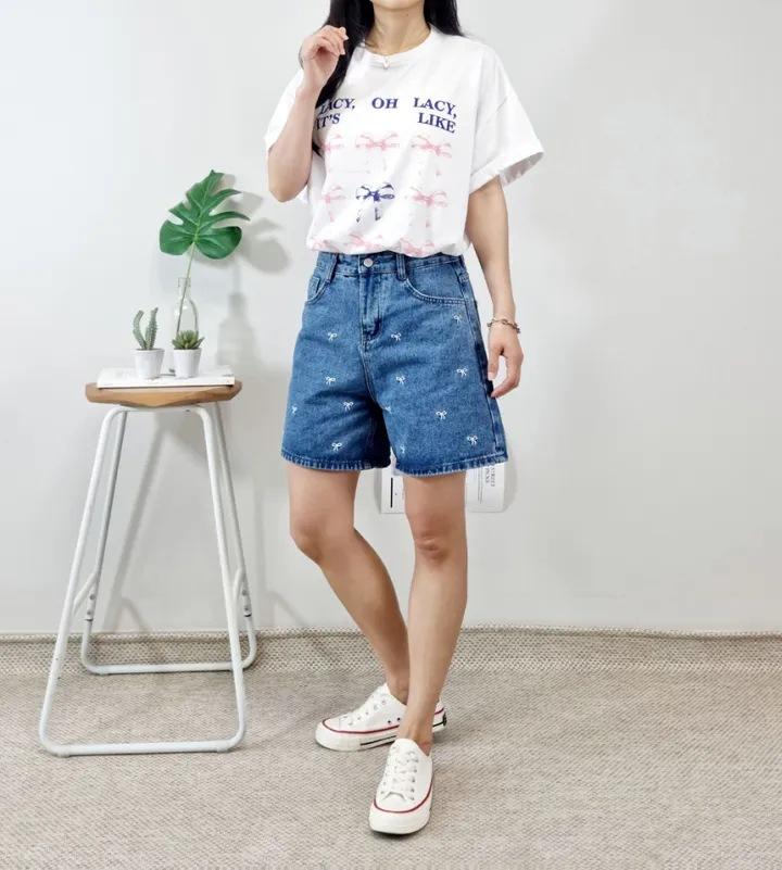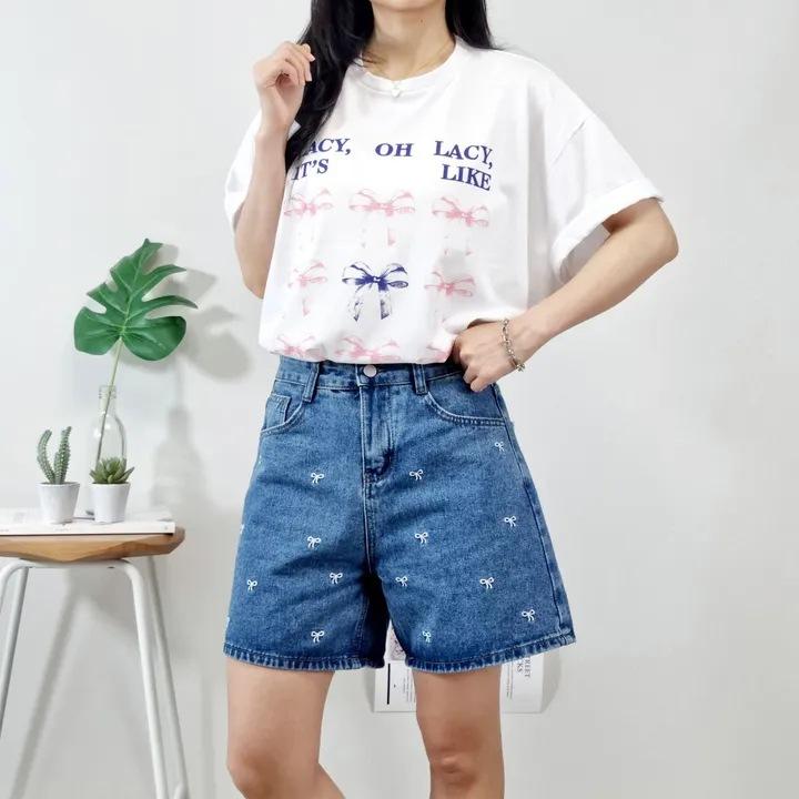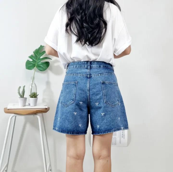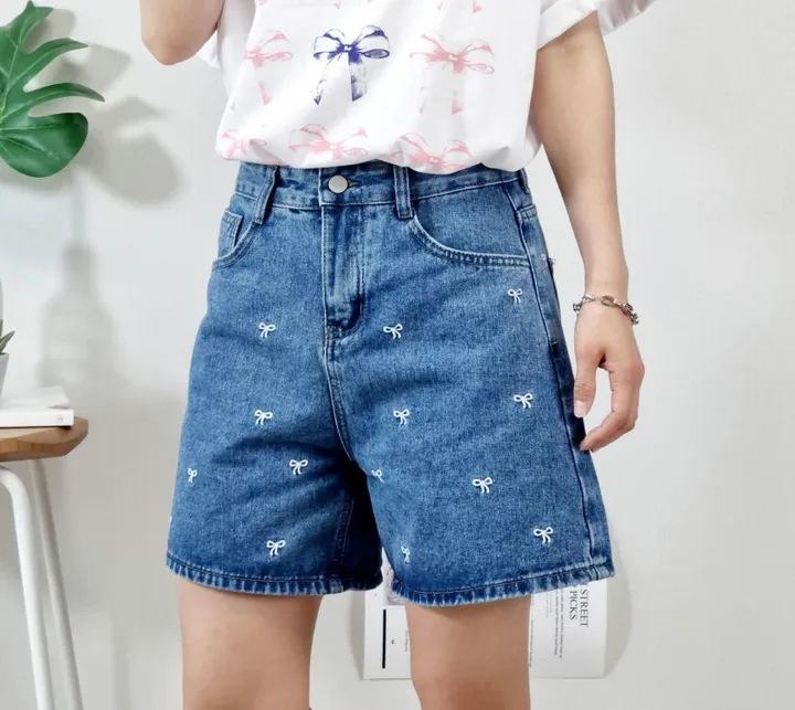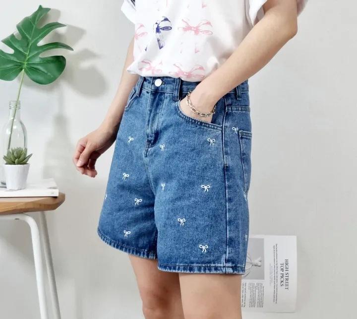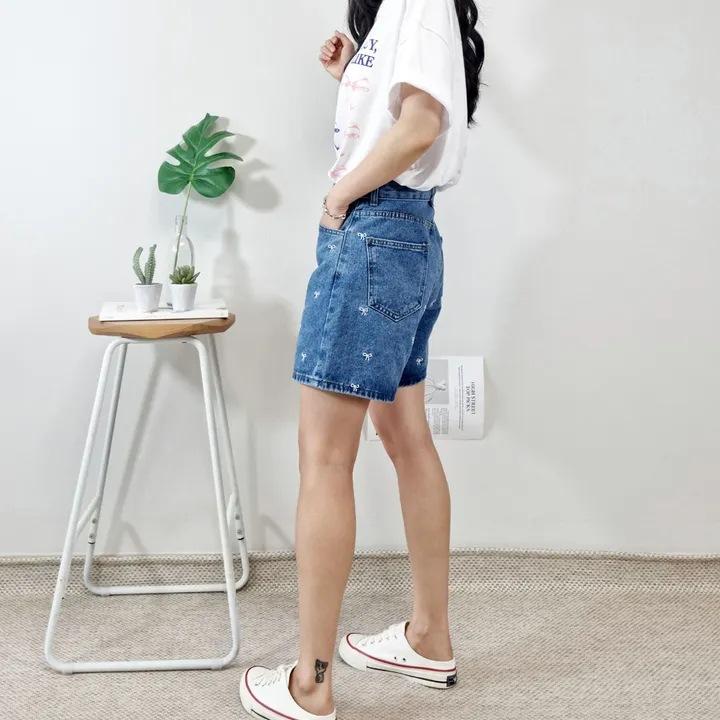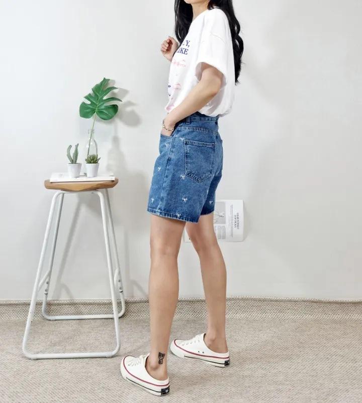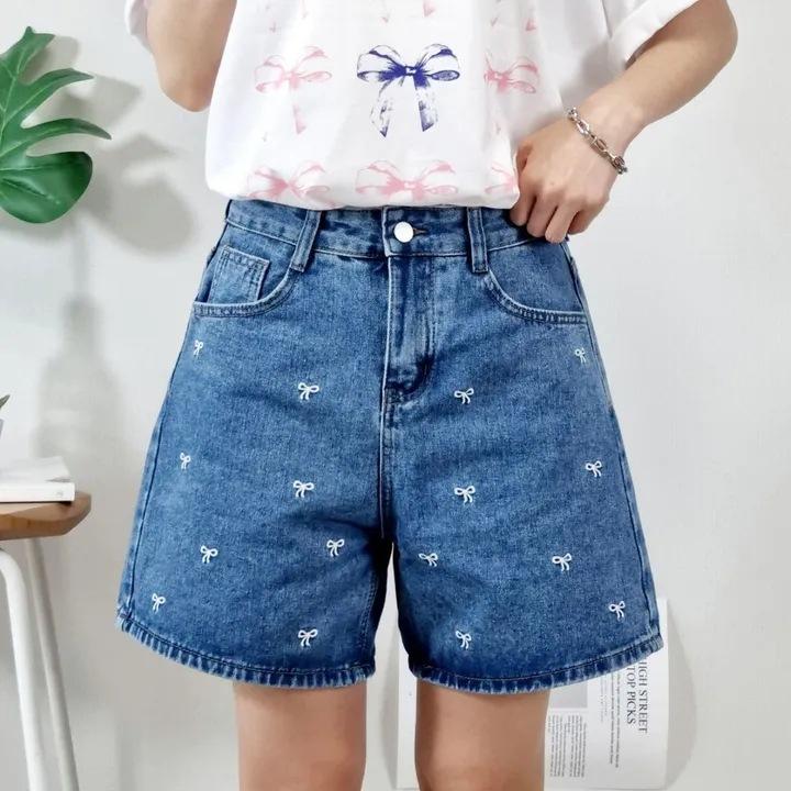 Shorts de Mezclilla Casuales Simples de Verano para Mujer Coreana Dongdaemun de Alta Calidad Bordados con Lazo